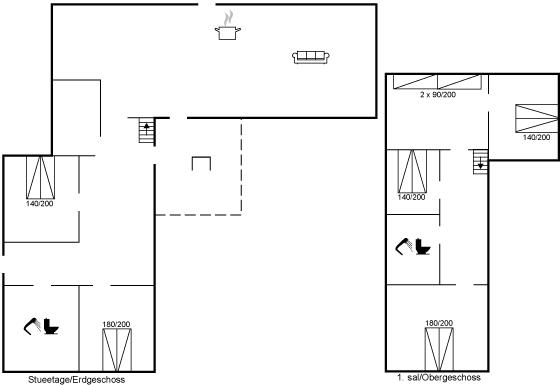Der er i alt 6 soveværelser. Sovepladserne fordeler sig på: 10 sovepladser i dobbeltsenge. 2 sovepladser i enkeltsenge.