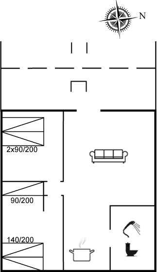 Indvendigt er der hvidmalede stenvægge, hvidmalede lofter samt flotte klinkegulve. Badeværelse med bruser og badekar. Køkkenafdelingen er indrettet med bl.a. opvaskemaskine, mikrobølgeovn, varmluftovn og komfur med keramiske kogeplader. Opholdsstuen er bl.a. indrettet med TV tilsluttet fællesantenne, DVD-afspiller og stereoanlæg med CD-afspiller. Sovepladserne fordeler sig på 2 værelser; 1 med dobbeltseng og 1 med dobbeltseng samt 1 enkeltseng (alle med boksmadrasser). Høj barnestol til rådighed.
