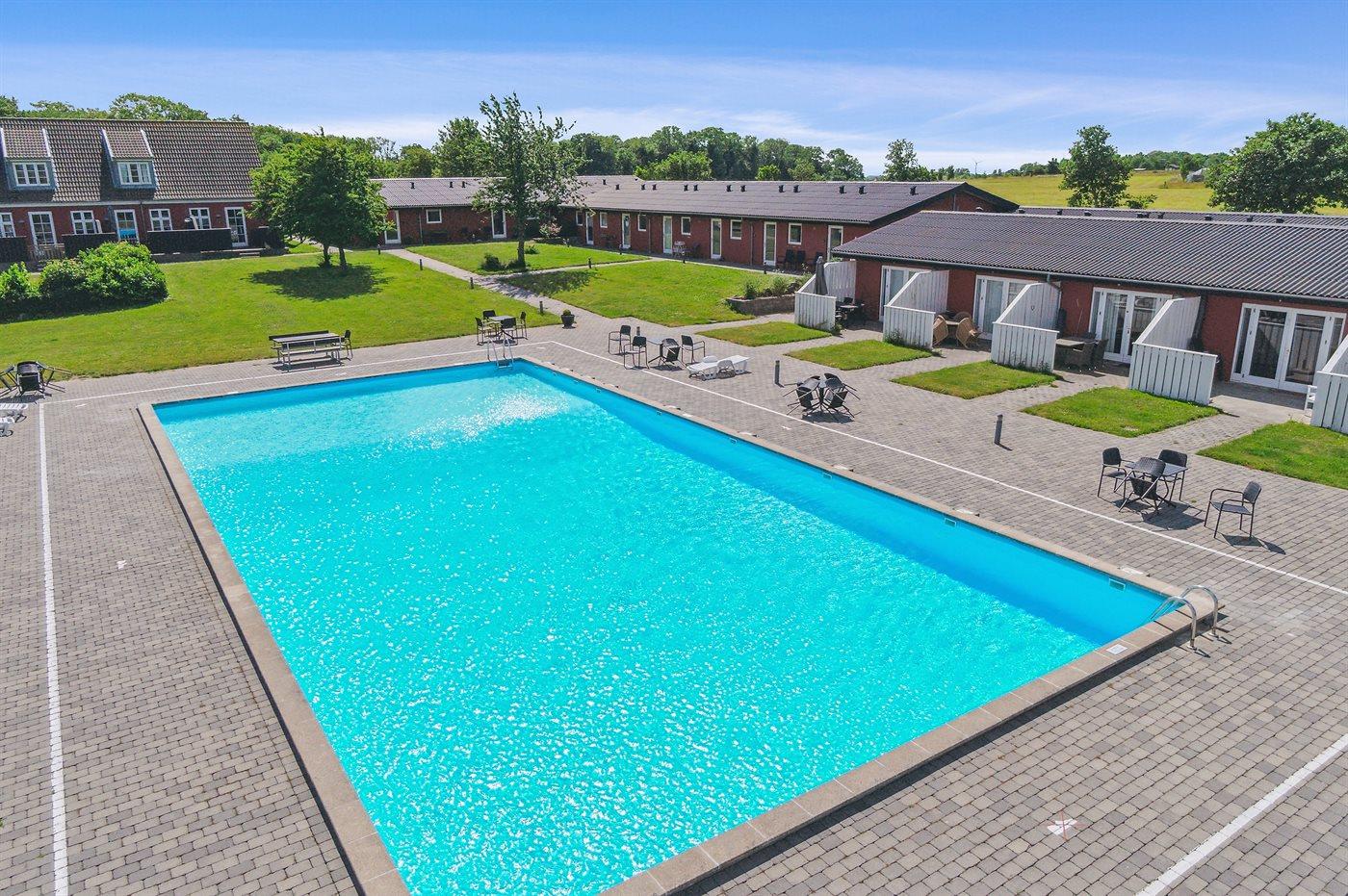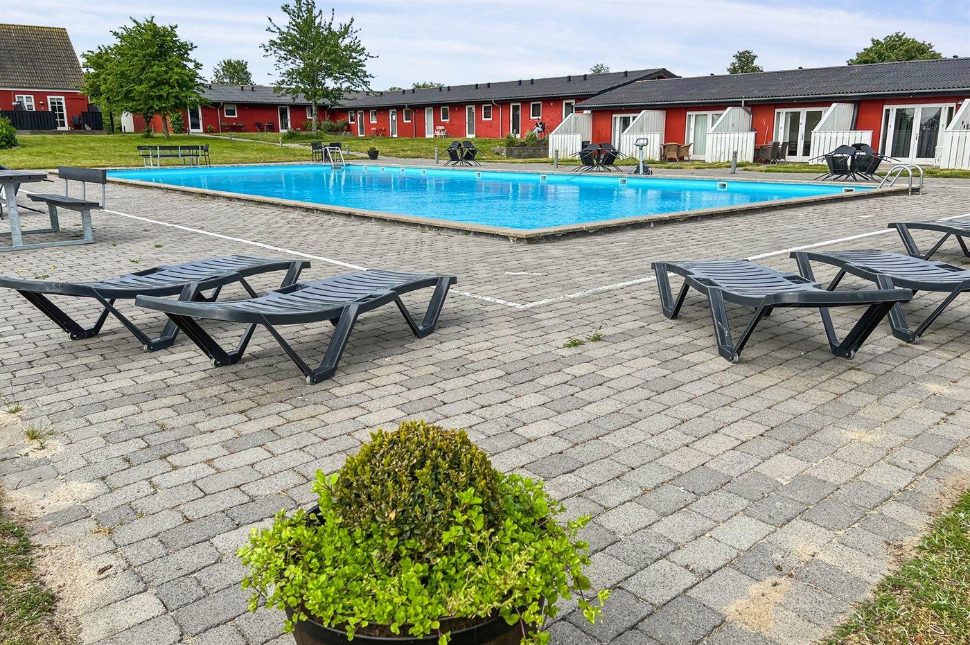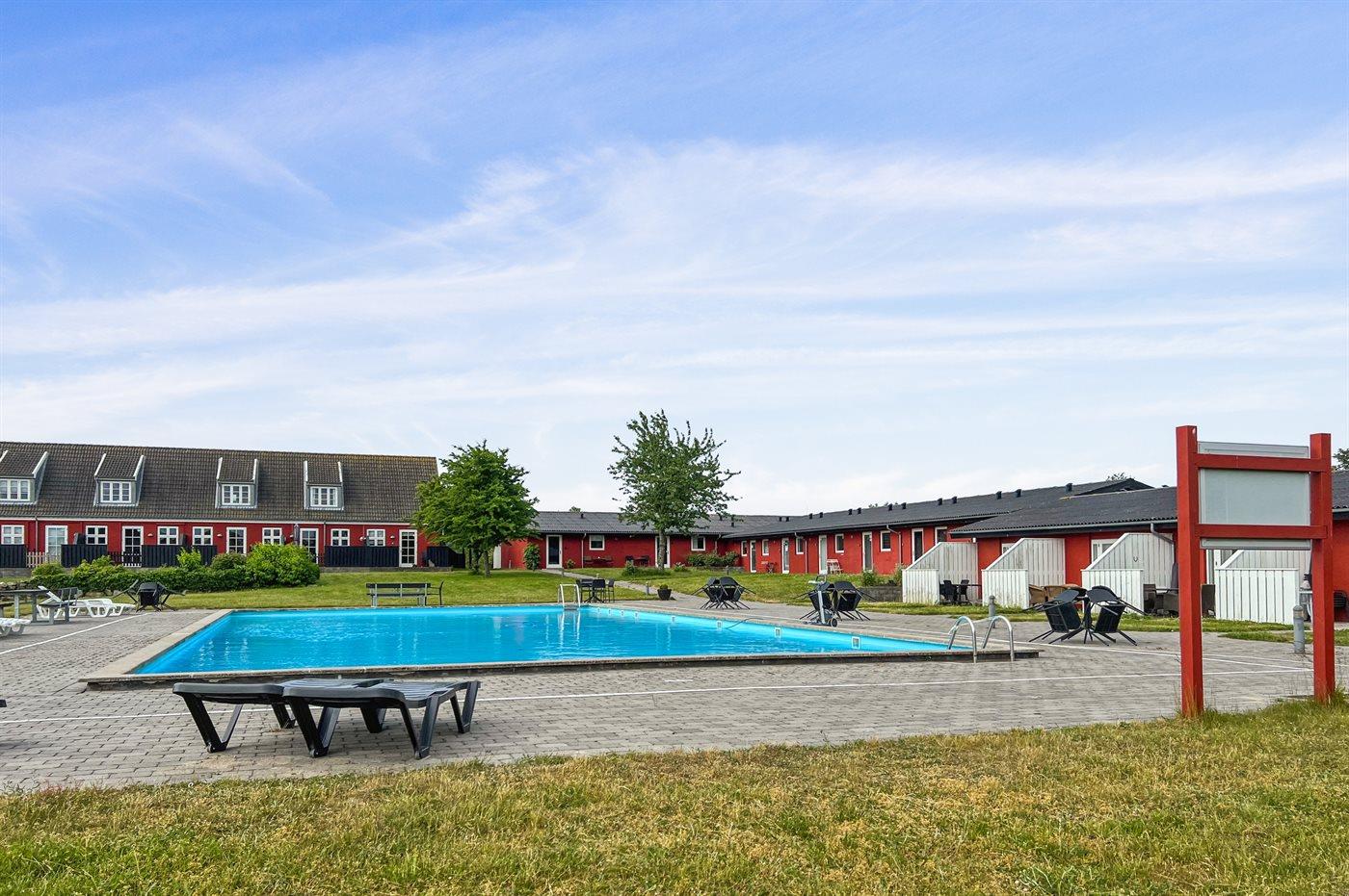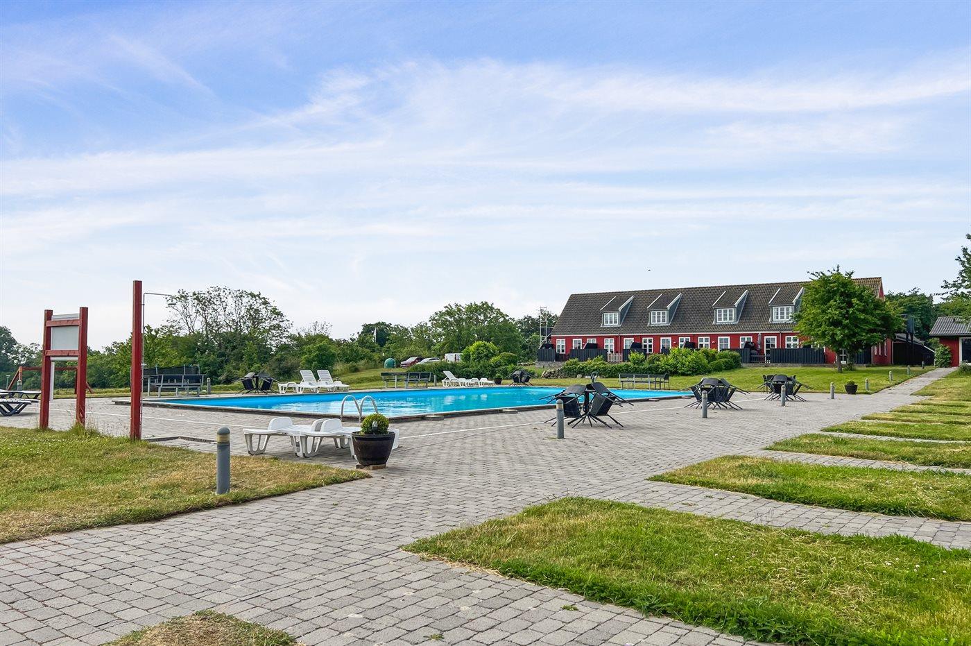 Foran ferielejligheden er der en lille fliseterrasse, så man kan følge livet i fællespoolen, der nok kan friste til en badetur. Poolen er opvarmet fra den 15.6 - 15.9. Til fælles afbenyttelse er der i Dams på Bakken petanquebane, trampolin, fodboldmål og et lille bålsted.