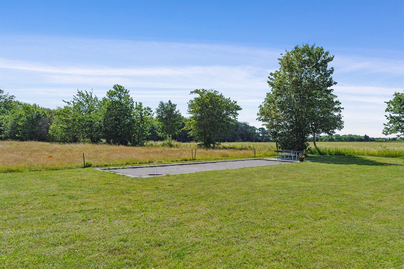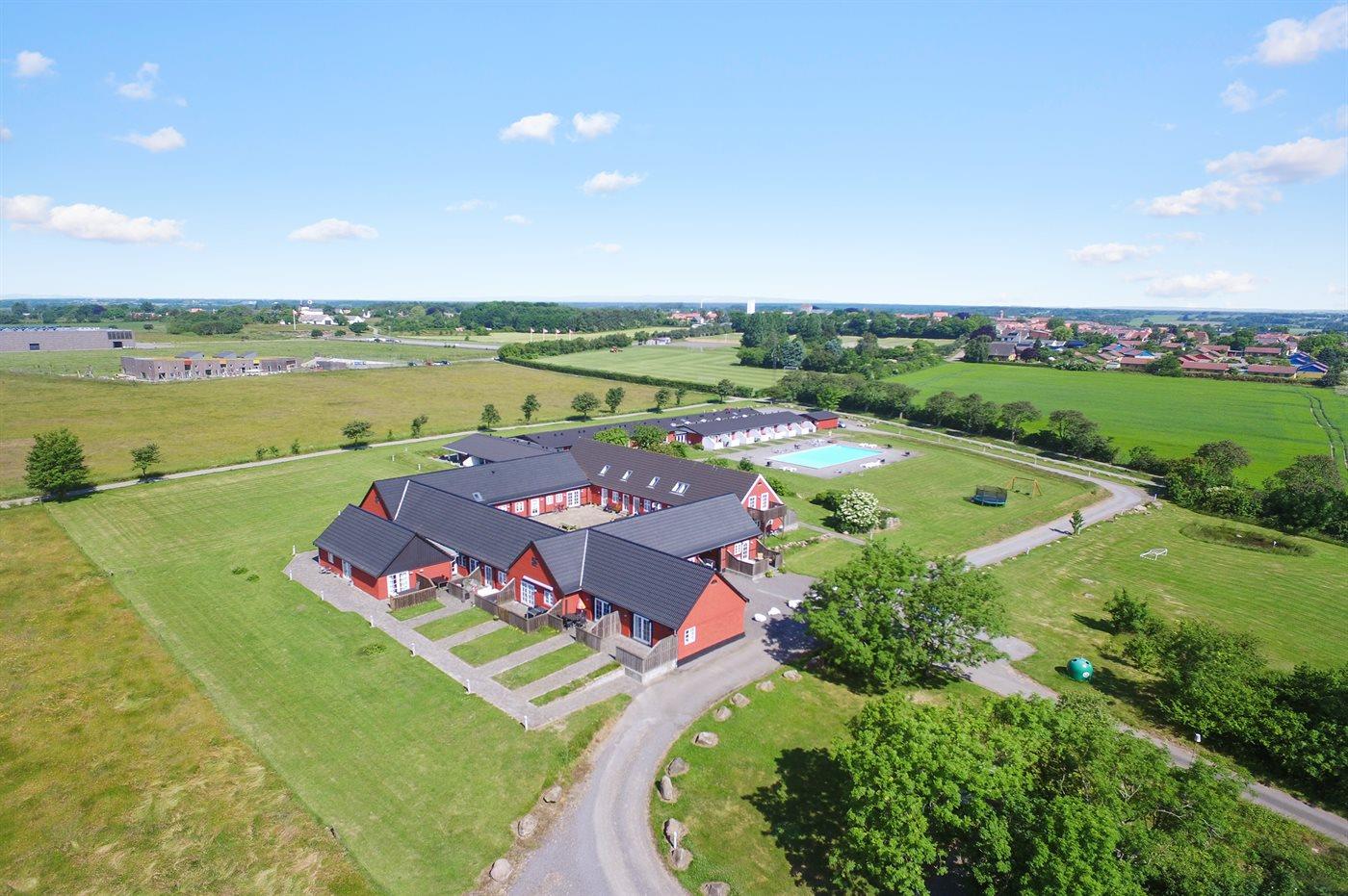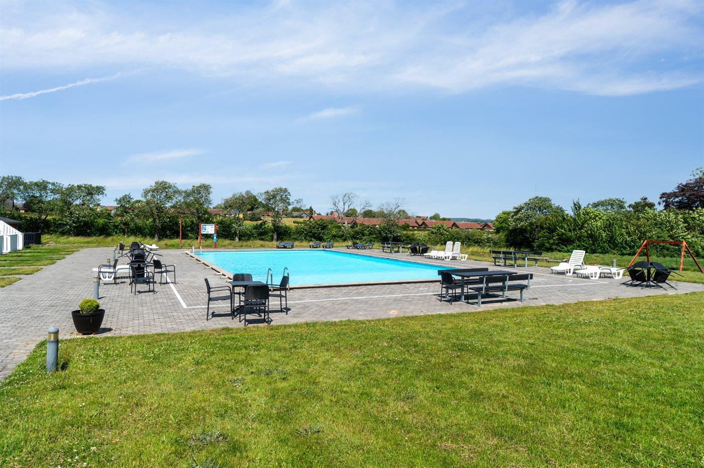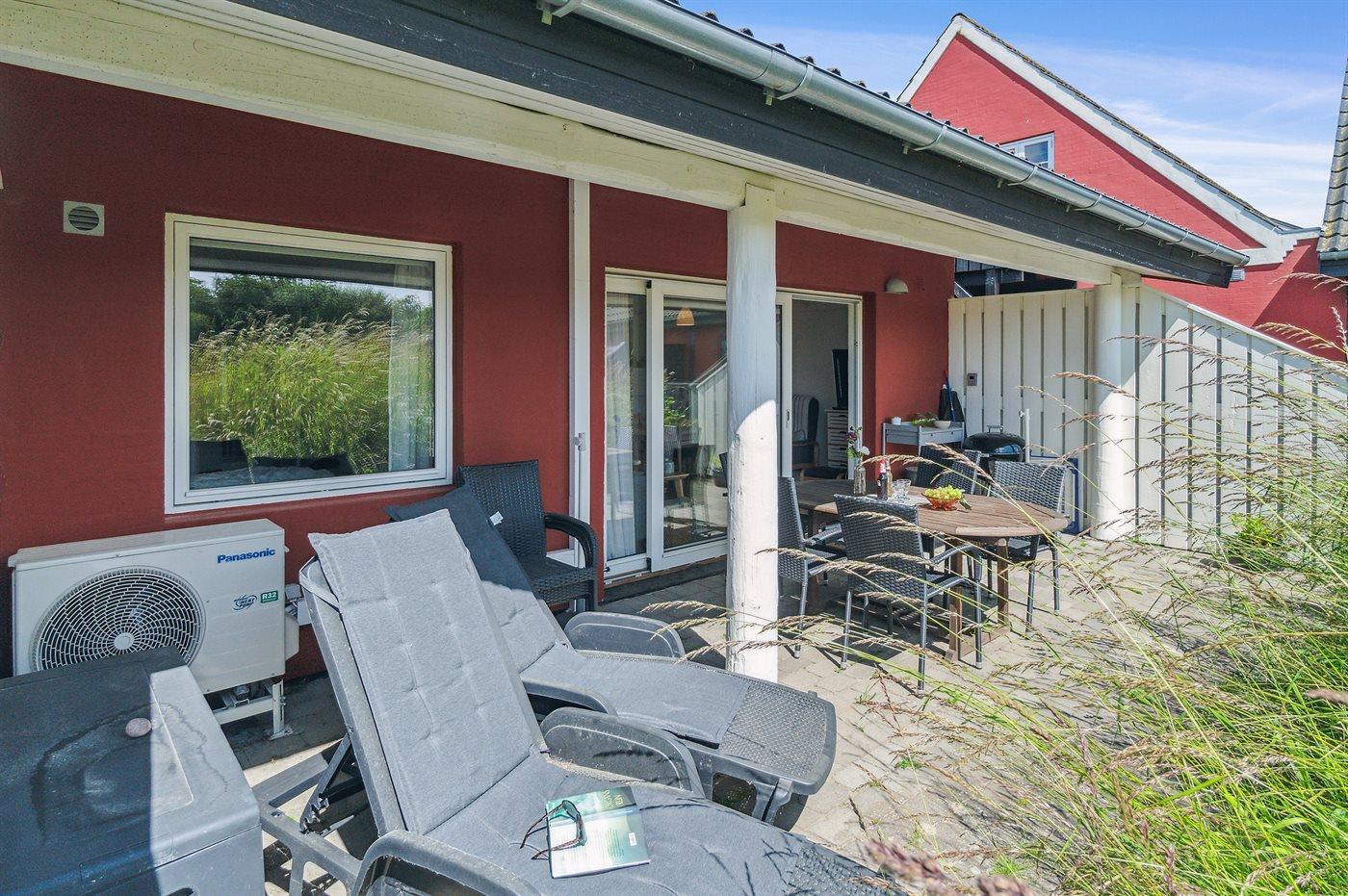 Foran ferielejligheden er der en lille fliseterrasse, så man kan følge livet i fællespoolen, der nok kan friste til en badetur. Poolen er opvarmet fra den 15.6 - 15.9. Til fælles afbenyttelse er der i Dams på Bakken petanquebane, trampolin, fodboldmål og et lille bålsted.