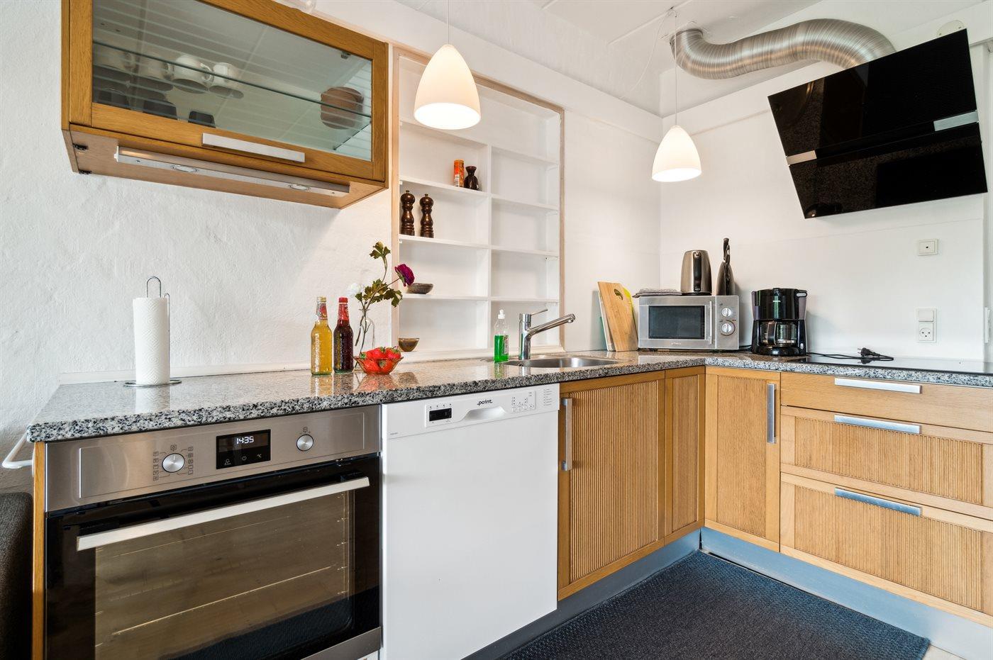 Køkkenet er udstyret med 1 køleskab. Der er 4 keramiske kogeplader, varmluftovn, mikrobølgeovn samt opvaskemaskine.
