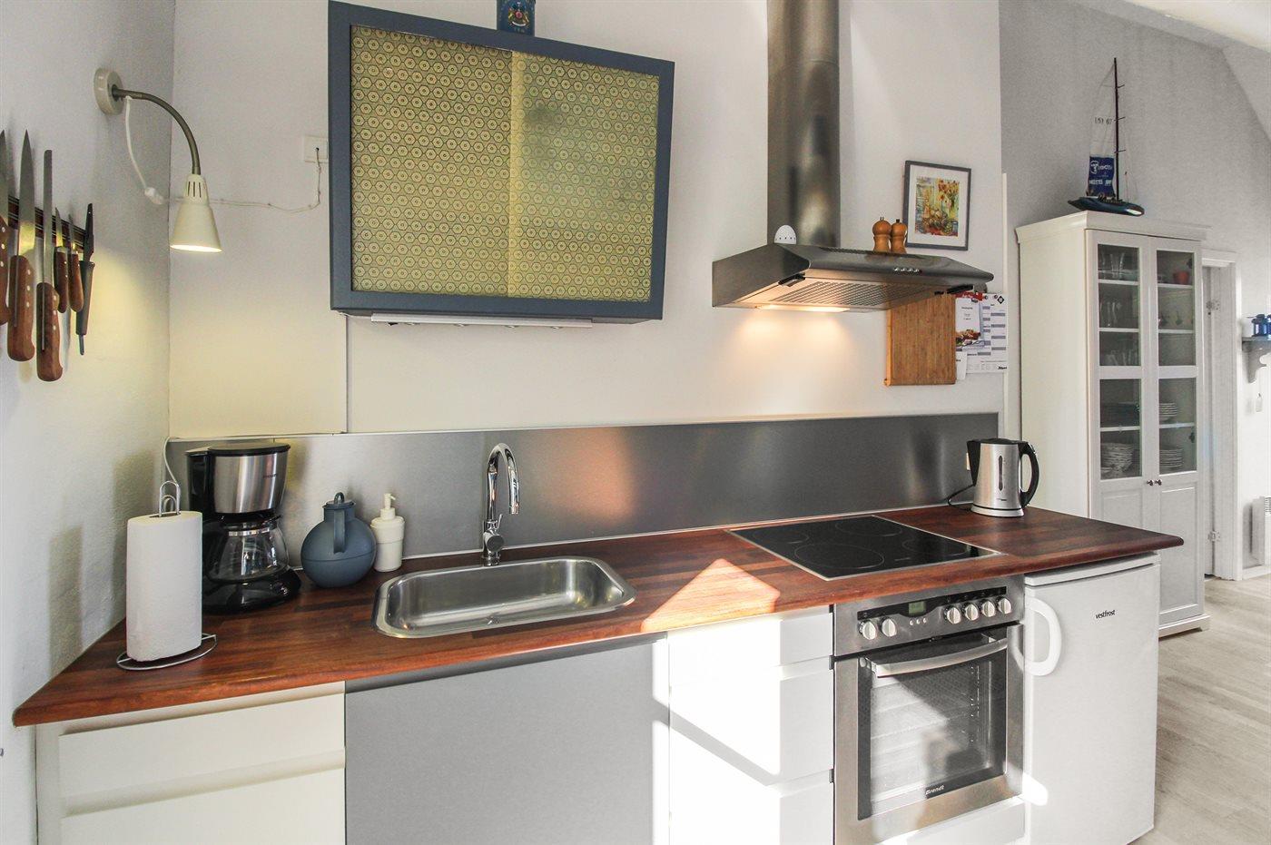 Køkkenet er udstyret med 1 køleskab. Der er 4 keramiske kogeplader, varmluftovn.