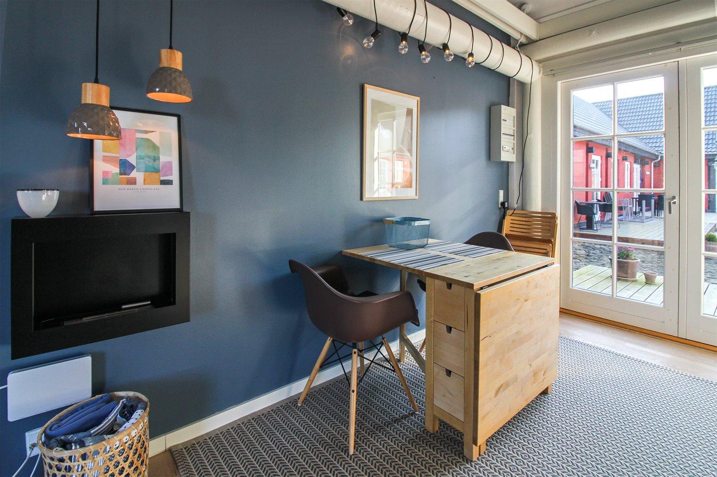 Denne dejlige ferielejlighed beliggende i Dams på Bakken lige uden for Aakirkeby. Dams på Bakken er et tidligere landsted fra 1870, der i 2006 er ombygget til ferielejligheder. Lejligheden ligger på et fællesareal med bl.a. udendørs swimmingpool (16 x 10 x 0,7-1,8 m), fodboldbane, bålplads samt legeplads med gynge og trampolin. I perioden fra den 15.6 til 15.9 (fra kl. 8:00 til kl. 20:00) opvarmes swimmingpoolen vha. varmepumpe. Det er muligt at benytte sig af vaskeriet på den nærliggende campingplads. Bemærk, at 2 af sovepladserne (madrasser) befinder sig på husets hems.