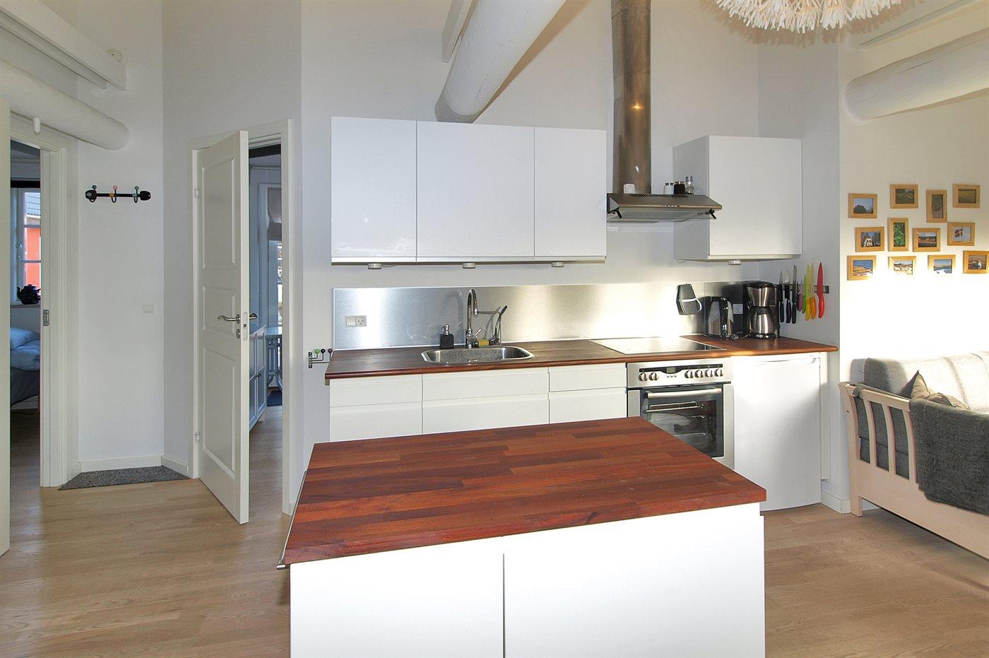 Køkkenet er udstyret med 1 køleskab. Der er 4 keramiske kogeplader, varmluftovn, mikrobølgeovn samt opvaskemaskine.
