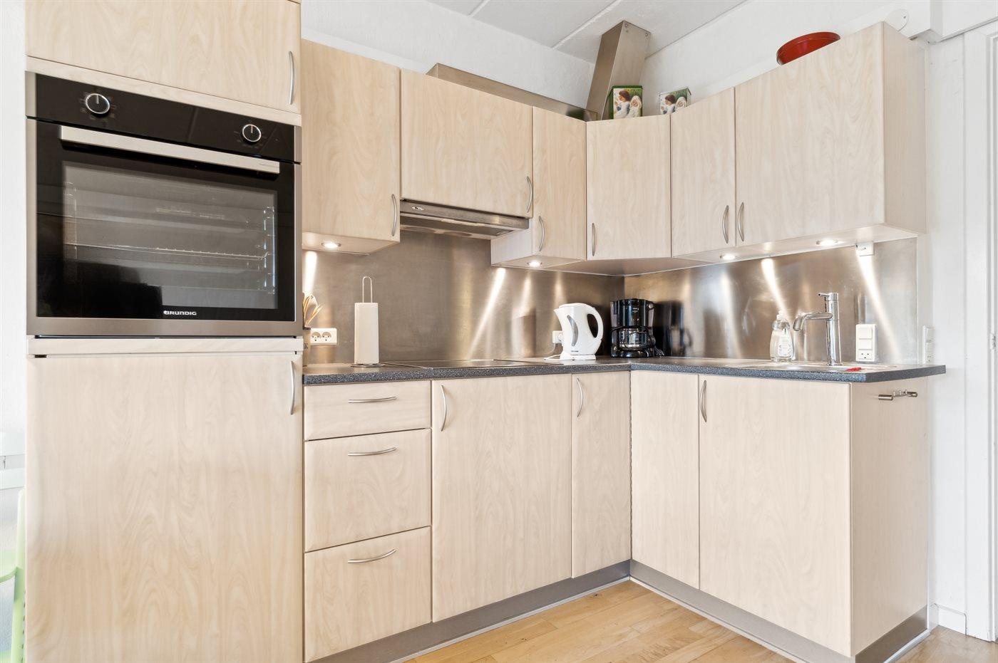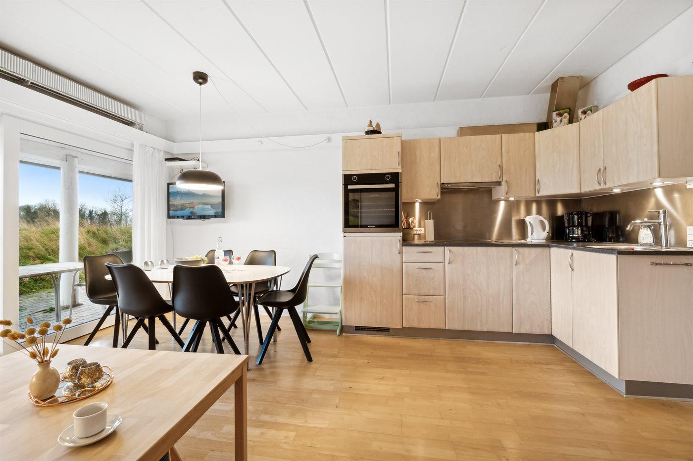 Køkkenet er udstyret med 1 køleskab. Der er 4 keramiske kogeplader, varmluftovn, mikrobølgeovn samt opvaskemaskine.
