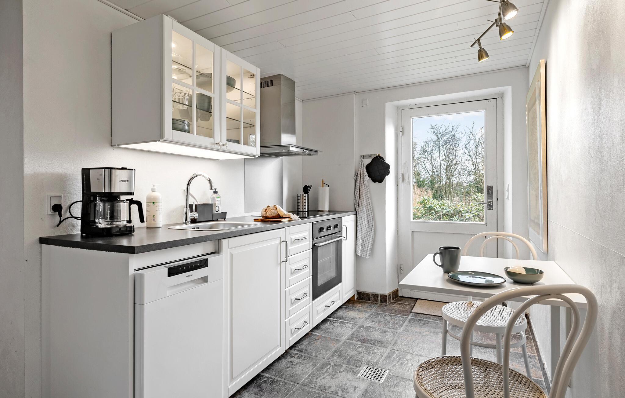 Charmerende ferielejlighed på Bornholm med moderne køkken, privat have og udsigt til markerne, perfekt til en afslappende ferie.