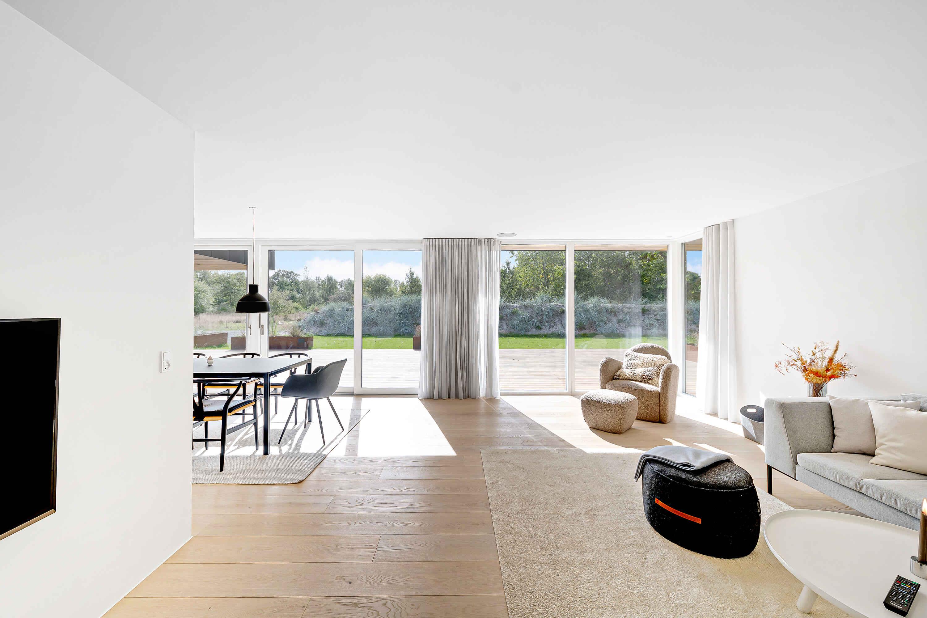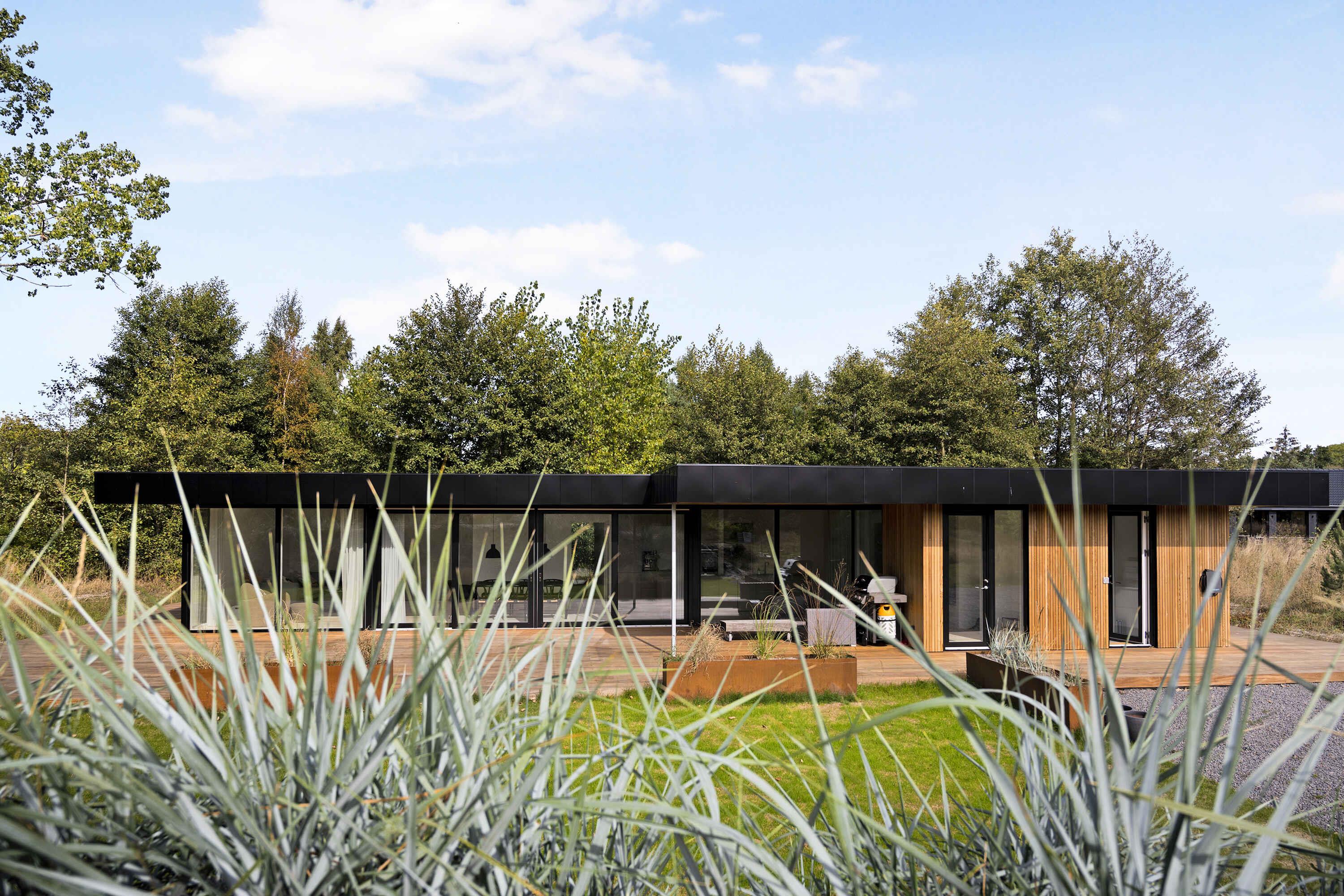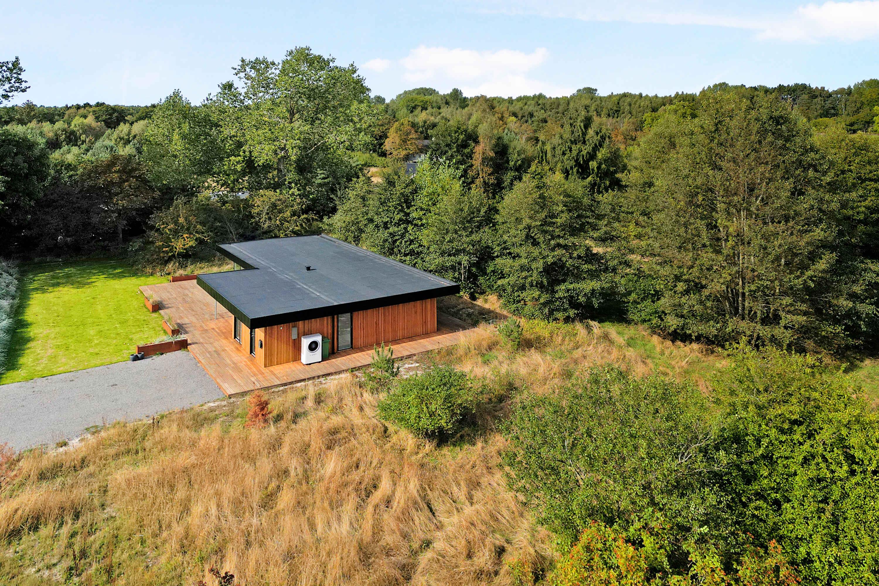 Moderne luksussommerhus på Bornholm med stor terrasse og tæt på strand.