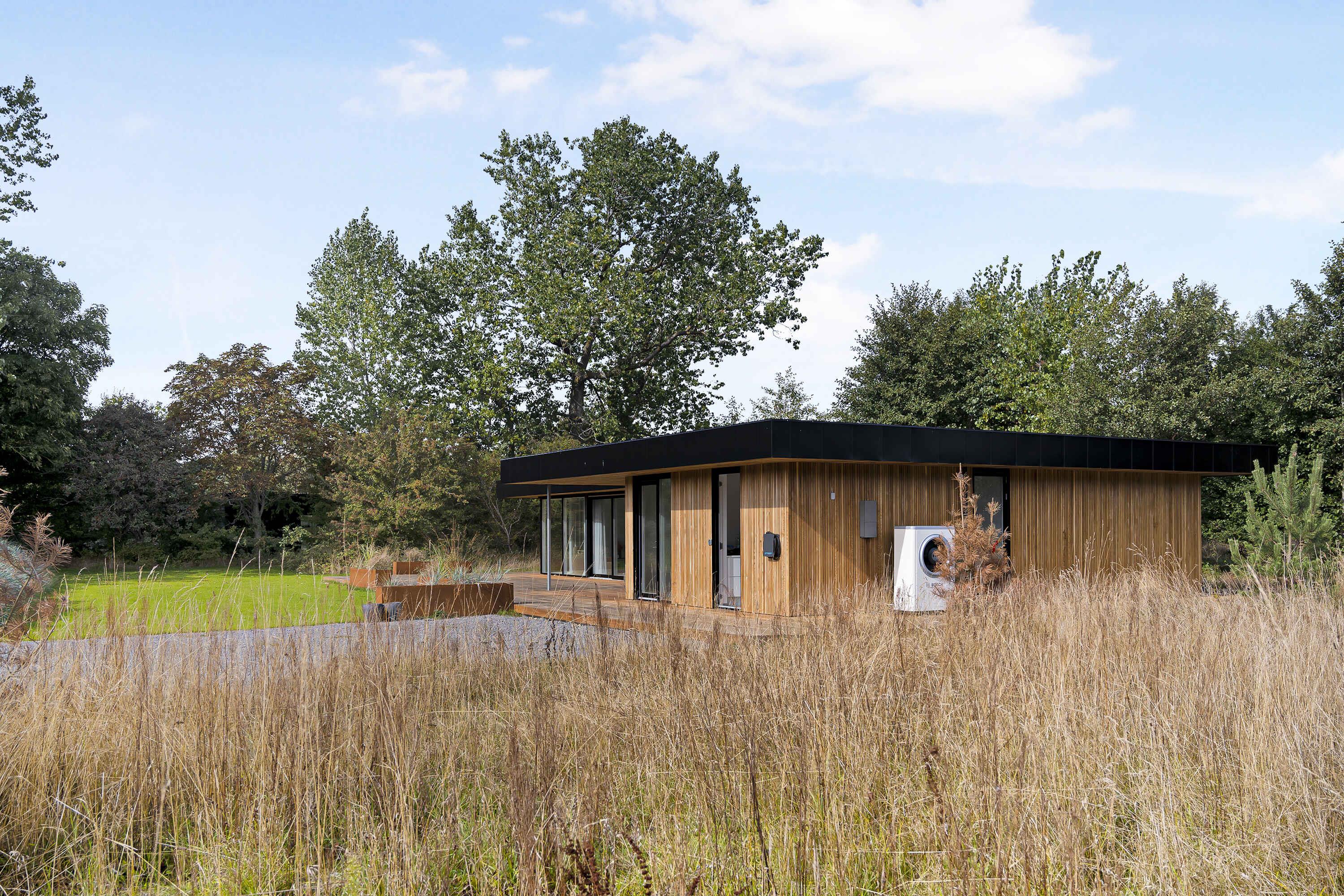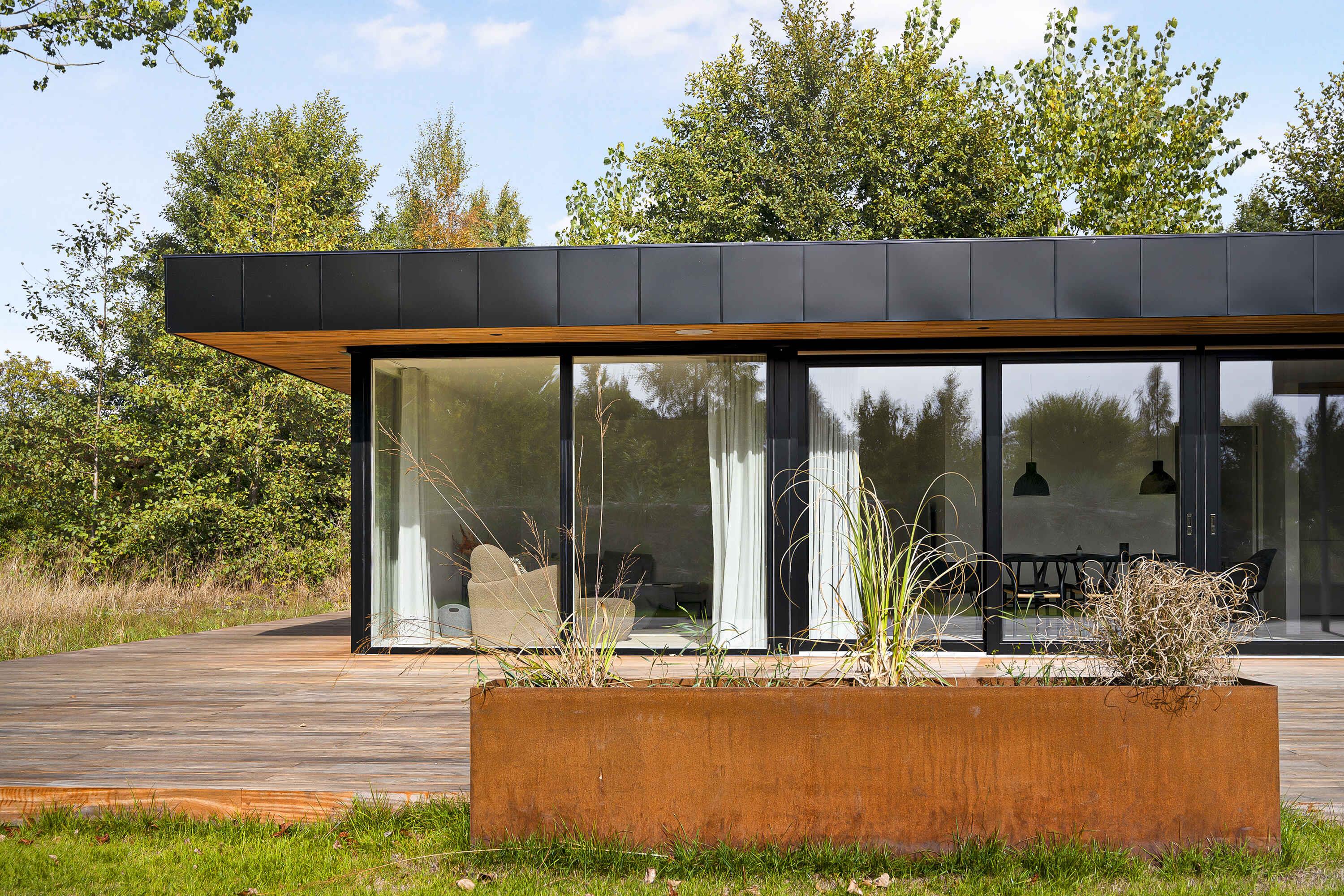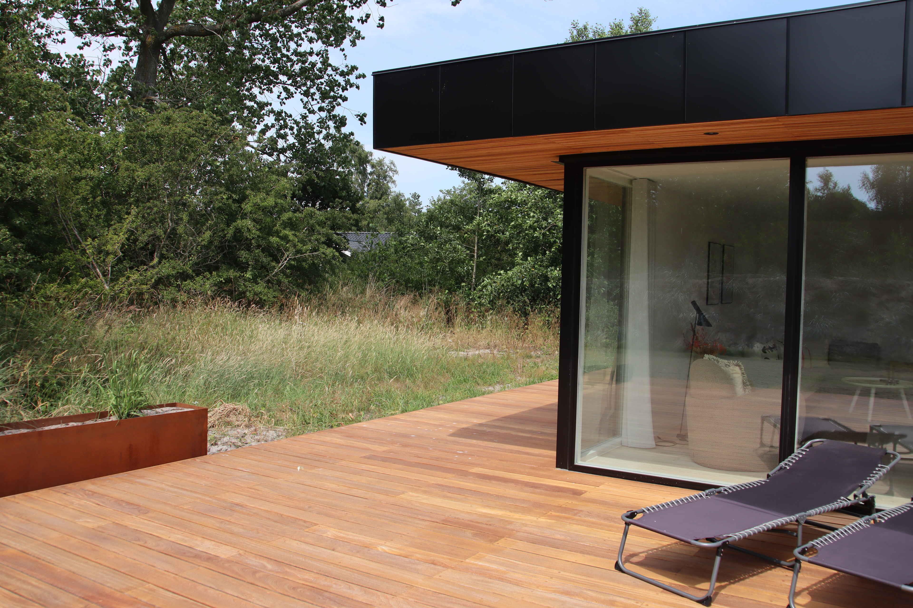 Moderne luksussommerhus på Bornholm med stor terrasse og tæt på strand.