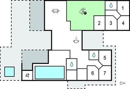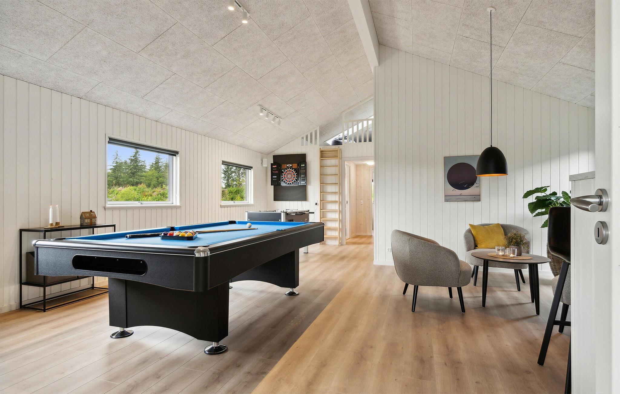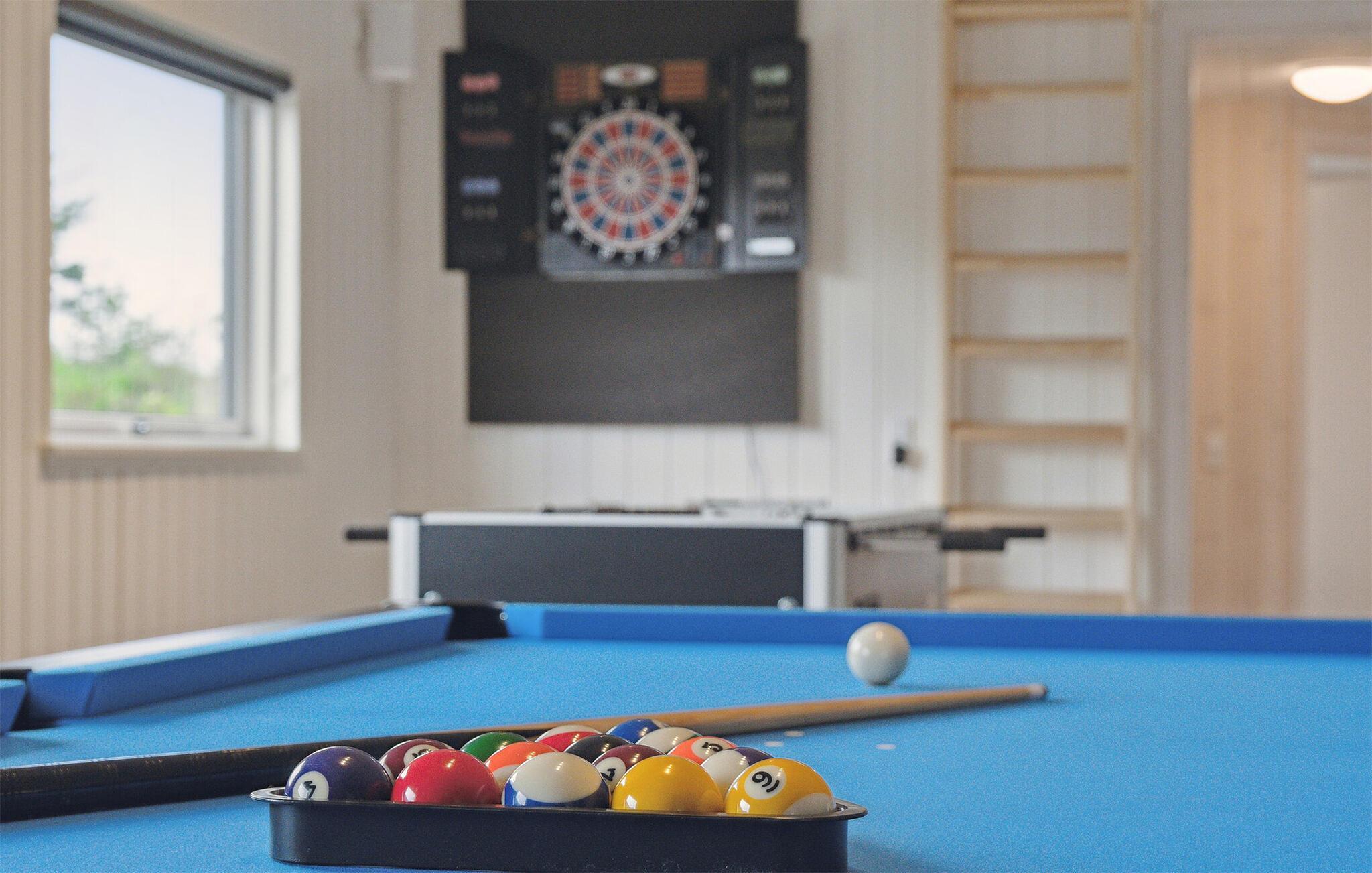 Velkommen til dette rummelige hus, hvor I får den perfekte base for et ophold med hele familien med flere generationer samlet under ét tag. Huset ligger på en stor grund i fredelige omgivelser, og ude som inde er huset udstyret med en lang række faciliteter, der sikrer fuld komfort og masser af sjov for alle aldre. Prikken over i'et er den indendørs swimmingpool, hvor børnene kan plaske rundt og suse ned af rutsjebanen, mens de voksne tager den lidt mere med ro og sveder igennem i saunaen. Køkkenet er moderne og veludstyret, så lad kokkene kræse om madlavningen, mens andre dækker op ved spisebordene eller duellerer i aktivitetsrummet i et slag pool eller bordfodbold. Huset er virkelig flot indrettet med velvalgte materialer, komfortable møbler og moderne bekvemmeligheder over hele linjen, så I kommer ikke til at mangle det mindste.