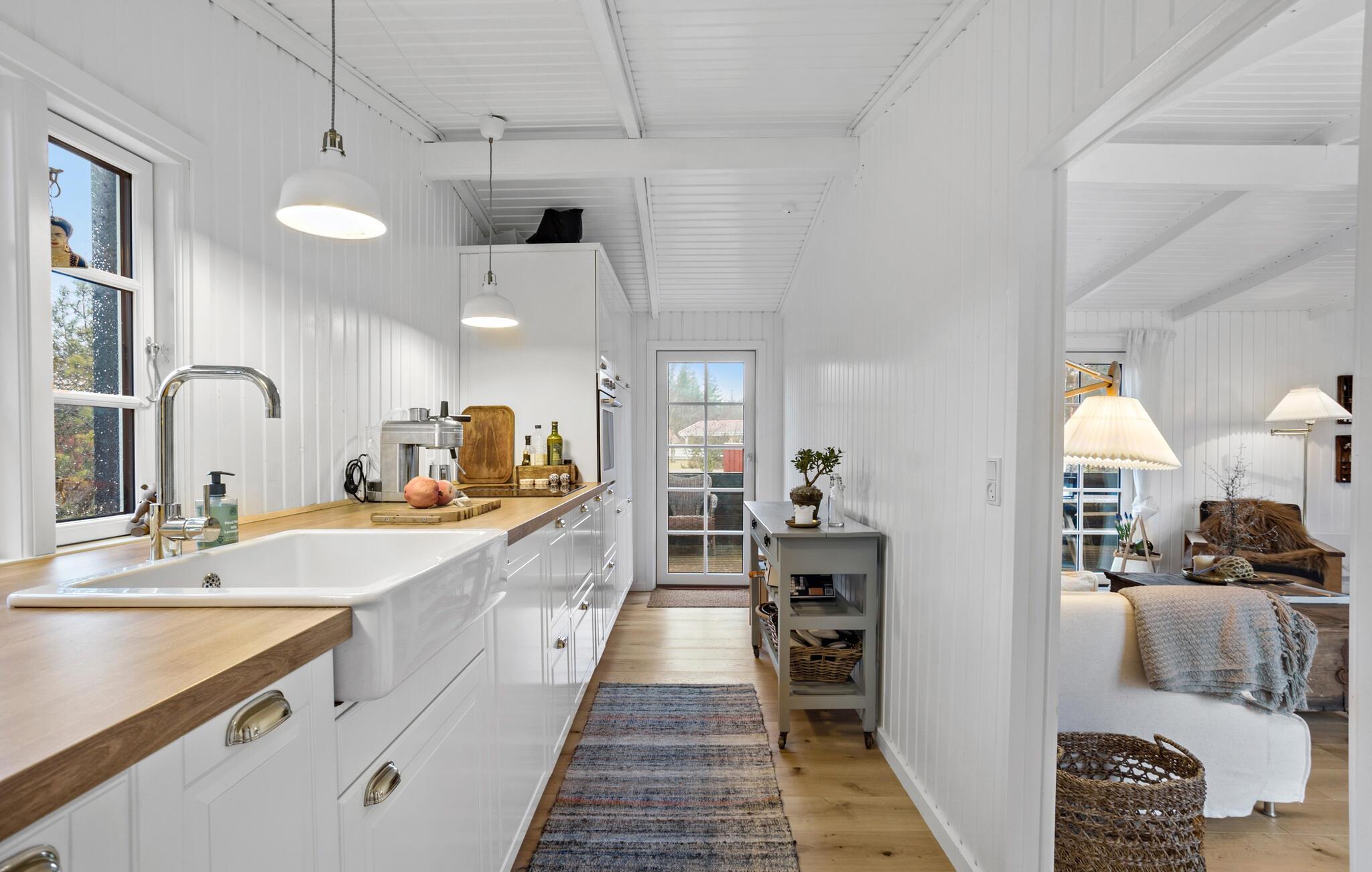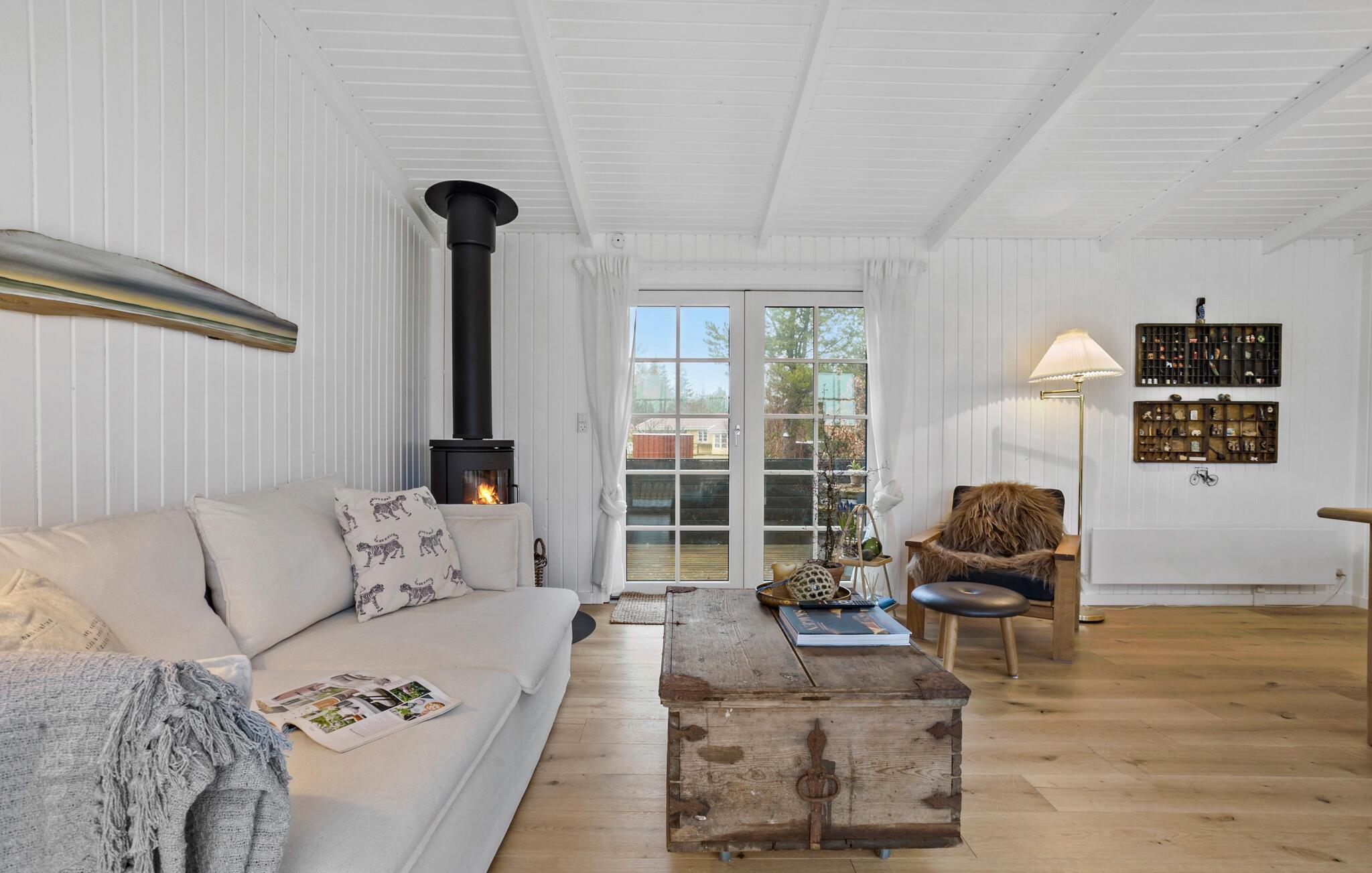 I kan tilbringe en afslappende ferie med hele familien i dette smukke sommerhus. Der venter jer et perfekt mix mellem klassisk sommerhushygge i en moderne indretning og med gode faciliteter. I den hyggelige stue er der ikke kun et dejligt opholdsområde med komfortable sofaer, men der er også spiseplads, hvor man kan nyde feriens måltider sammen. Det store rum oplyses dejligt udefra gennem gulv-til-loft-vinduerne der samtidig giver en fin udsigt til de grønne omgivelser.