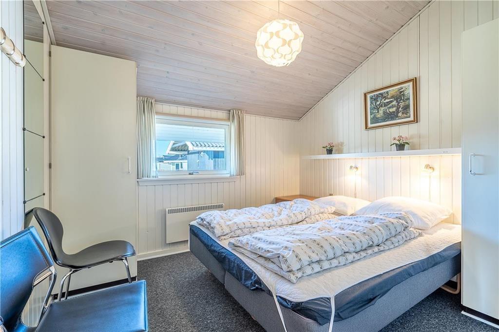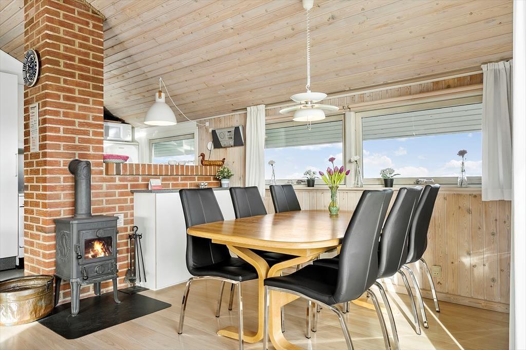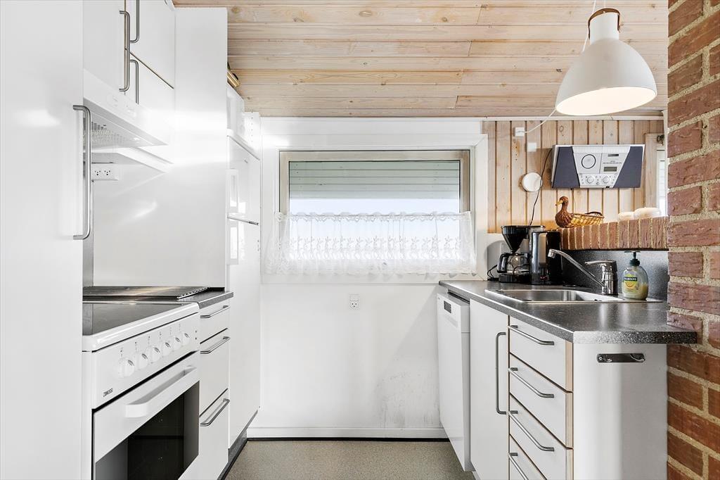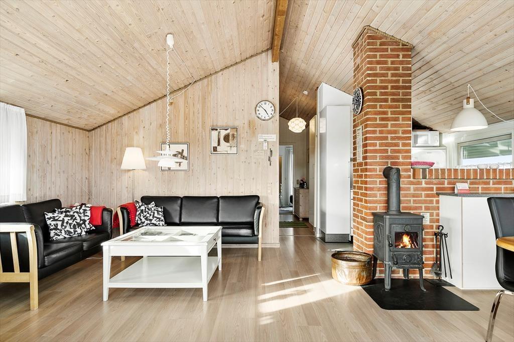 Feriehuset er indrettet med tre soveværelser med sengepladser til seks personer. Badeværelset har bruseniche og vaskemaskine, og der er tilmed en tilstødende sauna. I opholdsafdelingen ligger køkkenet og stuen i åben forbindelse, og her har I god plads til at være sammen om madlavning og måltider. Køkkenet er tosidet og udrustet med opvaskemaskine, så rengøringen går som en leg. Stuen har loft til kip og store vinduespartier, der giver et skønt lysindfald. Varmepumpen holder sammen med brændeovnen en behagelig temperatur, og med et spisebord såvel som et hyggeligt sofaarrangement kan I rigtigt hygge jer med en god bog, brætspil eller en film.