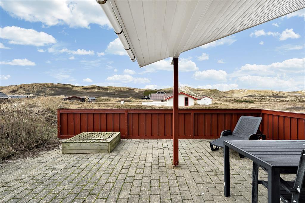 En stor terrasse smyger sig omkring huset mod syd og vest, og her har I et dejligt sted at bruge de solrige dage i liggestolene, omkring grillen eller ved spisebordet på den overdækkede del. Som en fin detalje er her også en sandkasse, som de alleryngste vil elske.