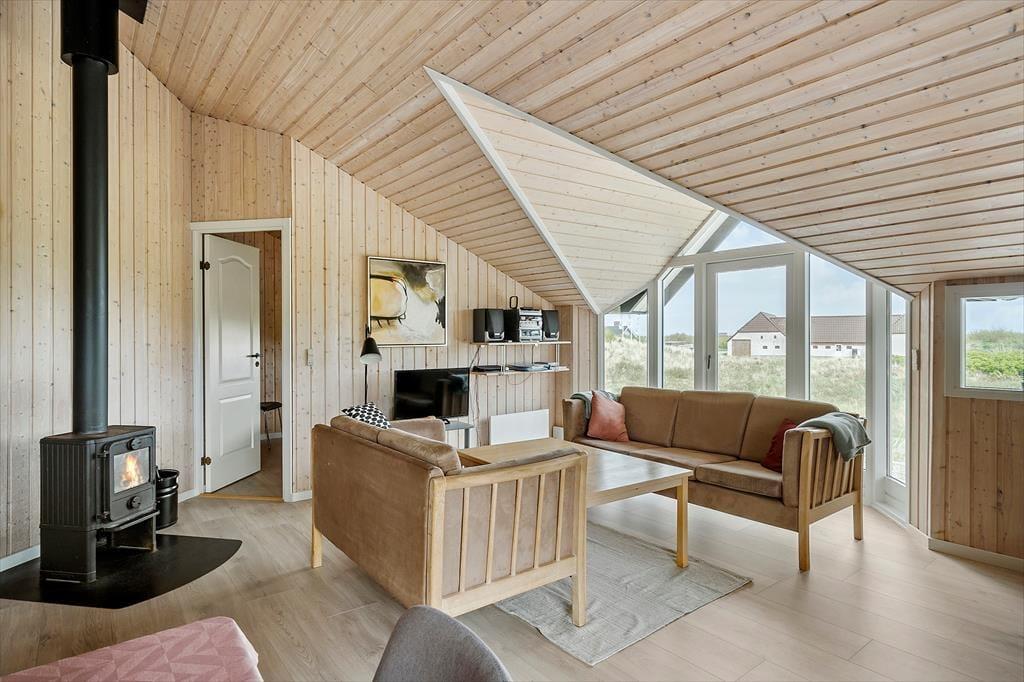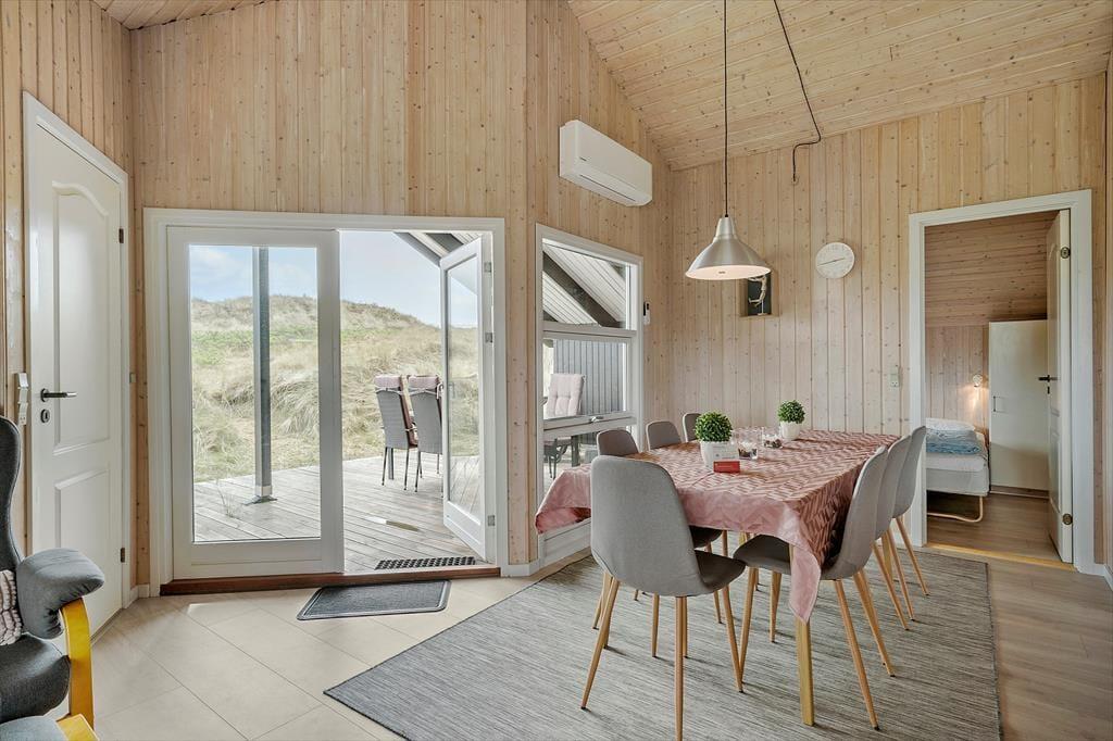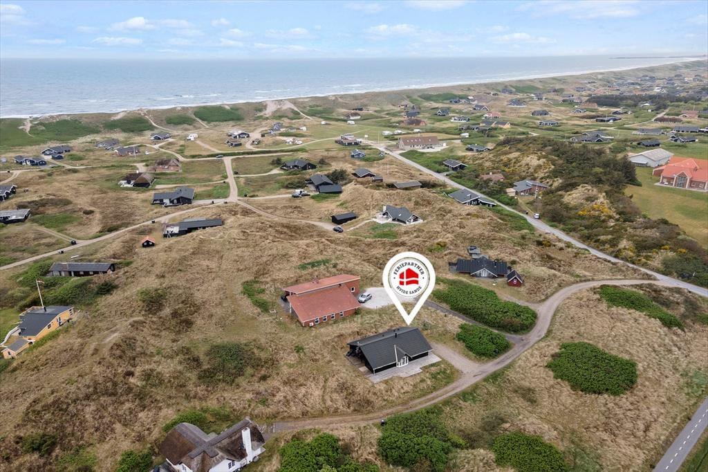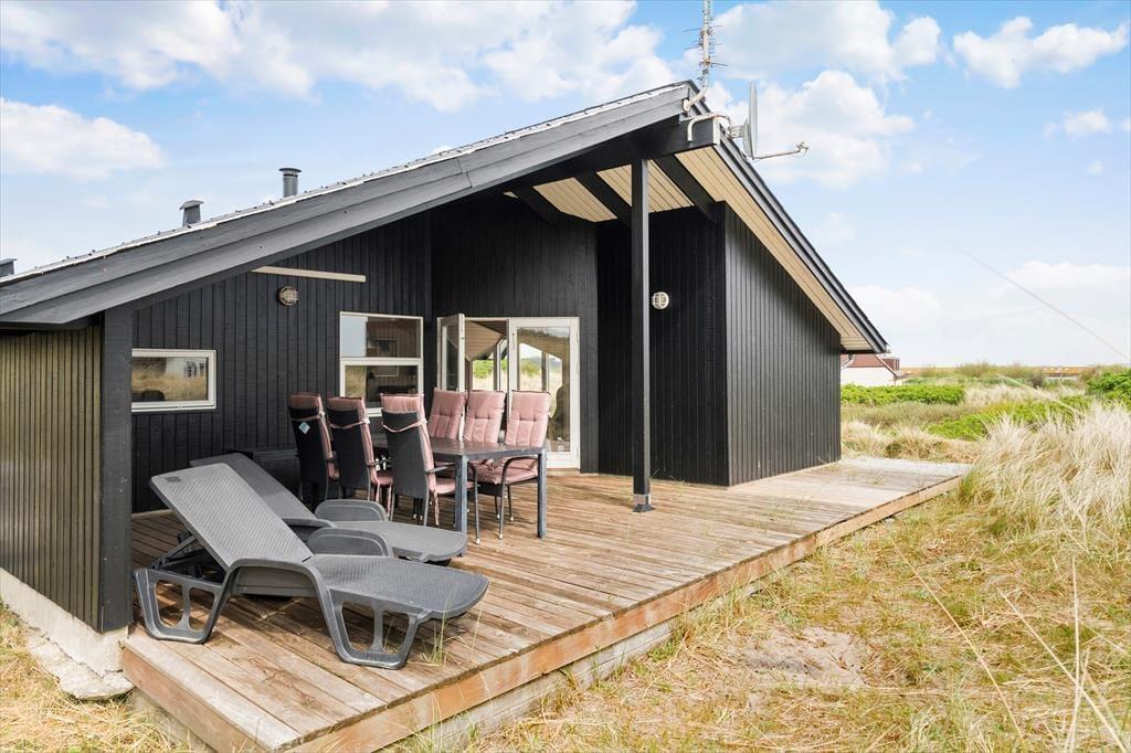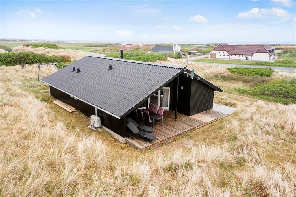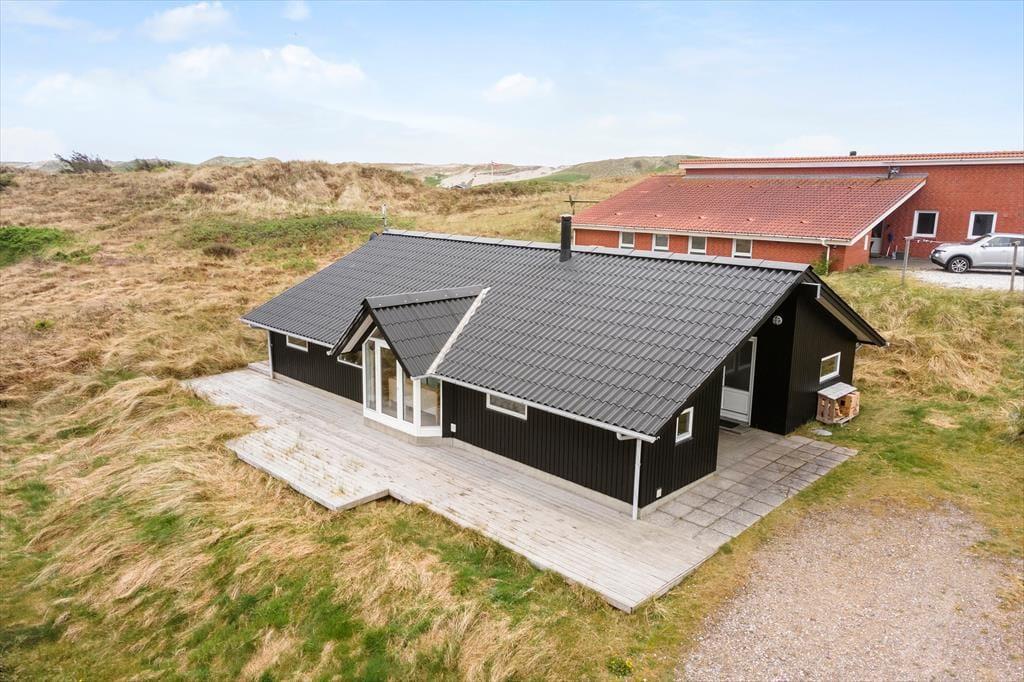 Omkring huset findes overdækkede og åbne terrasser, hvor I kan nyde sommerdagene i solen fra morgen til aften med udsigt til det omgivende klitlandskab og med kig til Ringkøbing Fjord. Naturgrunden byder på masser af plads til leg, og her er desuden et gyngestativ samt en sandkasse til de yngste.