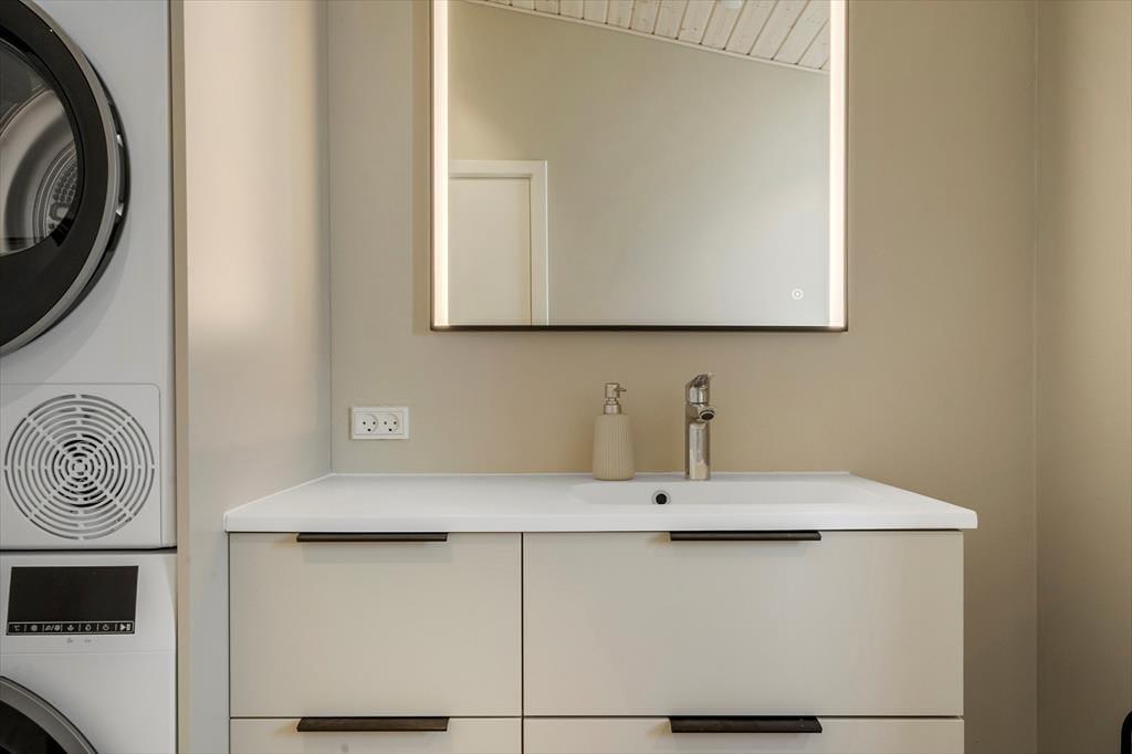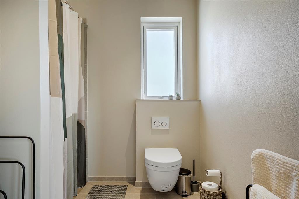 Stuen er både lys og indbydende og skaber en hyggelig atmosfære til både afslapning og socialt samvær. Badeværelset er indrettet med både vaskemaskine og tørretumbler, så du nemt kan få vasket og tørret dit tøj efter en dag på stranden.