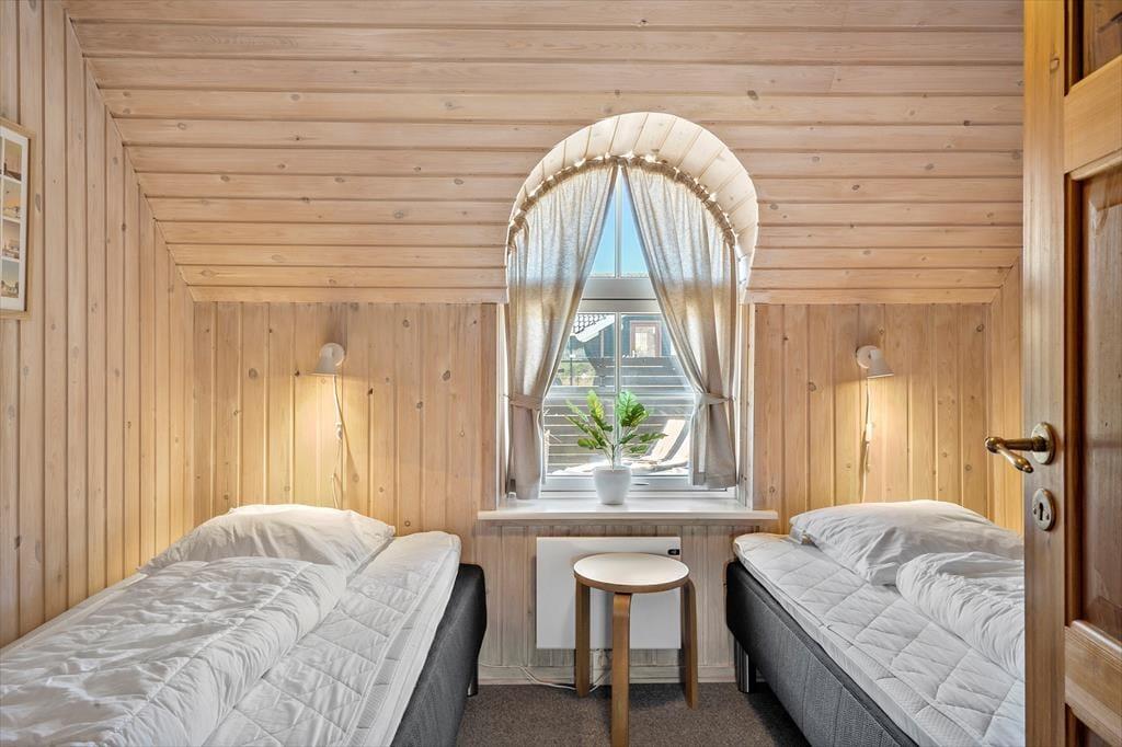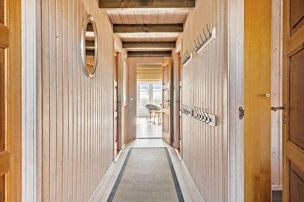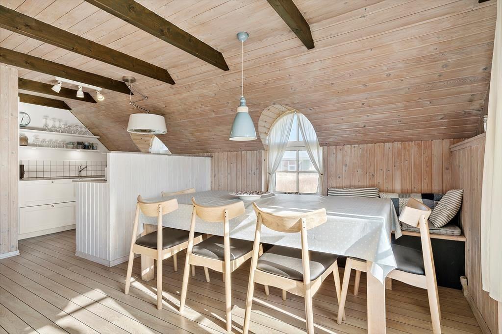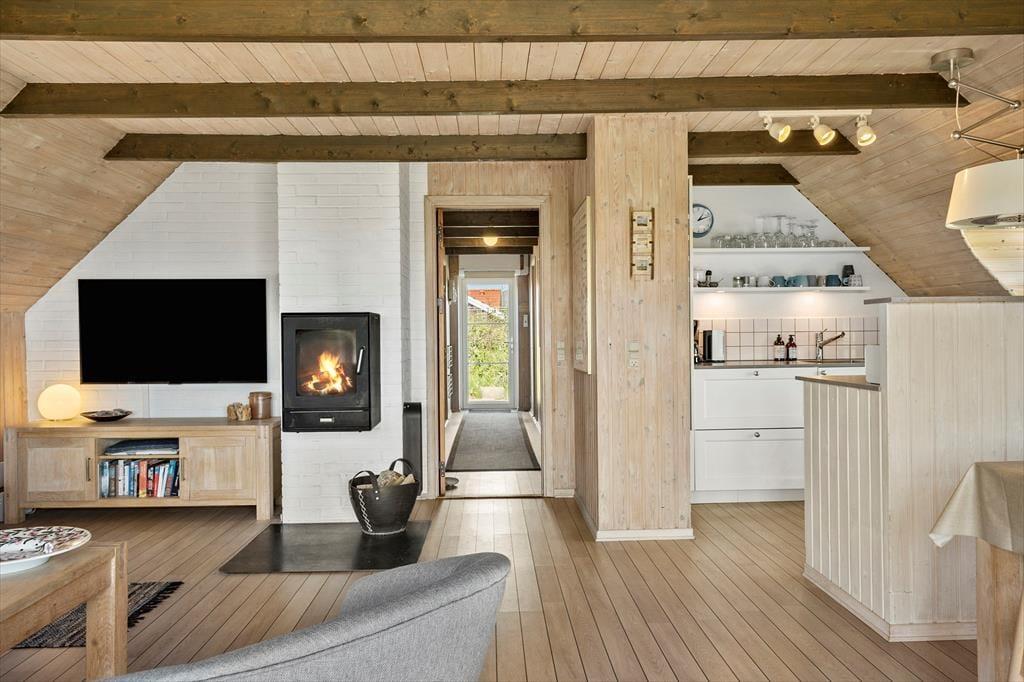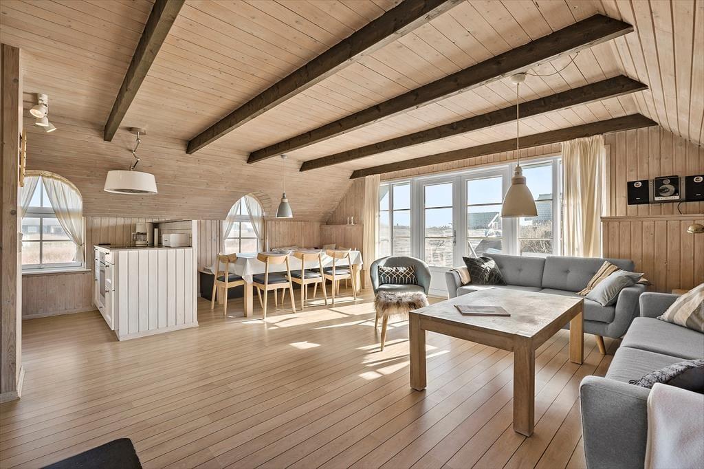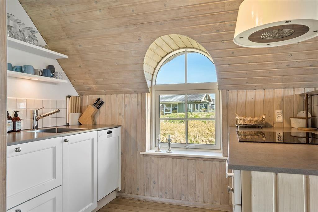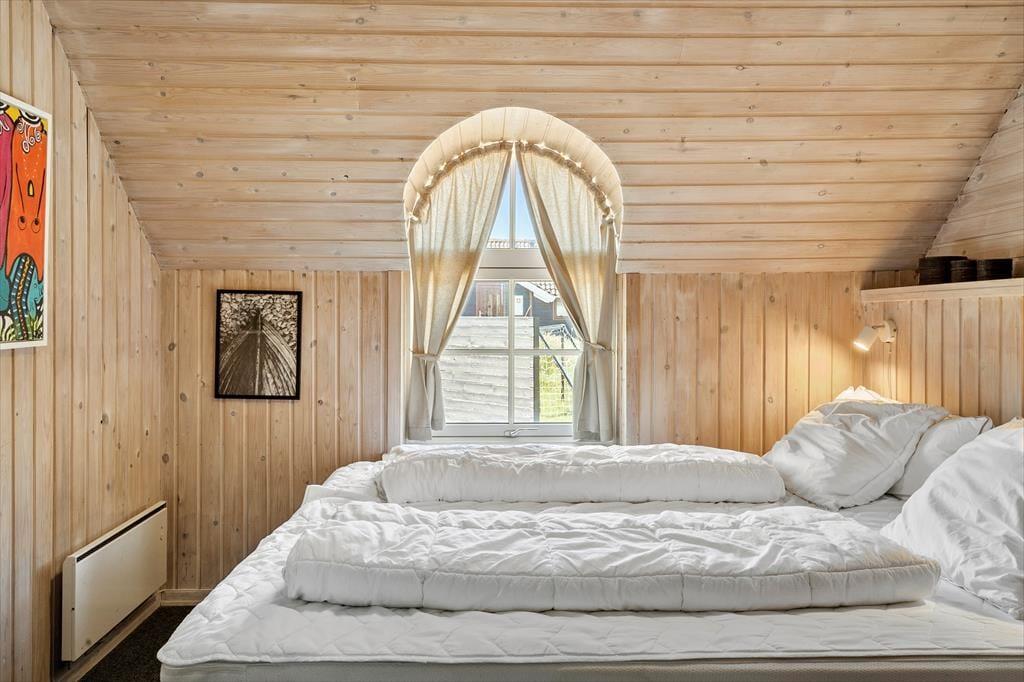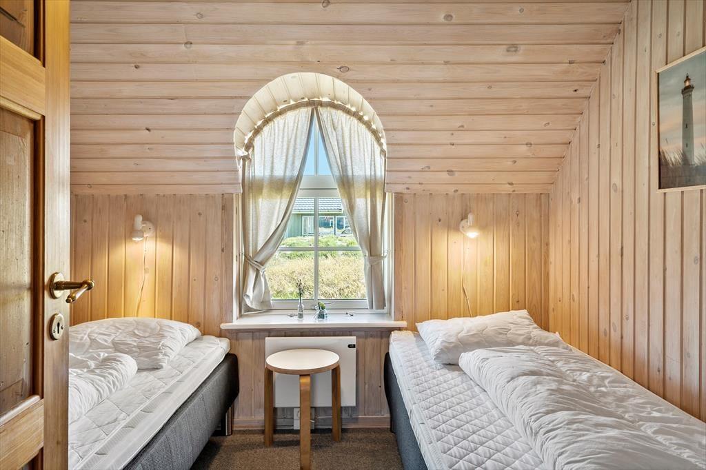 Med rødt murværk, rundbuede sprossevinduer og det idylliske stråtag charmerer huset allerede ved første øjekast, og I bliver ikke skuffede, når I træder ind i opholdsafdelingen, hvor skråvægge og synlige bjælker i loftet skaber en skøn atmosfære. Læg dertil lysindfaldet og udsigten til klitterne og I har en stemningsfuld ramme om afslappede feriedage i sommerlandet. Opholdsafdelingen rummer et veludstyret køkken, og retterne serveres let ved spisebordet, hvor I også har god plads til at dyste i brætspil. Brændeovnen luner ved sofaafsnittet, hvor I kan hygge med en film, bøger eller god musik. Værelserne er alle af en god størrelse, og feriehuset fuldendes af et lækkert badeværelse med vaskemaskine, bruseniche og sauna.