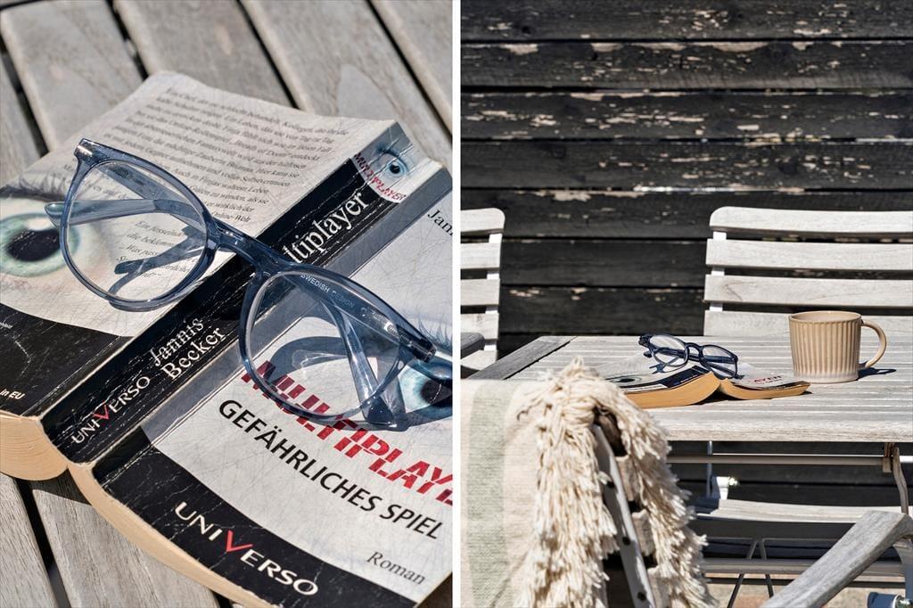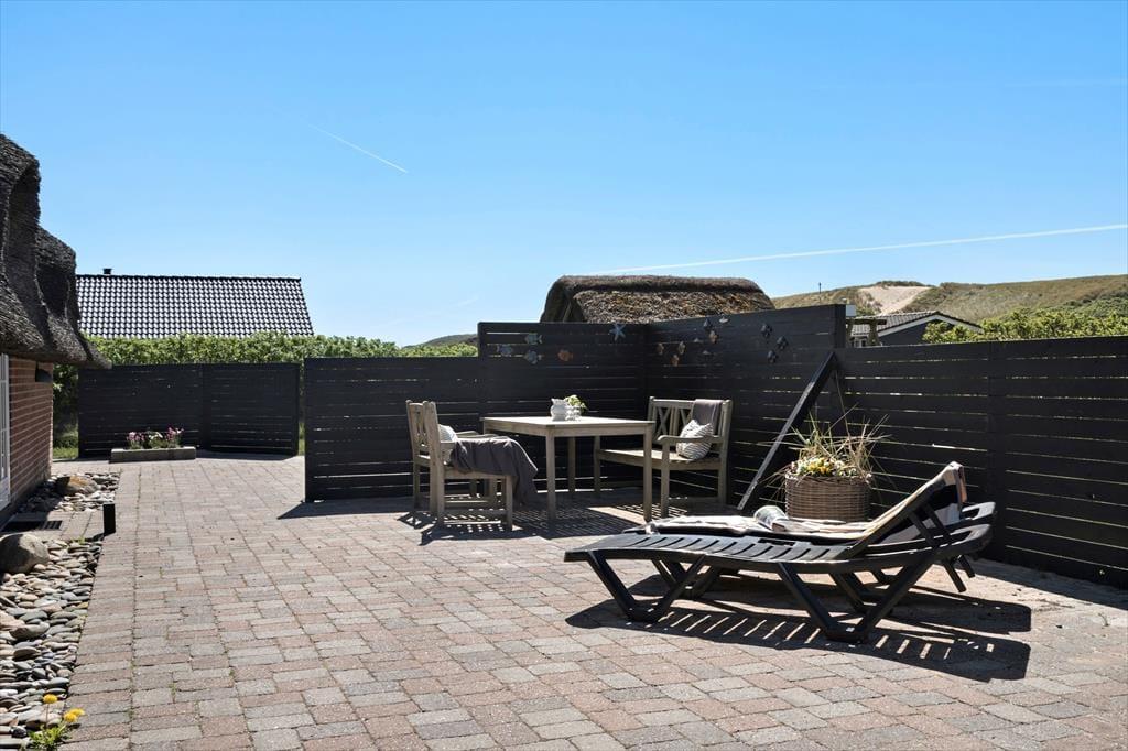 Feriehuset er omgivet af terrasser med læhegn mod syd, vest og nord, og her kan I bruge de solrige sommerdage på at indtage lækre måltider under solen. (Der må kun grilles med opstillede gasgrill og ingen åben ild pga. stråtag) Her er også god plads til, at familiens yngste kan lege og spille bold, for grunden er anlagt med en græsplæne gyngestativ og fodboldmål.