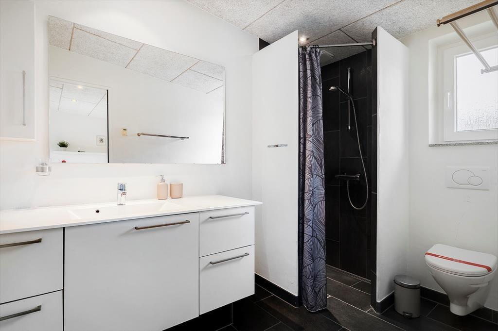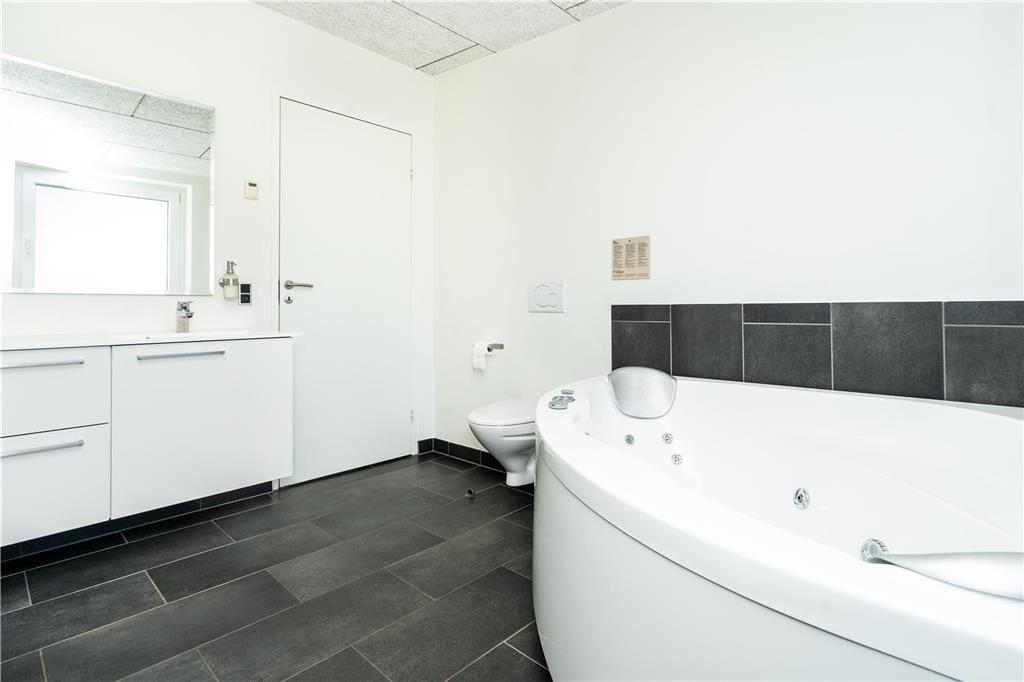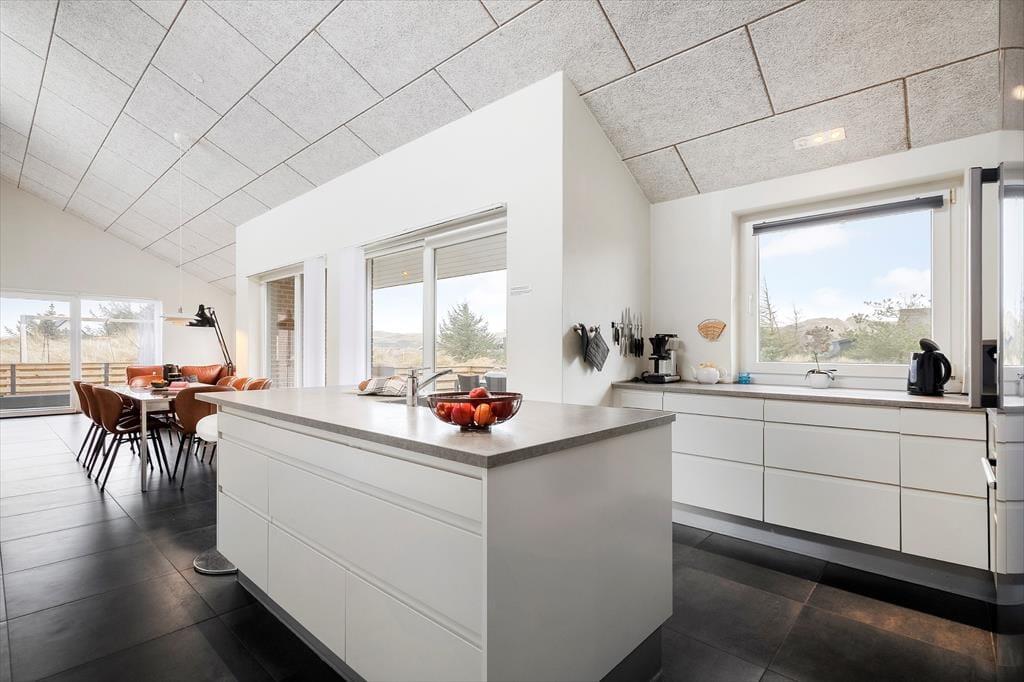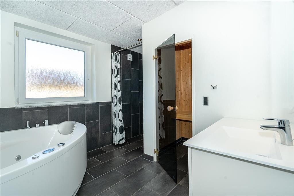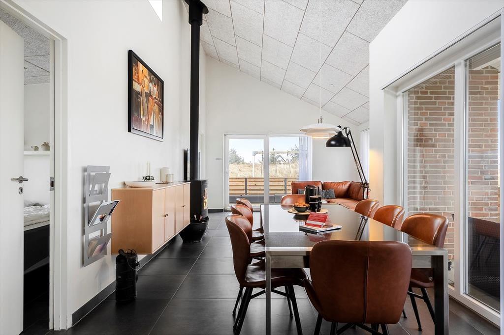Sommerhusets spændende arkitektur viser straks, at der ikke er tale om et almindeligt typehus. På tilsvarende vis kan den gode kvalitet og det høje komfort niveau tydeligt mærkes inden døre. Rummene har en flot loftshøjde og en lys atmosfære, og der er gulvvarme overalt under de mørke klinker. På det største af husets to badeværelser bliver I forkælet med spabad og sauna, og de fire soveværelser er udstyret med gode senge. Tre af soveværelserne har desuden tv med Chromecast, mens det fjerde har trappe op til en hems med madras og spillekonsol – det er en perfekt hyggekrog for de større børn eller teenageren, der trænger til en stund for sig selv. Det store opholdsrum er et skønt sted at samles, når der skal laves mad i det lækre, åbne køkken, eller når I vil hygge jer omkring spisebordet eller i sofaafdelingen nær brændeovnen. Her i opholdsrummet er der også Smart-tv – men måske trænger I ikke til ekstra underholdning, når den smukke naturomgivelser venter lige udenfor vinduet. På det praktiske plan er der vaskefaciliteter i bryggerset, der også byder på en 100 liters fryser, som især lystfiskerne vil værdsætte.