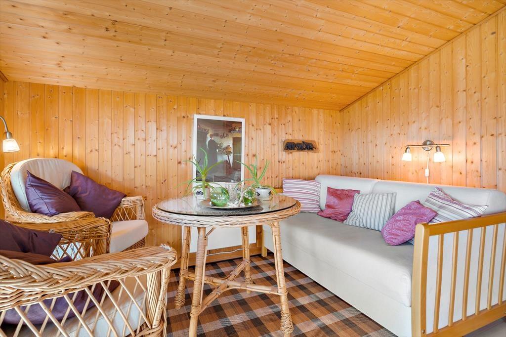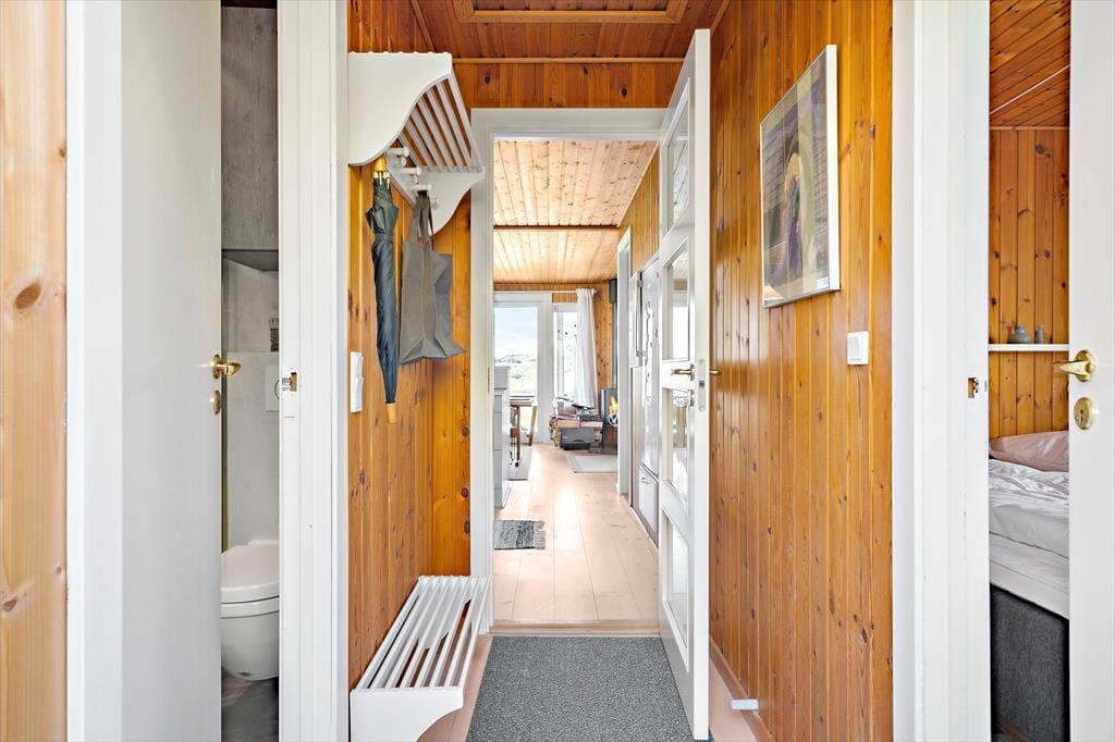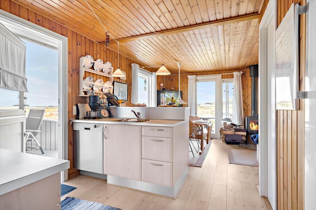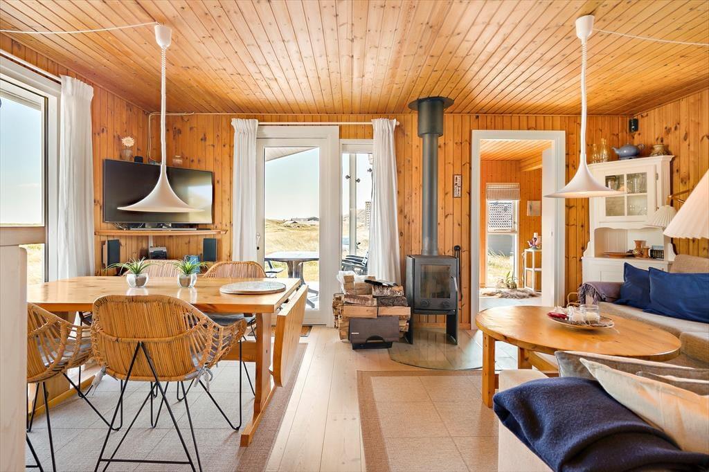 Das 71 m² große Haus bietet ausreichend Platz für vier Erwachsene. Es präsentiert sich in klassischer Manier eines echten dänischen Ferienhauses und wird durch rustikale Holzvertäfelungen an den Wänden und Decken geprägt. Der im Wohnraum platzierte Kaminofen trägt ebenfalls zum gemütlichen Ambiente bei. Was kann es schon Schöneres geben, als es sich mit einem guten Buch oder einem spannenden Film auf dem Sofa nah am Kaminofen gemütlich zu machen? Die gut ausgestattete Küche fügt sich offen in den Wohnraum ein. Dieser umfasst auch den Essplatz, der an einem der großen Fenster aufgestellt ist. Wenn Sie hier nicht beisammen sitzen und die Aussicht genießen, halten Sie sich sicher gern im angrenzenden Wohnzimmer auf. Dieses beinhaltet ein 140 x 200 cm großes Schlafsofa (mit einer guten Matratze und einem Matratzentopper), das eine schöne Ergänzung zu den beiden Schlafzimmern darstellt, in denen Sie auf ein Doppelbett und auf ein Etagenbett treffen. Das modernisierte Badezimmer begrüßt Sie mit einer verglasten Duschnische und einer Fußbodenheizung.