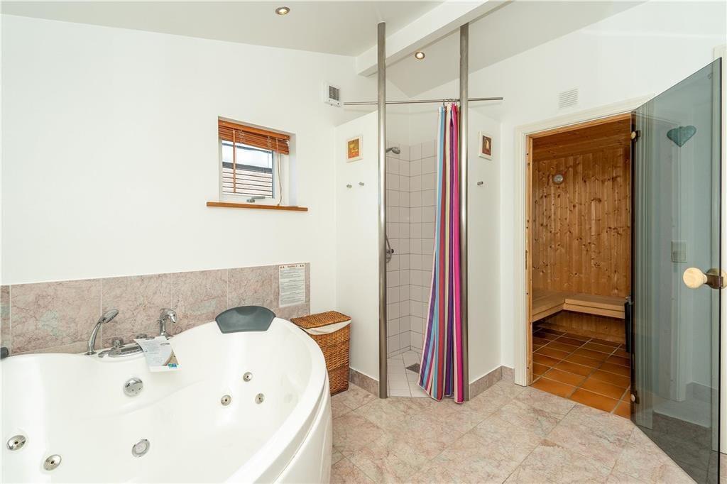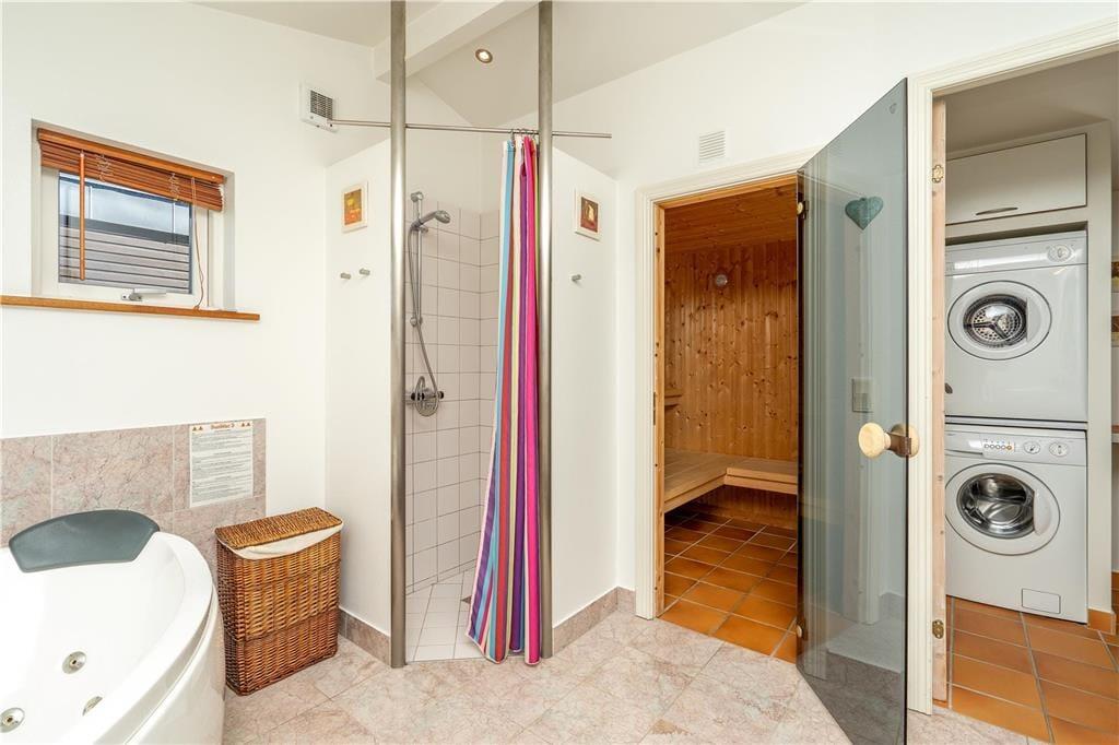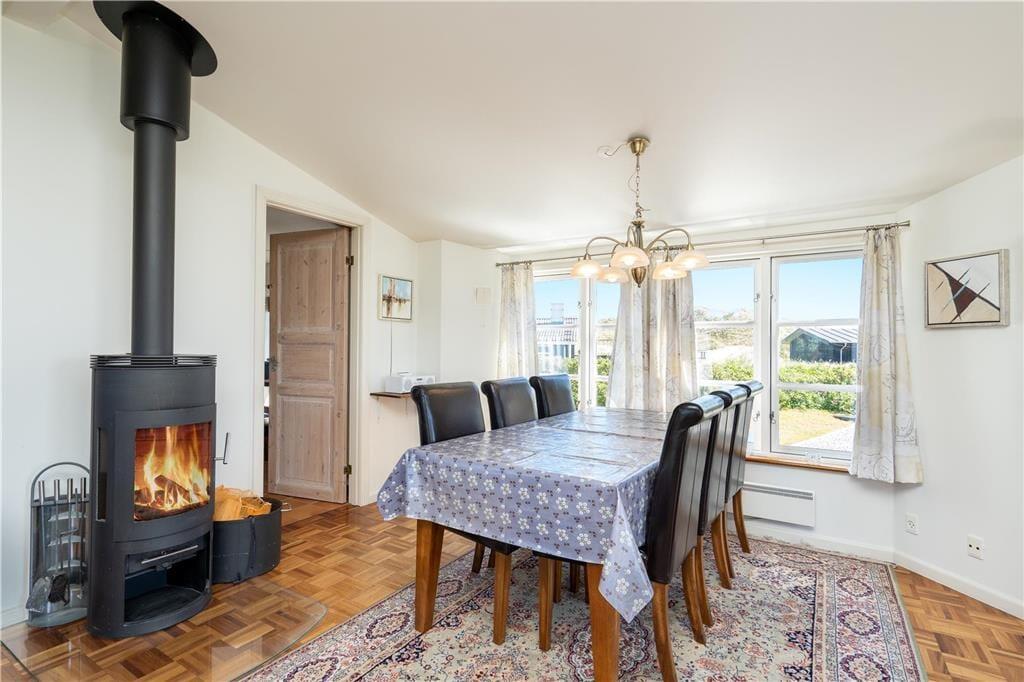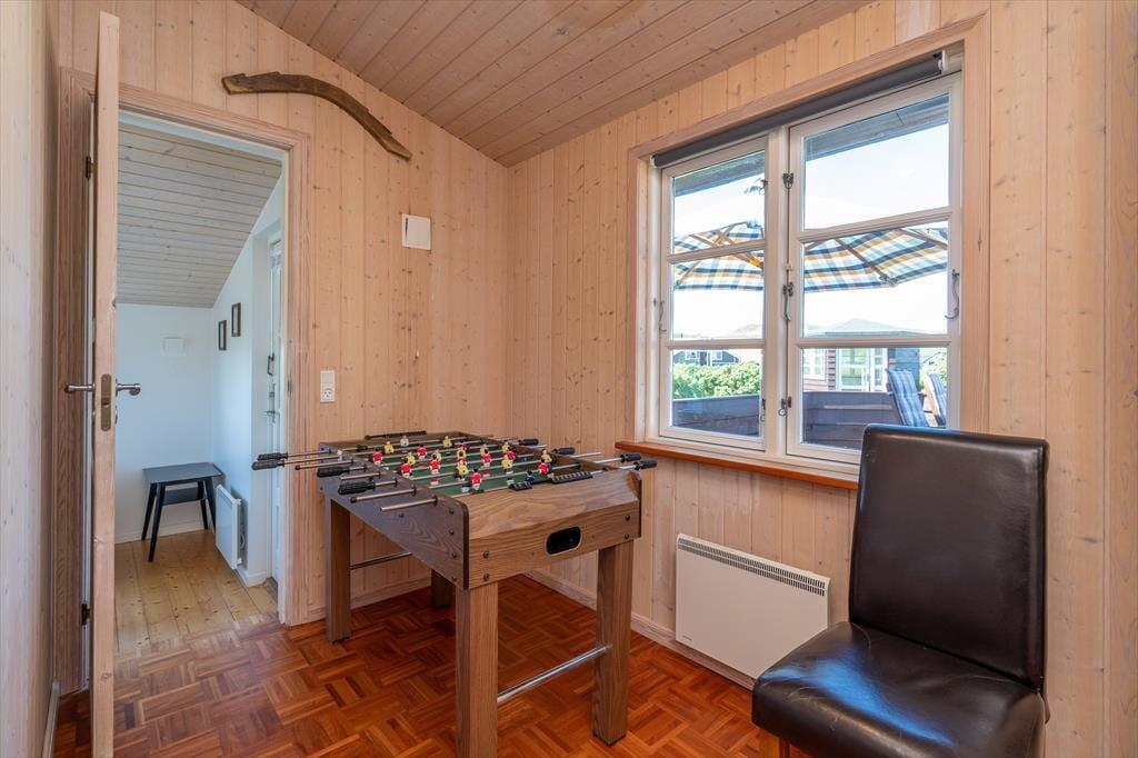 Hvis både humøret og vejrudsigten indbyder til en rigtig hyggeferie inden døre, er det 95 m2 store sommerhus godt indrettet til formålet. I stuen er der komfortable siddemøbler og parabol-tv, og brændeovnen står klar nær spisebordet, hvis I vil drikke varm kakao og spille kort i skæret fra flammerne. Et veludstyret køkken ligger i åben forbindelse med stuen, de tre soveværelser har sengepladser til seks personer, og i et gennemgangsrum står et bordfodboldbord, der inviterer til sjove familiedyster. Et praktisk bryggers byder på en vaskesøjle, og badeværelset er med spabad og sauna, så en rolig wellness-stund kan nemt blive et tilbagevendende indslag i løbet af ferien.