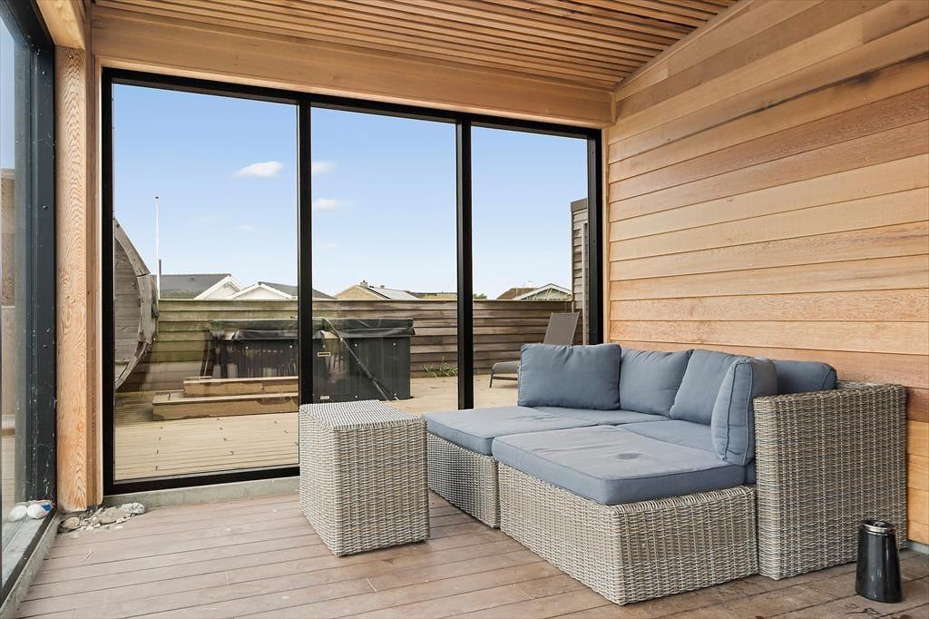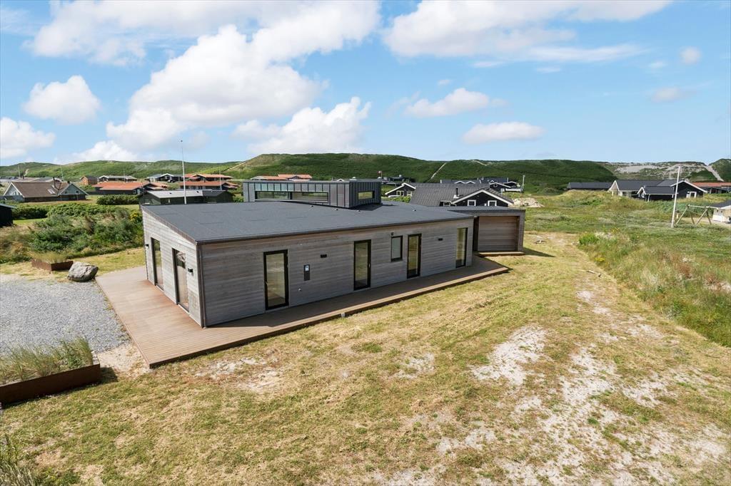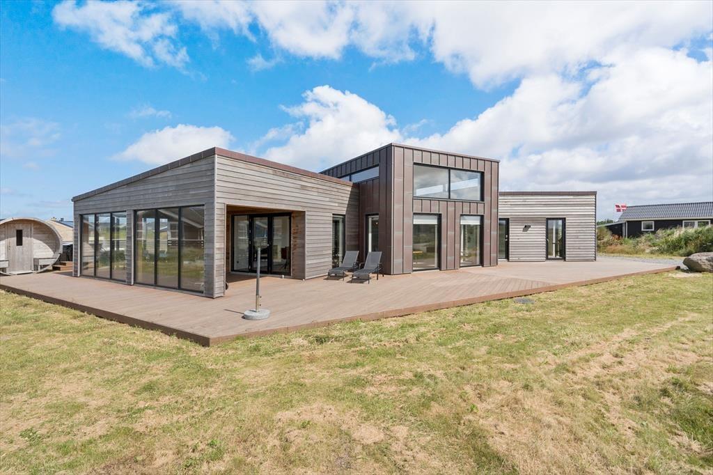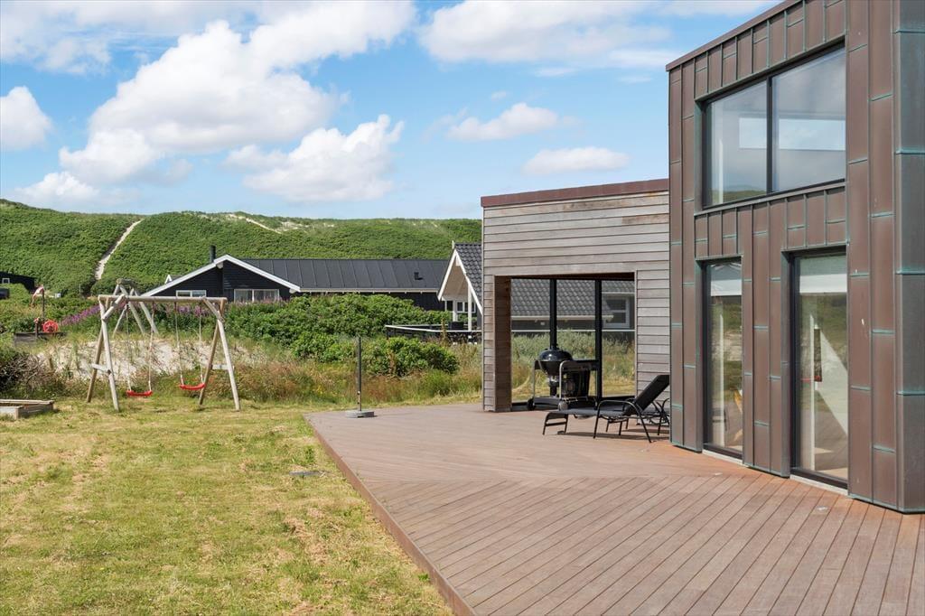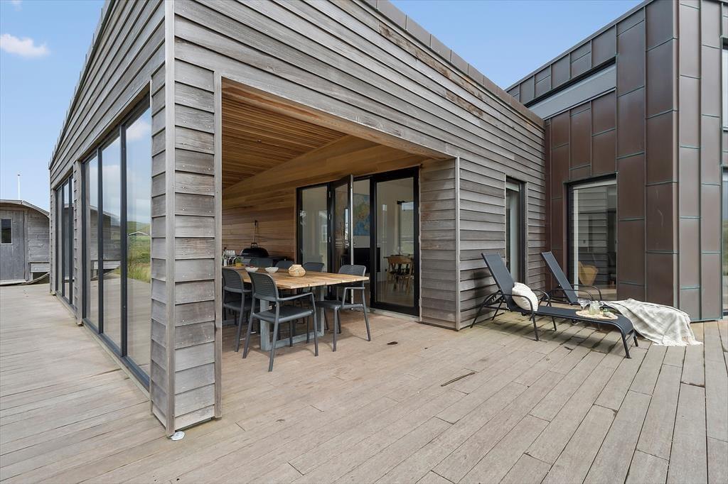 Ikke bare fra stue og aktivitetsrum, men også fra de fire soveværelser er der havedør ud til terrassemiljøet, så det er ingen sag at komme ud i det fri, når solen skinner. Fra spabadeværelset har du også direkte adgang til det udendørs wellnessmiljø, der består af en tøndesauna, en udebruser og et stort spabad. Det er den rene selvforkælelse at sidde her og koble helt af uanset årstiden. Et stort og åbent terrasseareal breder sig syd for sommerhuset, og mod vest venter en overdækket terrasse, hvor I uden problemer kan sidde alle sammen med udsigt til klitterne og det fredfyldte sommerhusområde.