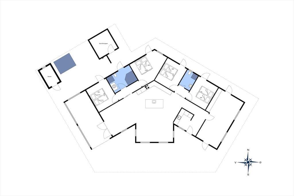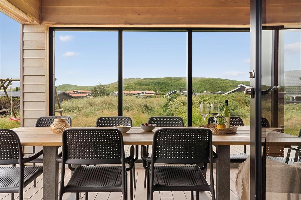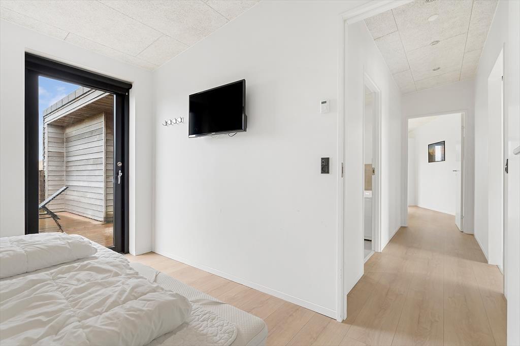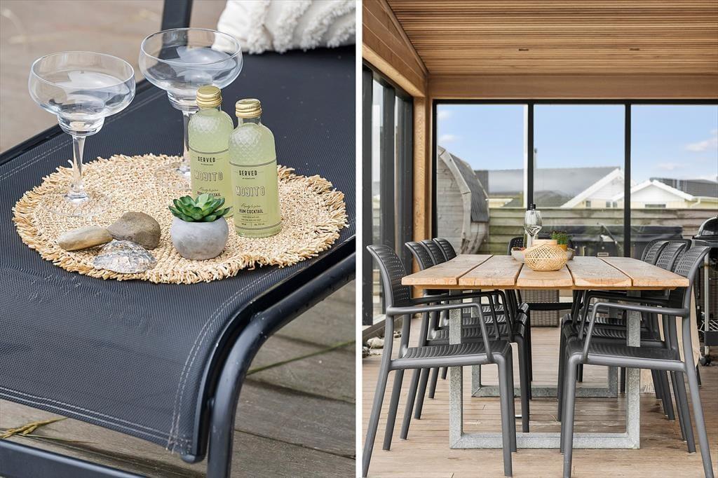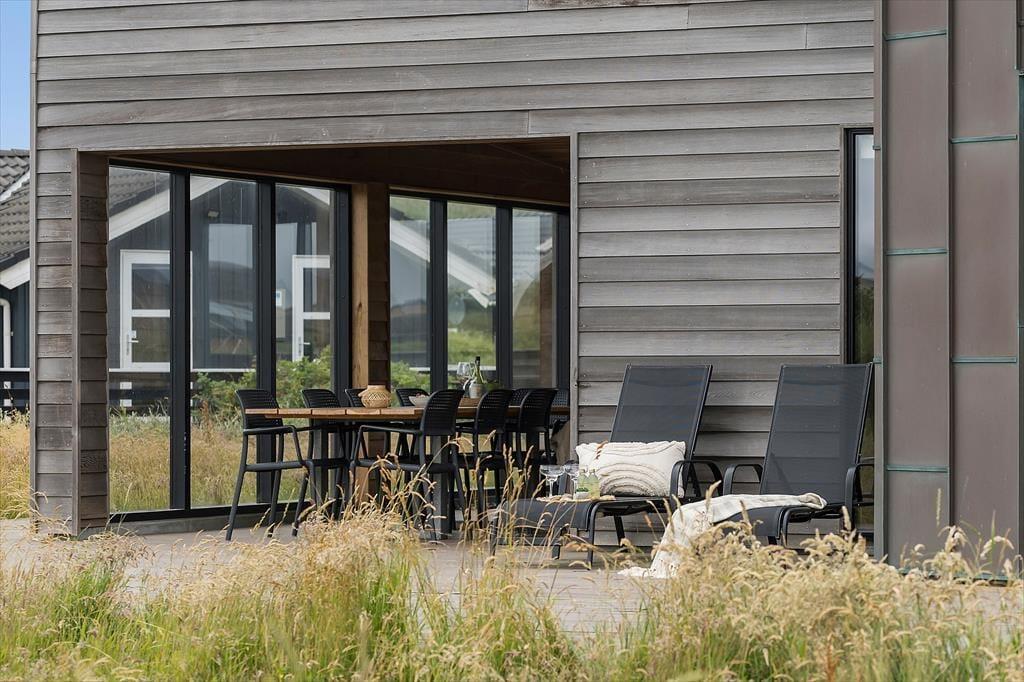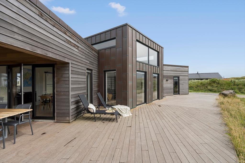 Ikke bare fra stue og aktivitetsrum, men også fra de fire soveværelser er der havedør ud til terrassemiljøet, så det er ingen sag at komme ud i det fri, når solen skinner. Fra spabadeværelset har du også direkte adgang til det udendørs wellnessmiljø, der består af en tøndesauna, en udebruser og et stort spabad. Det er den rene selvforkælelse at sidde her og koble helt af uanset årstiden. Et stort og åbent terrasseareal breder sig syd for sommerhuset, og mod vest venter en overdækket terrasse, hvor I uden problemer kan sidde alle sammen med udsigt til klitterne og det fredfyldte sommerhusområde.