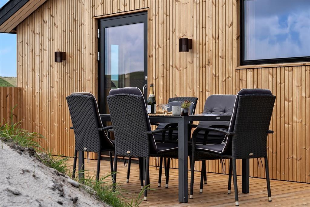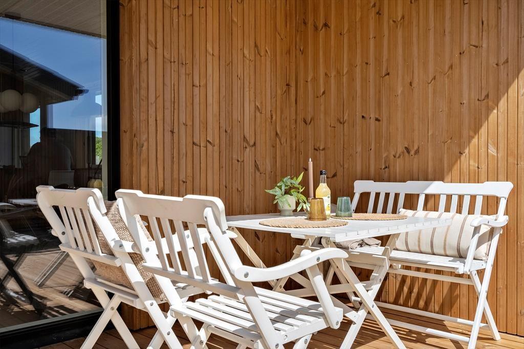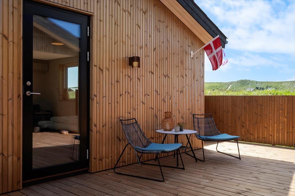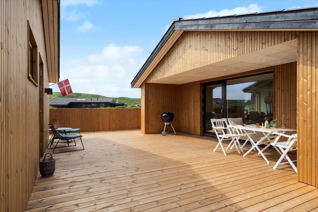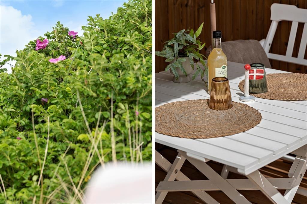 Imellem hovedhuset og annekset venter en skøn terrasse, som på én gang føles privat og åben mod naturen. Den er delvist overdækket og læfyldt, så du kan nyde morgenkaffen under åben himmel og afslutte dagen med grill og stearinlys – også selvom vinden tager fat. Den store naturgrund giver masser af plads til leg, boldspil og afslapning i liggestolen, mens du nyder fuglesangen og duften af hav og marehalm. Terrassen og dele af haven er indhegnet, så familiens firbenede ven trygt kan være med i ferieglæderne.
