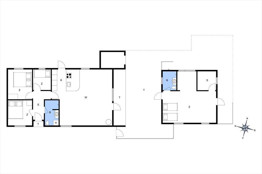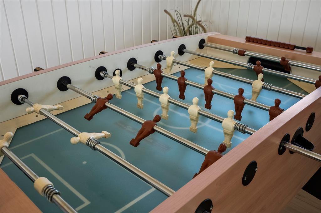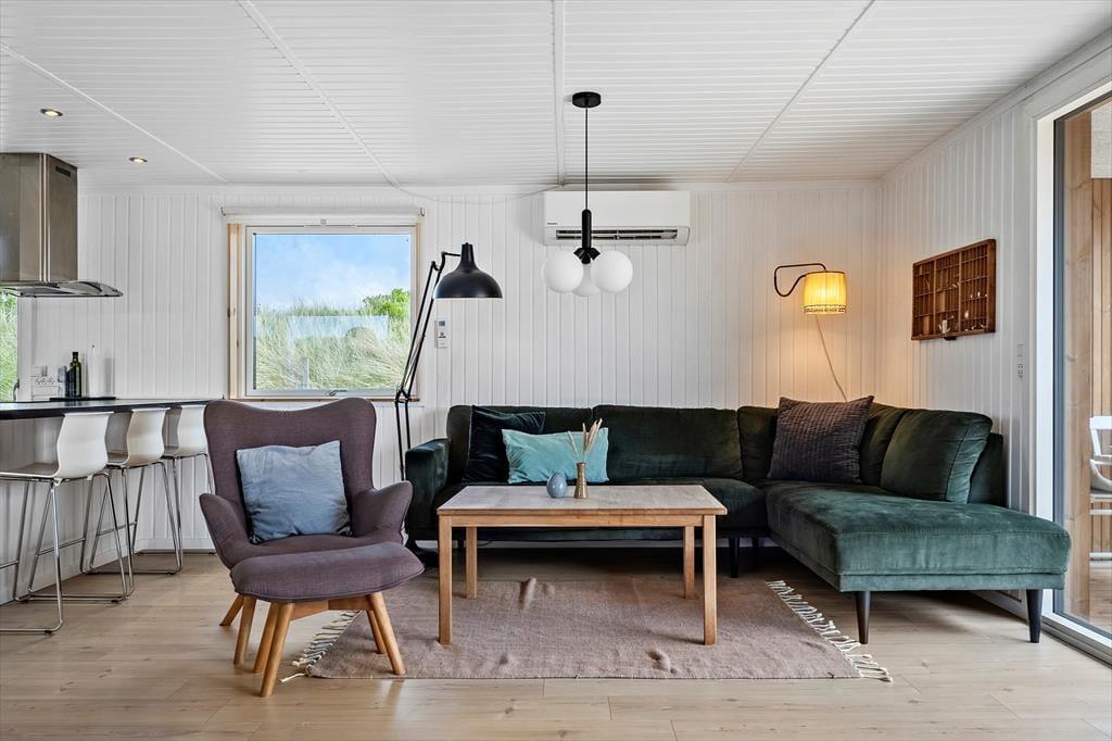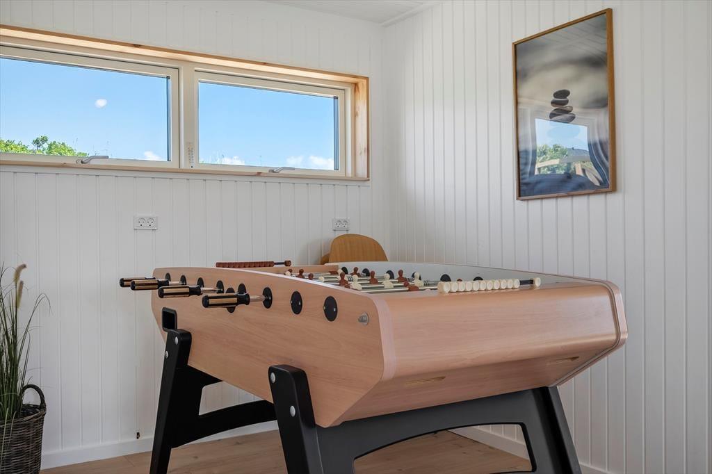 Når du træder ind i det lyse sommerhus, mærker du straks roen sænke sig. De store vinduespartier inviterer det naturlige lys indenfor og giver dig udsigt til klitter og natur. Indretningen er moderne og gennemtænkt – her er både plads til fællesskab og små åndehuller. I det åbne køkken-alrum kan du følge med i madlavningen, mens børnene spiller spil ved spisebordet, og brændeovnens knitren skaber en lun og hyggelig atmosfære. Annekset er ideelt til teenagebørn, bedsteforældre eller par, der ønsker lidt ekstra privatliv – med både soveværelse, eget badeværelse og en sauna til de kølige dage. Her finder du også aktivitetsrum med bordfodbold, dart og tv, så der er lagt op til venskabelig familie-konkurrence og afslappende aftener.