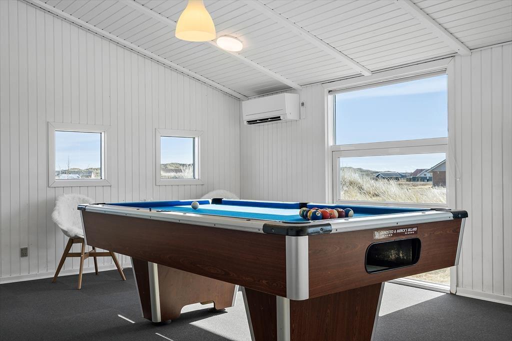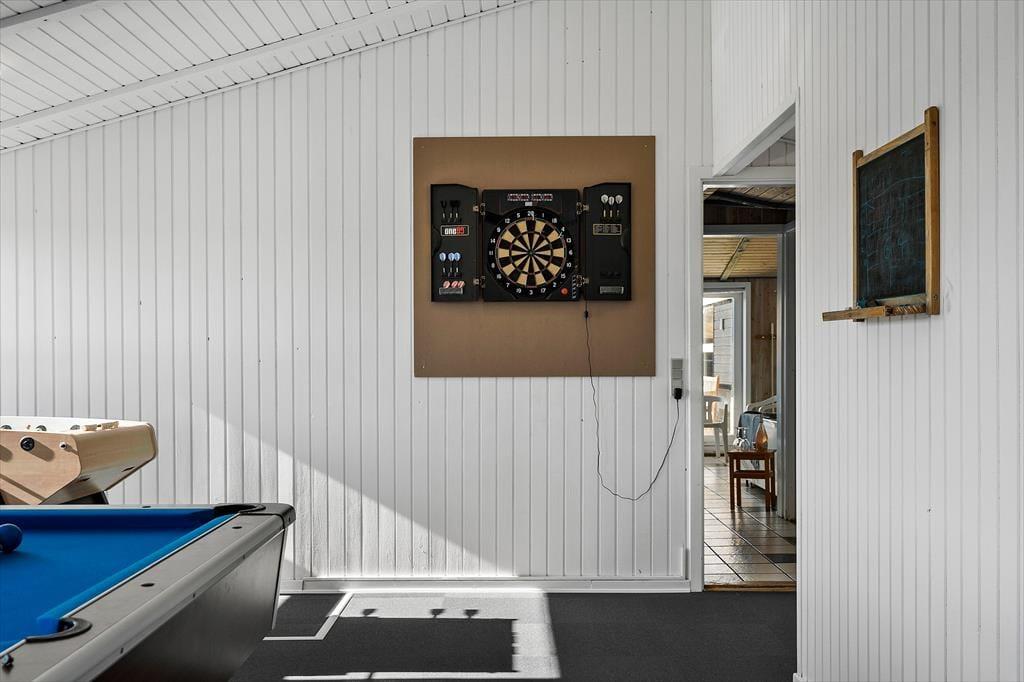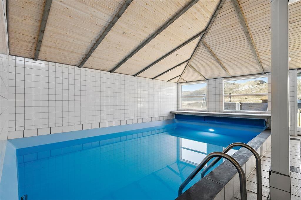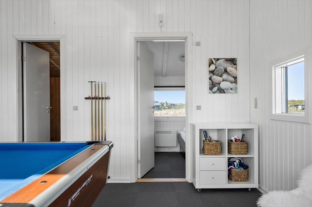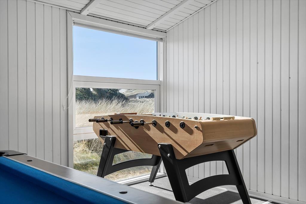 Med en velformet planløsning, der blandt andet byder på seks soveværelser og to badeværelser, får I en skøn ramme om ferielivet inden døre. Det ene badeværelse ligger ved poolafdelingen, hvor I kan koble af i spabadet eller svømme i den 21 m2 store swimmingpool med svømmetræner – og der er for øvrigt også en stor sauna, der kan give jer fornemmelsen af totalt velvære, når I vender hjem fra en blæsevejrsgåtur langs med Vesterhavet. I det store aktivitetsrum kan I lave turneringer i bordtennis, dart, bordfodbold og billard, mens stuen med brændeovn, fladskærms-tv og integreret køkken er det helt rette sted at samles til gode måltider, brætspil og hyggesnak.