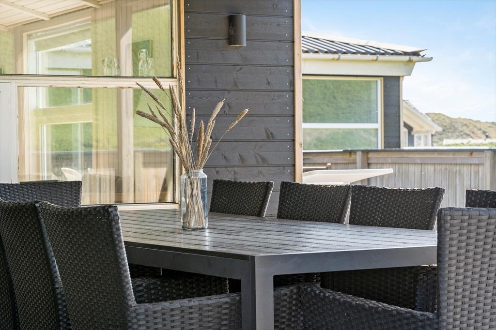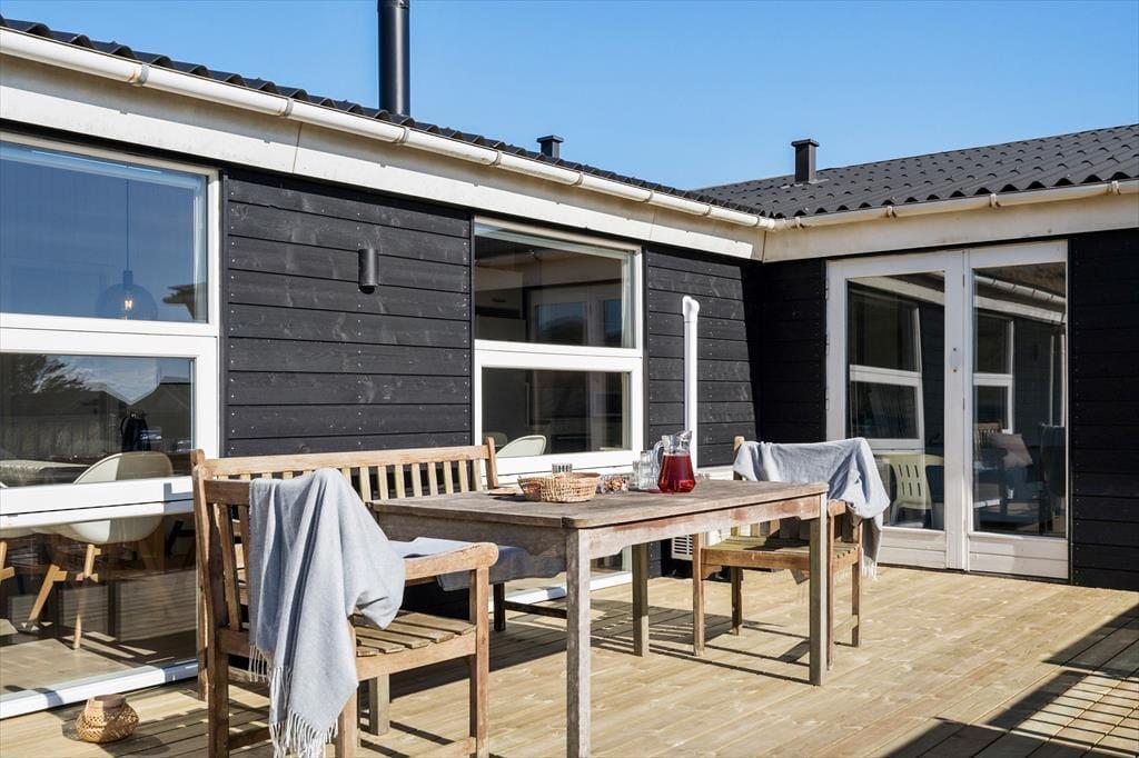 Sommerhuset ligger på en stor klitgrund i bare anden række til stranden – så mon ikke I kan mærke den friske havluft og nærheden til vandet, når I slapper af på det sydvestvendte terrasseområde. Mod vest er en del af terrassen overdækket, og et hegn skærmer hele opholdsarealet af, så både børn og hunde kan hygge sig i trygge rammer.