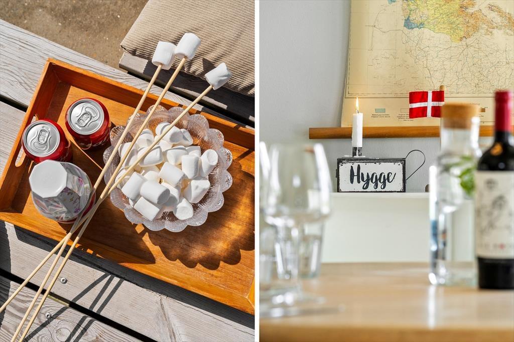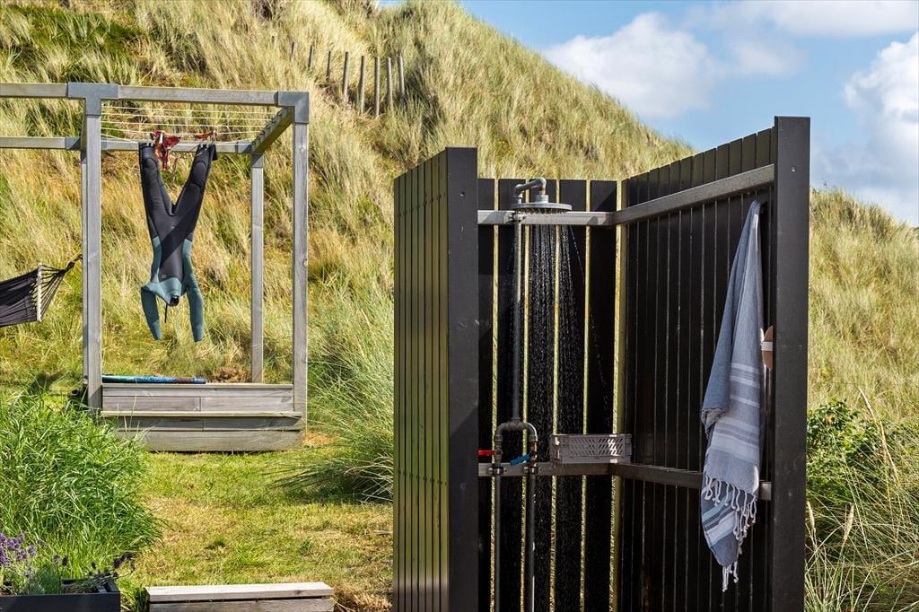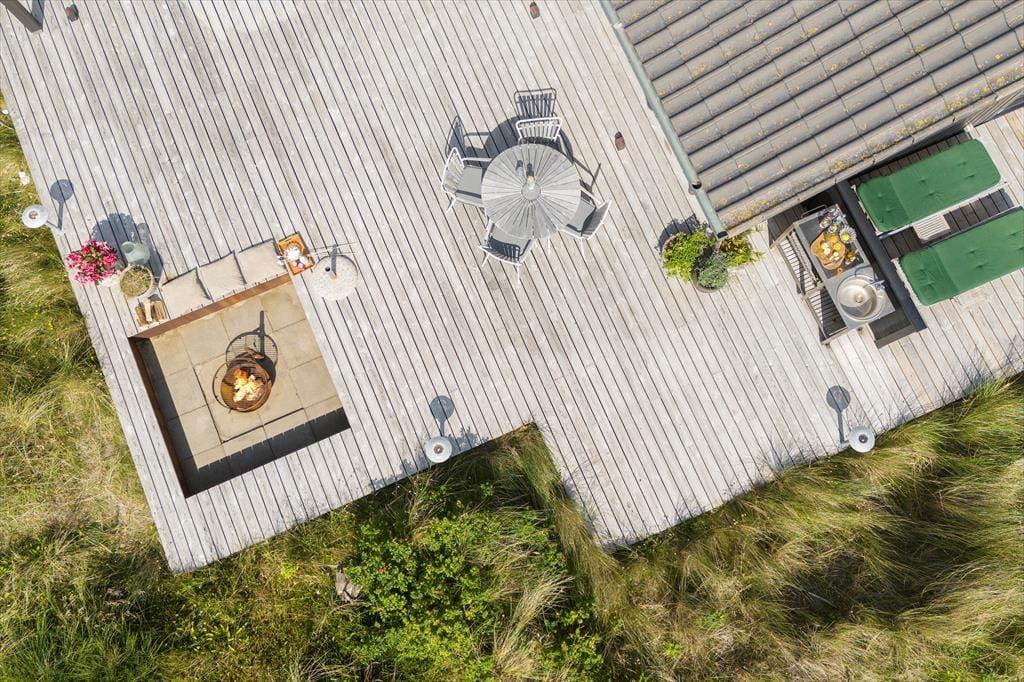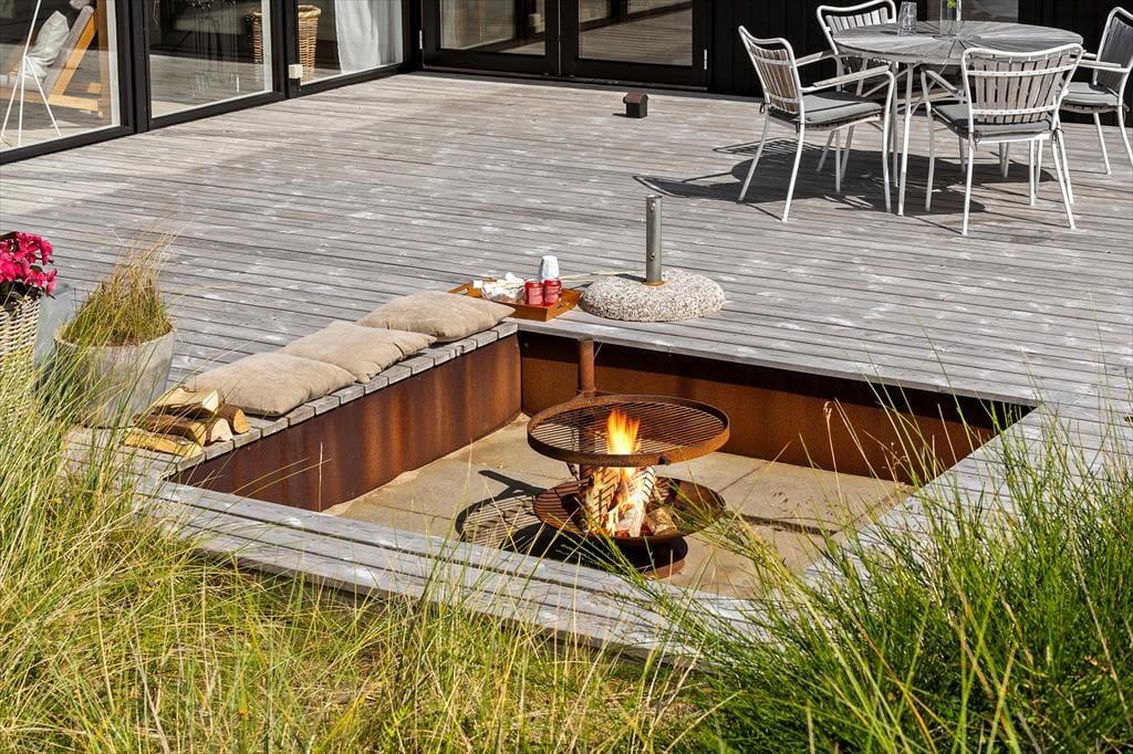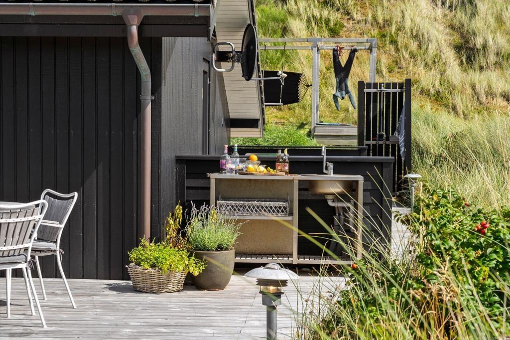 På kølige årstider er det fristende at blive inde nær brændeovnen og stuens fladskærms-tv, men når solen står højt på himlen, vil du sikkert hellere opholde dig på husets lækre terrasse: Udsigten over landskabet er blot endnu bedre herude, hvor dine andre sanser også vækkes af de vilde naturomgivelser. Selv en kop kaffe har det med at smage bedre, når du indtager den i det fri – og hvis du også vil spise under åben himmel, kan du glæde dig over, at der er både grill og udekøkken på terrassen. Udebruseren har både koldt og varmt vand, og i en nedsænkning på terrassen er der etableret en bålplads, hvor I kan riste skumfiduser eller bare nyde synet af flammerne.