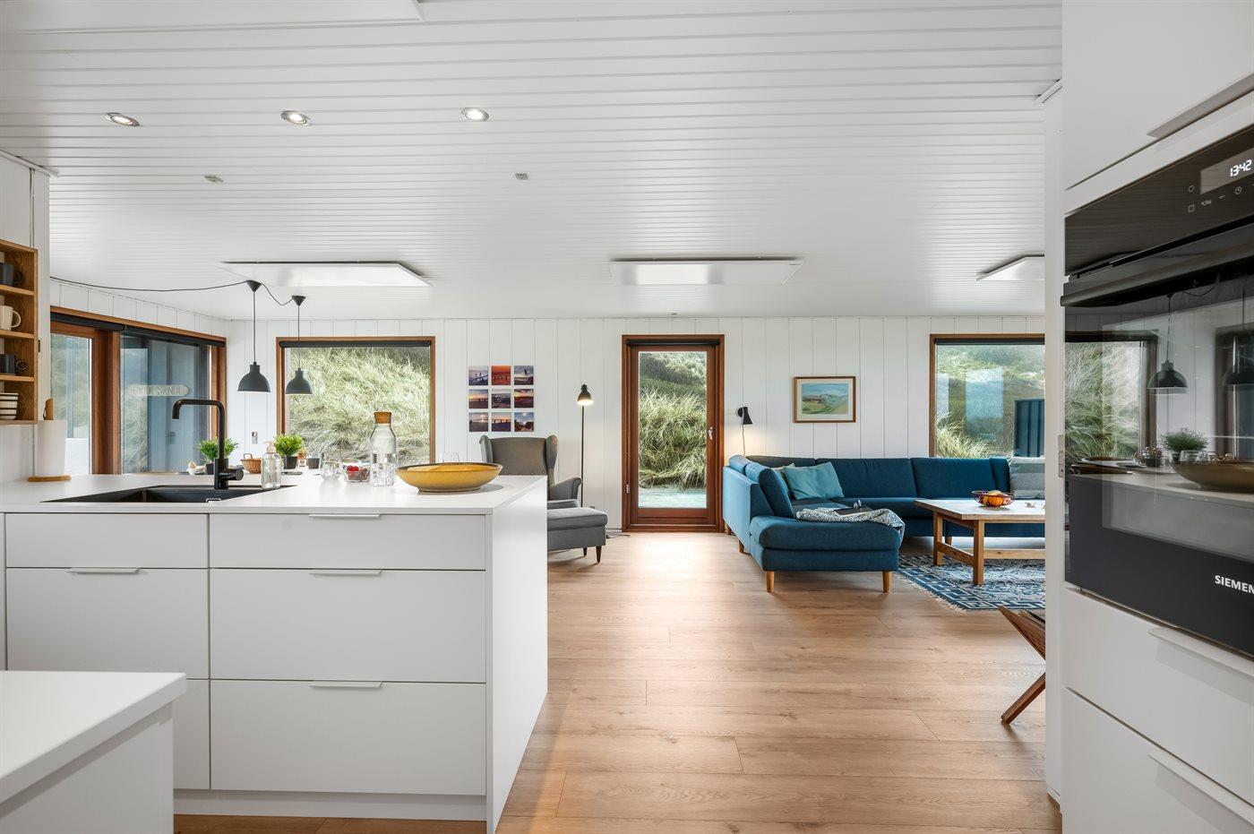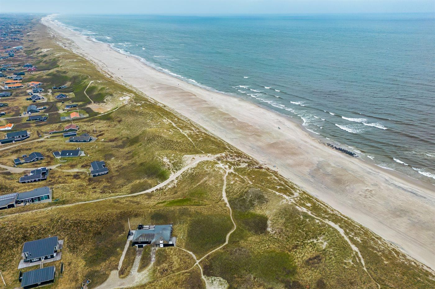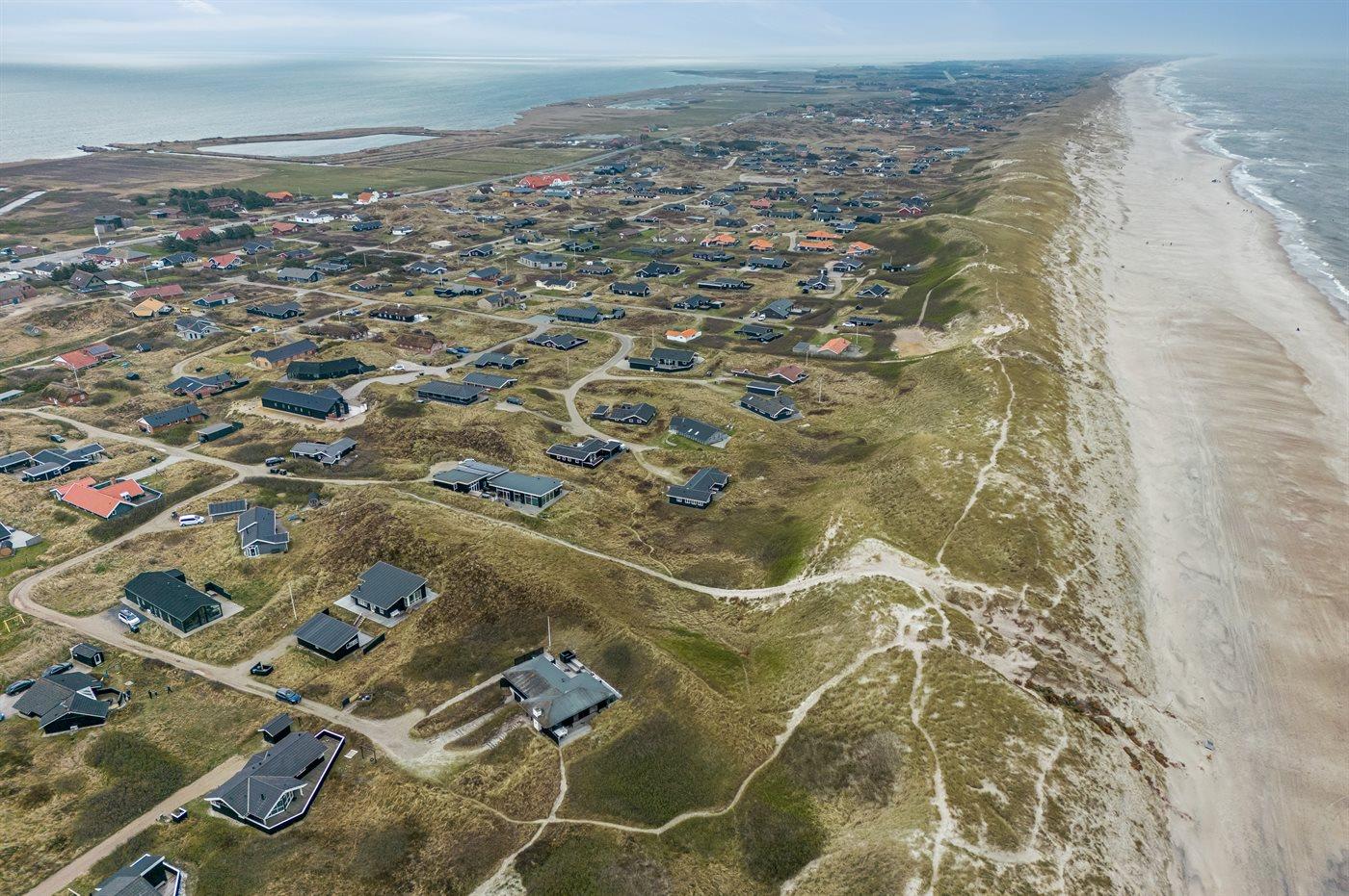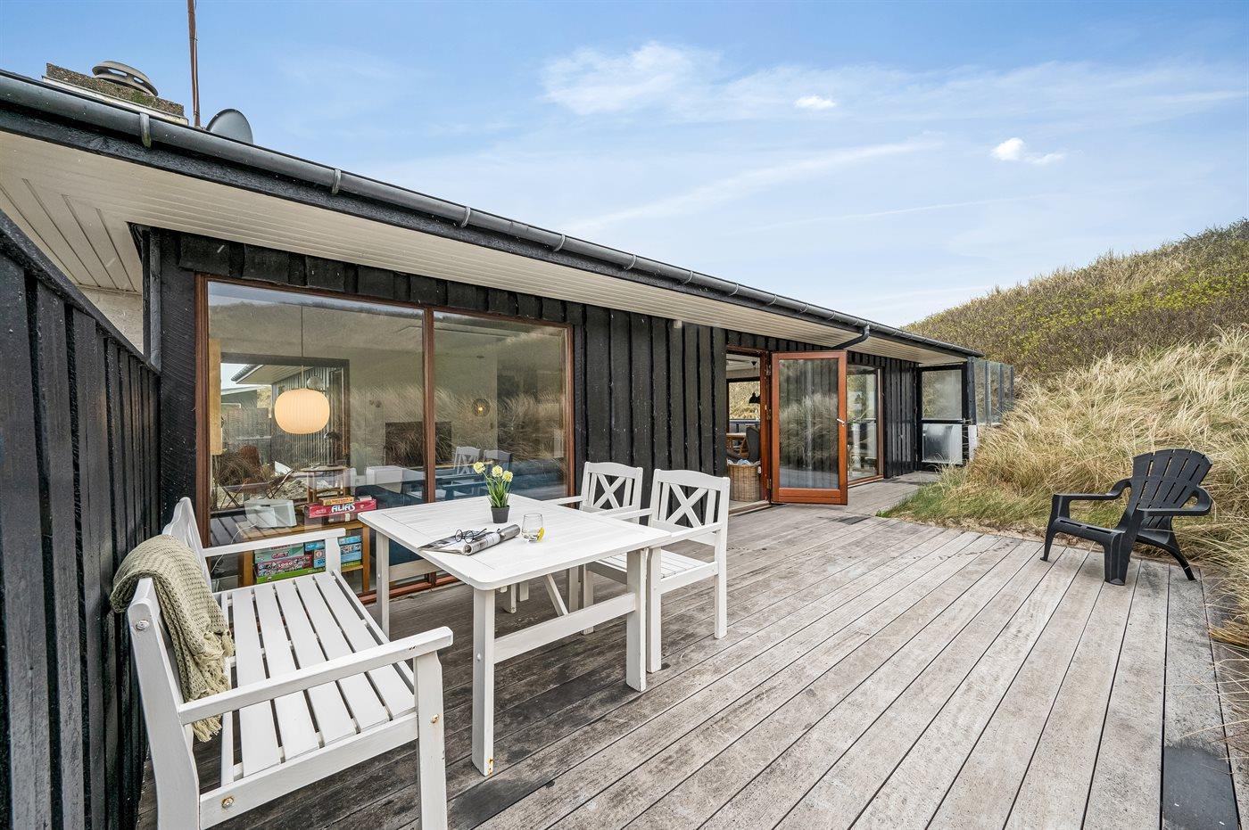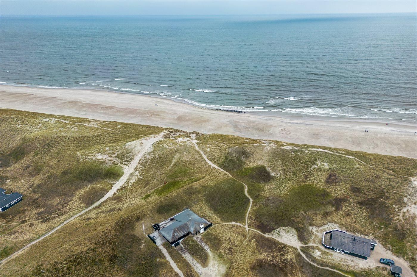 Huset er på 106 kvadratmeter og blev bygget i 1977. Siden har det gennemgået en større renovering. Huset ligger smukt og lidt for sig selv på en 8000 m2 stor klitgrund, kun 50 m fra Vesterhavet og 100 m fra Ringkøbing Fjord. Den nærmeste dagligvarebutik ligger 2000 m væk i den hyggelige havneby Hvide Sande. Her kan du shoppe, spise lækker mad, købe friske fisk, og opleve på det pulserende liv på havnen.