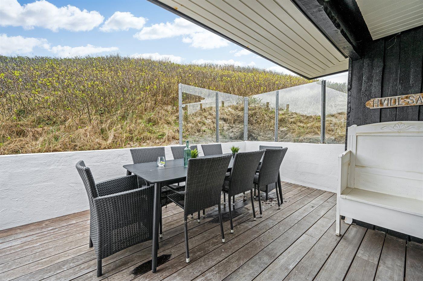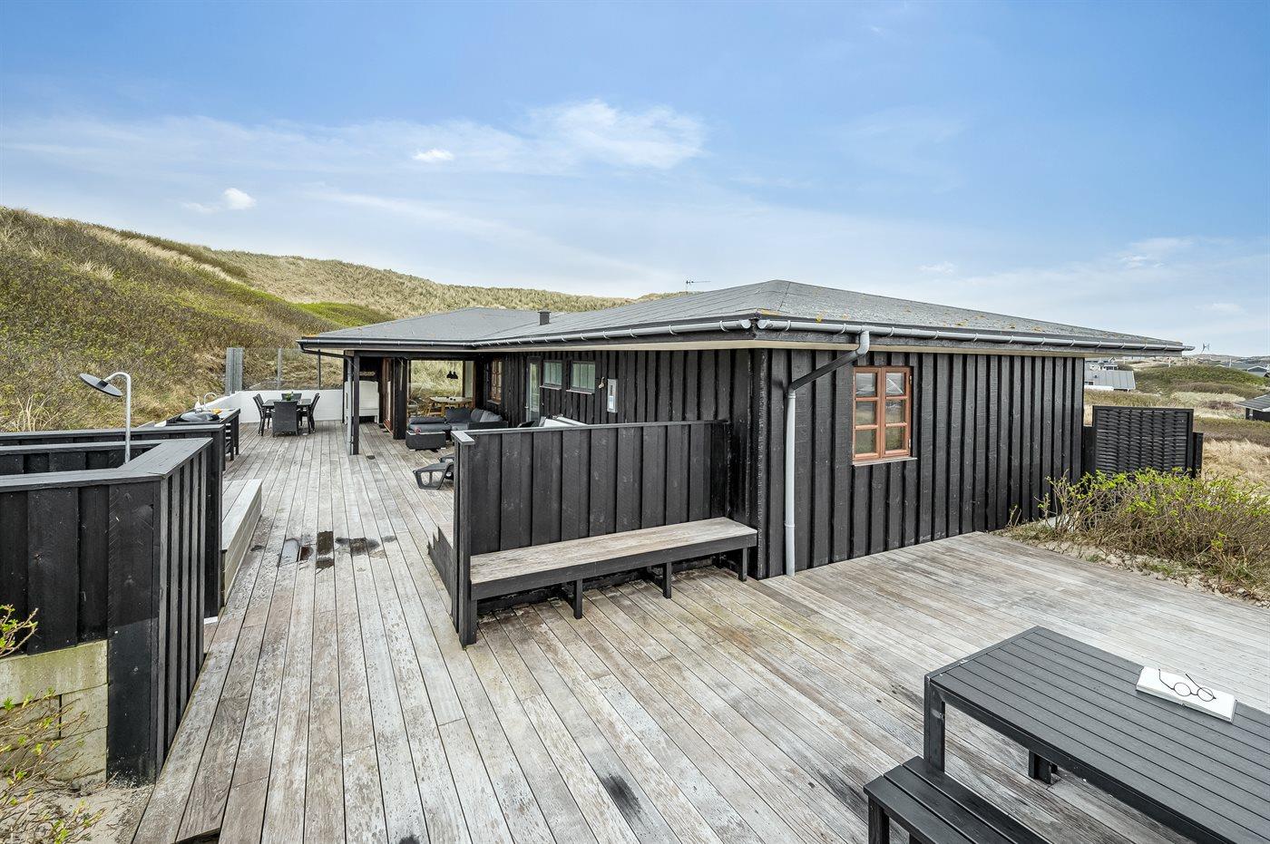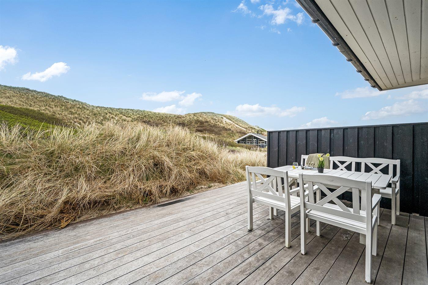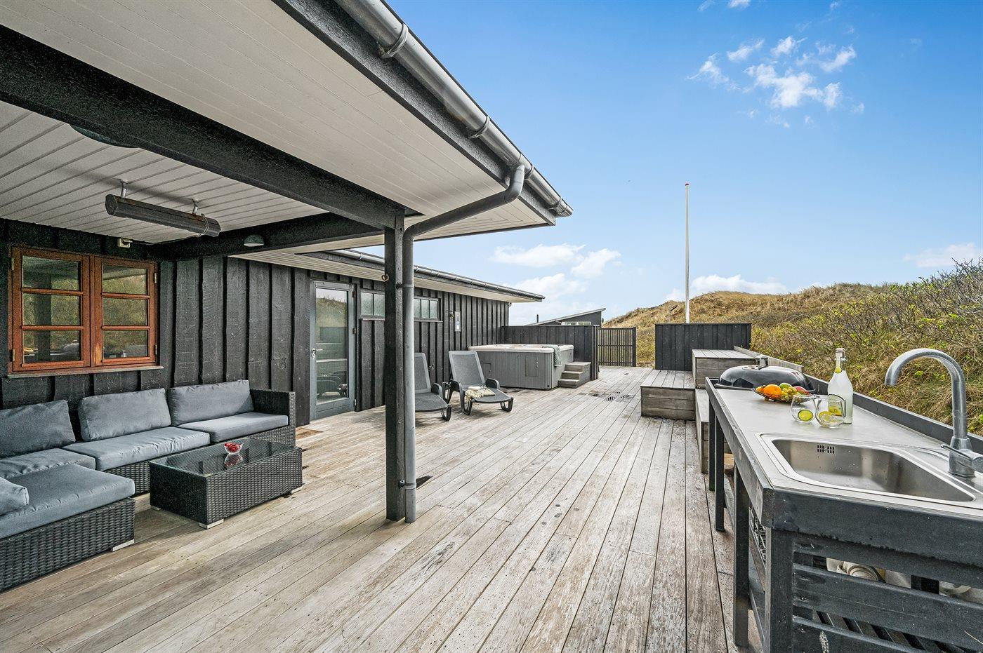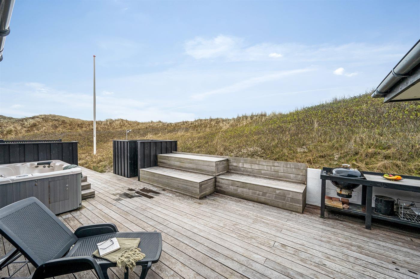 Fra den ugenerede og delvist overdækkede terrasse kan du nyde udsigten over landskabet. Og vil du for alvor skrue op for luksussen, skal du tænde for den udendørs spa. Dækket af det varme vand kan du slappe fuldstændig af, og om aftenen er der frit udsyn til den smukke, klare stjernehimmel. På terrassen finder du også en udendørs bruser, hvor du kan skylle saltvandet af kroppen og sandet af fødderne, når du har taget en dukkert i Vesterhavet. Du kan også vælge at tage dit morgenbad under åben himmel. Udendørsbruseren kan benyttes fra april til november.
