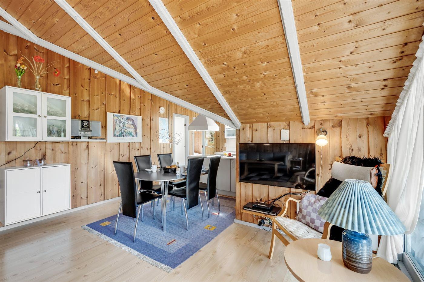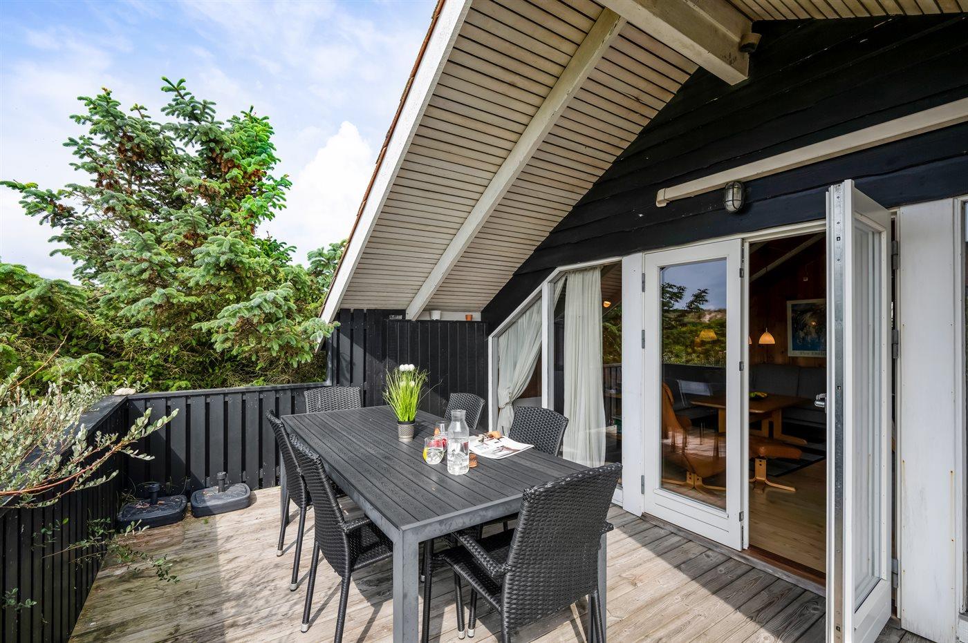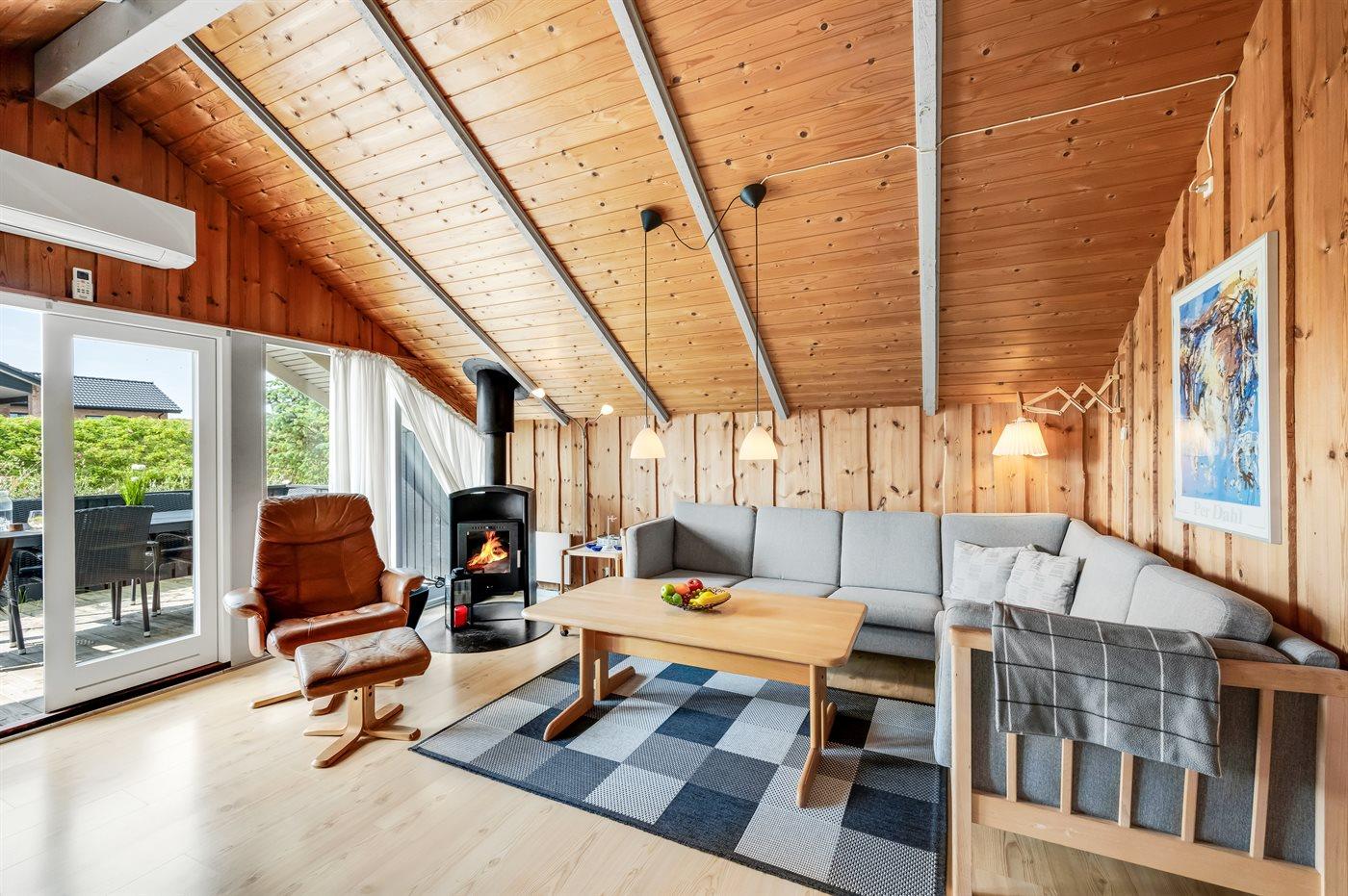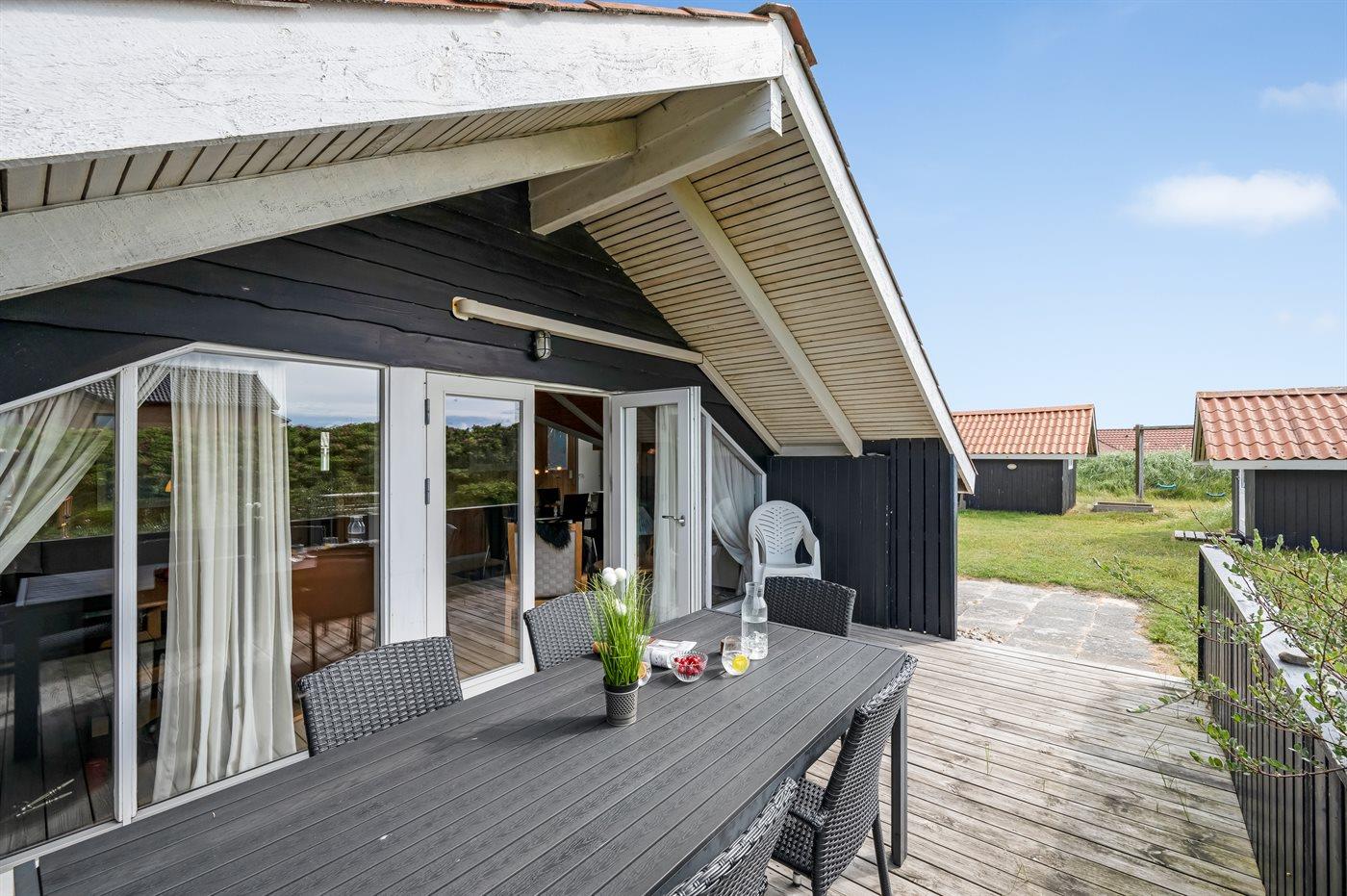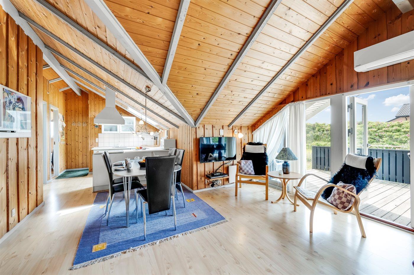 Det lyse og hyggelige køkken-alrum, indrettet i dansk stil, indbyder til hygge, afslapning og samvær. I den store komfortable sofa kan du slænge dig med en god bog samtidig med at du kan høre brændeovnen knitre i baggrunden. Gennem det store vinduesparti har du direkte adgang til den store og delvist overdækkede træterrasse og den smukke klitgrund. Her kan du med udsigt til klitterne slappe af, spille spil eller lege med hunden.