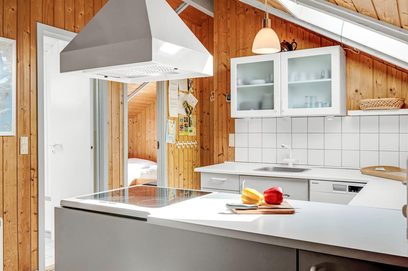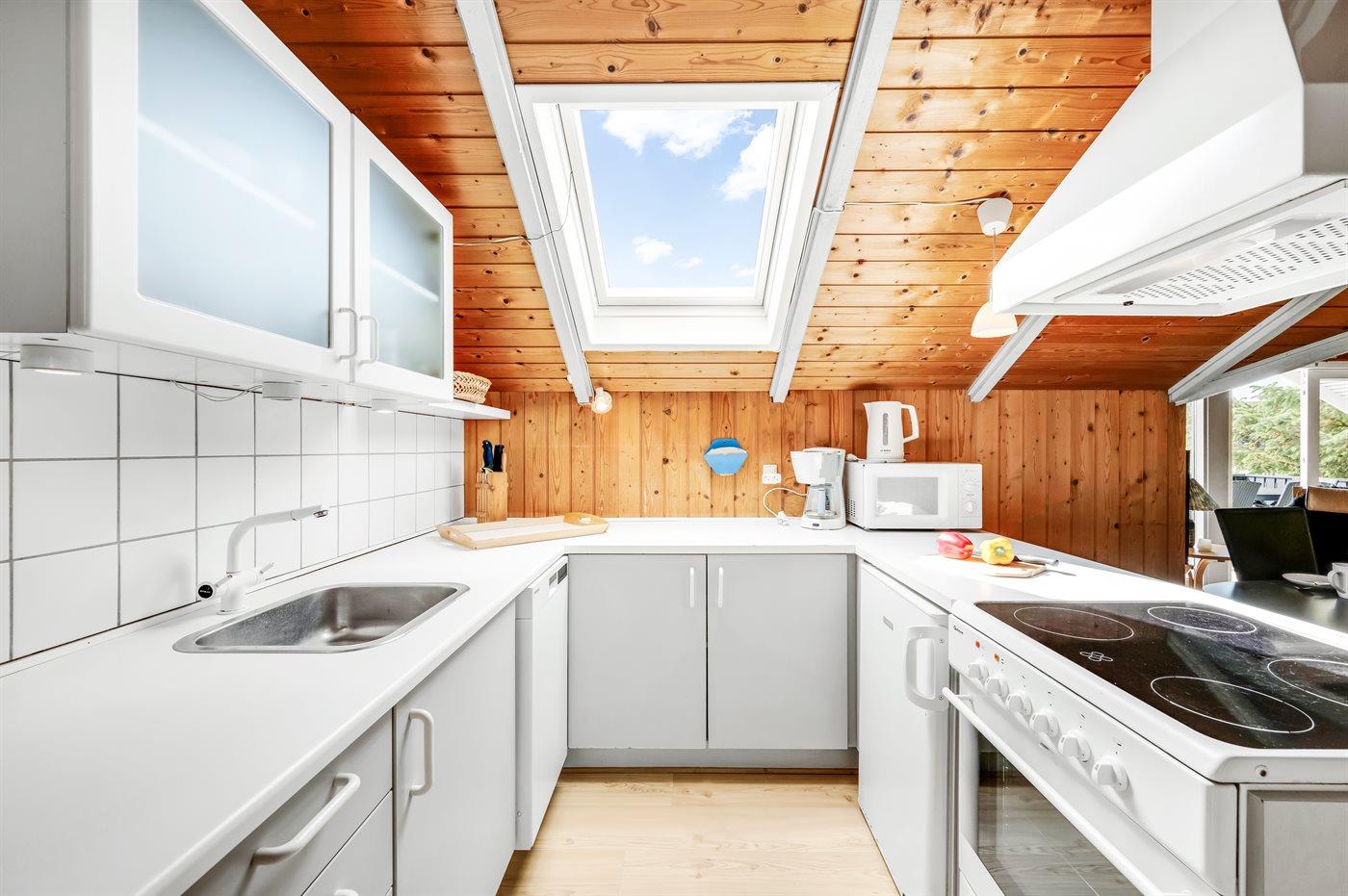 Køkkenet er udstyret med 1 køleskab. Der er 4 keramiske kogeplader, varmluftovn, mikrobølgeovn samt opvaskemaskine.
