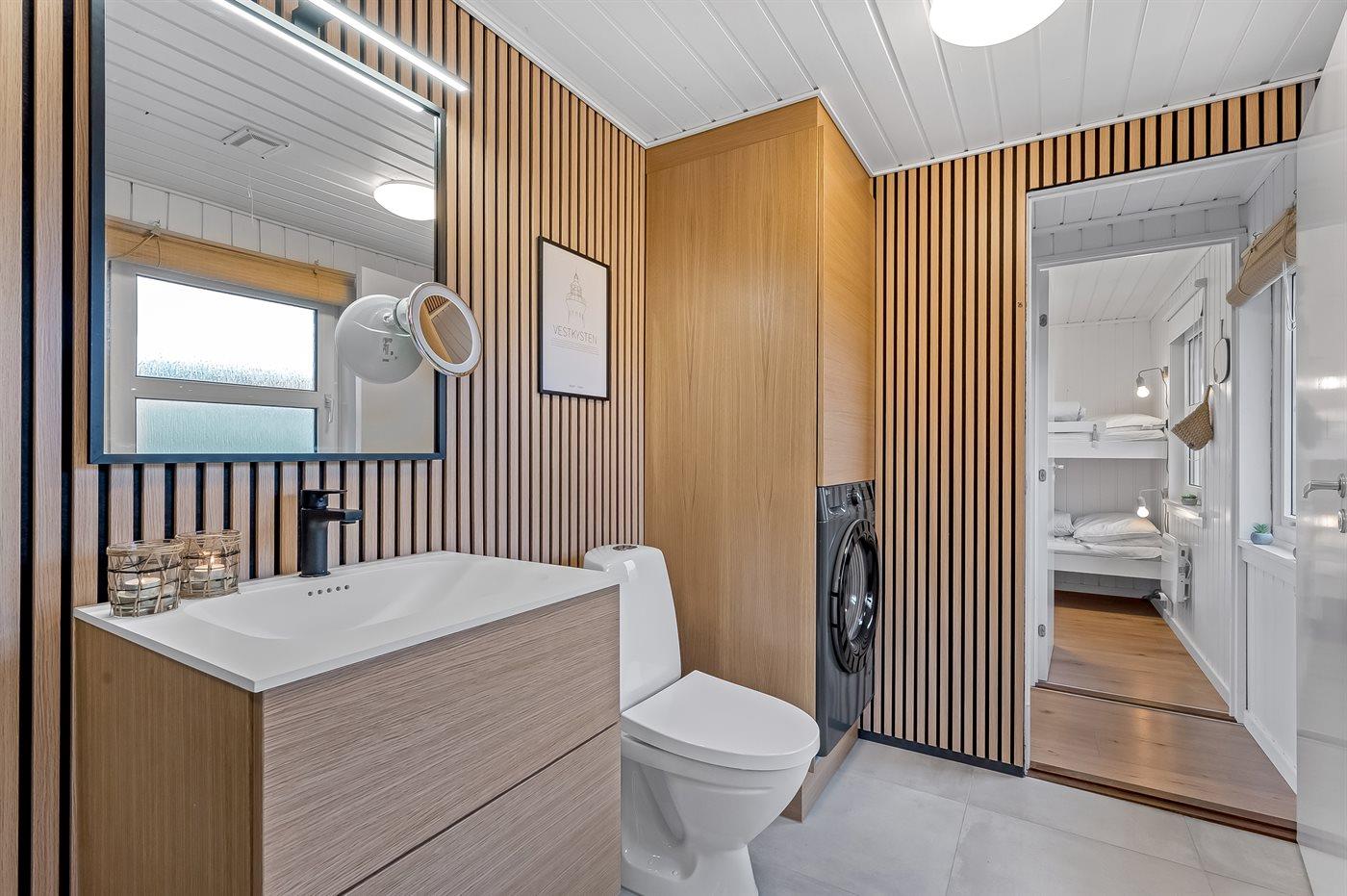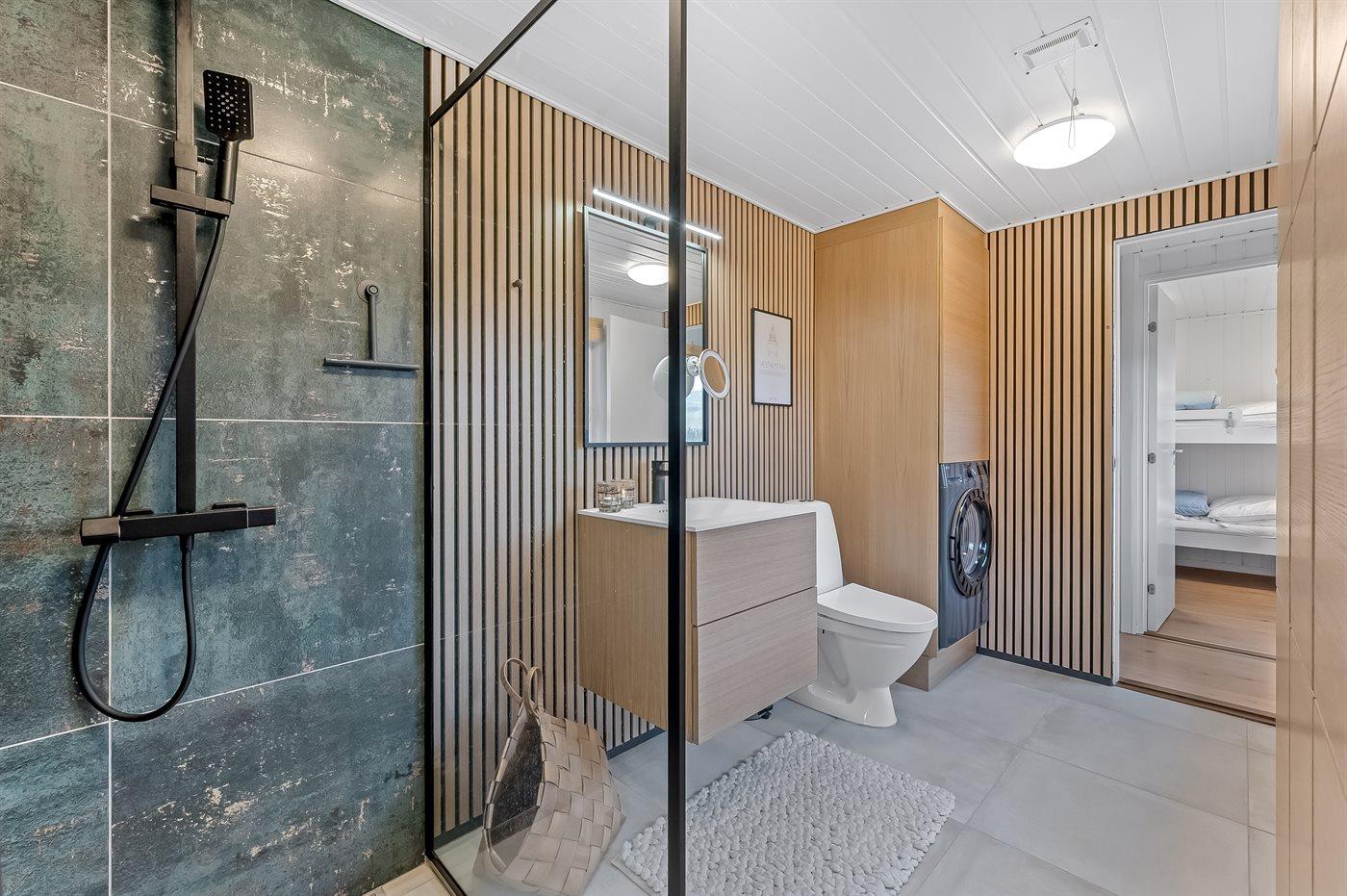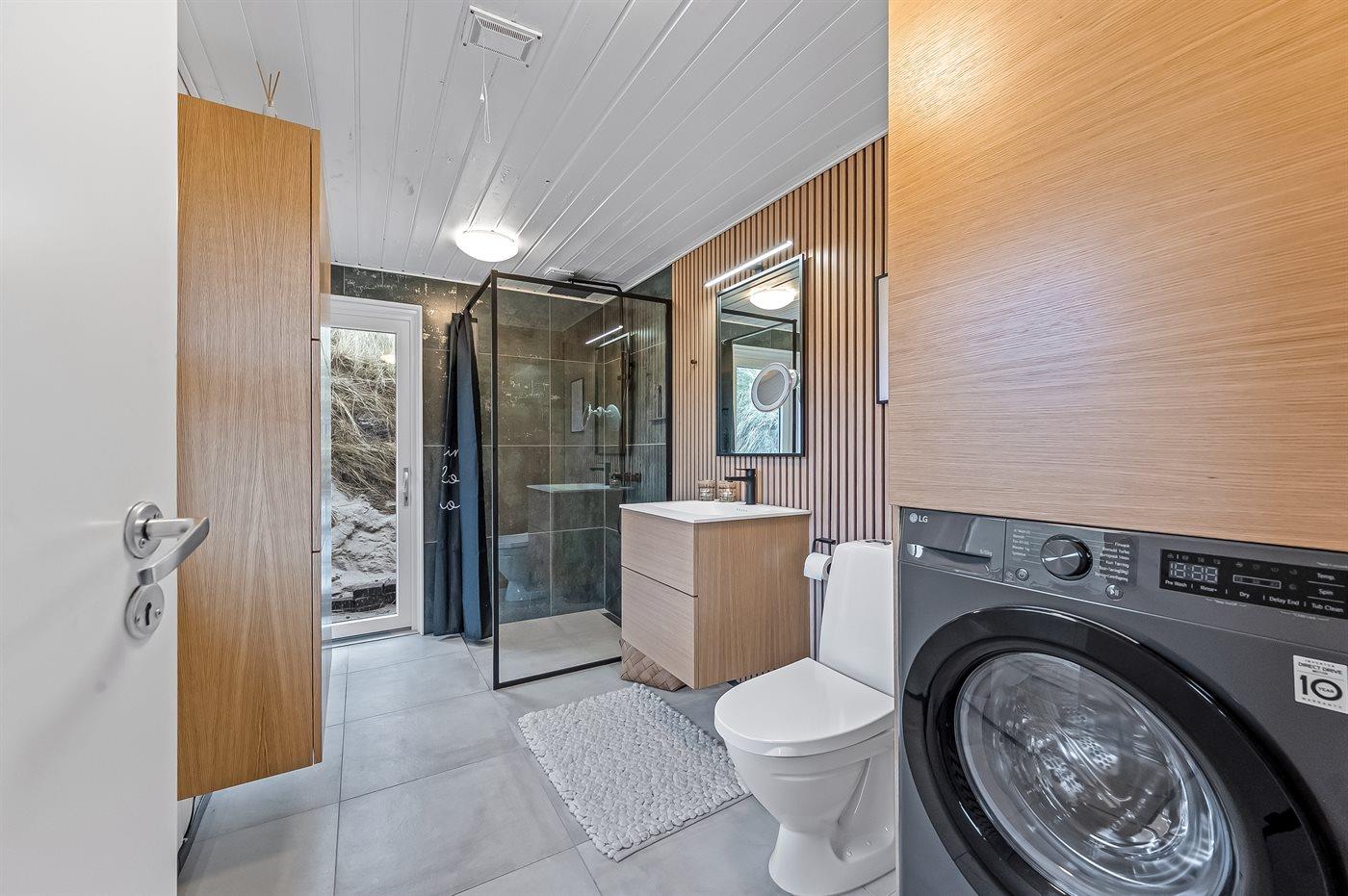 Der er 1 badeværelse med gulvvarme, bruseniche, toilet og vaskemaskine.