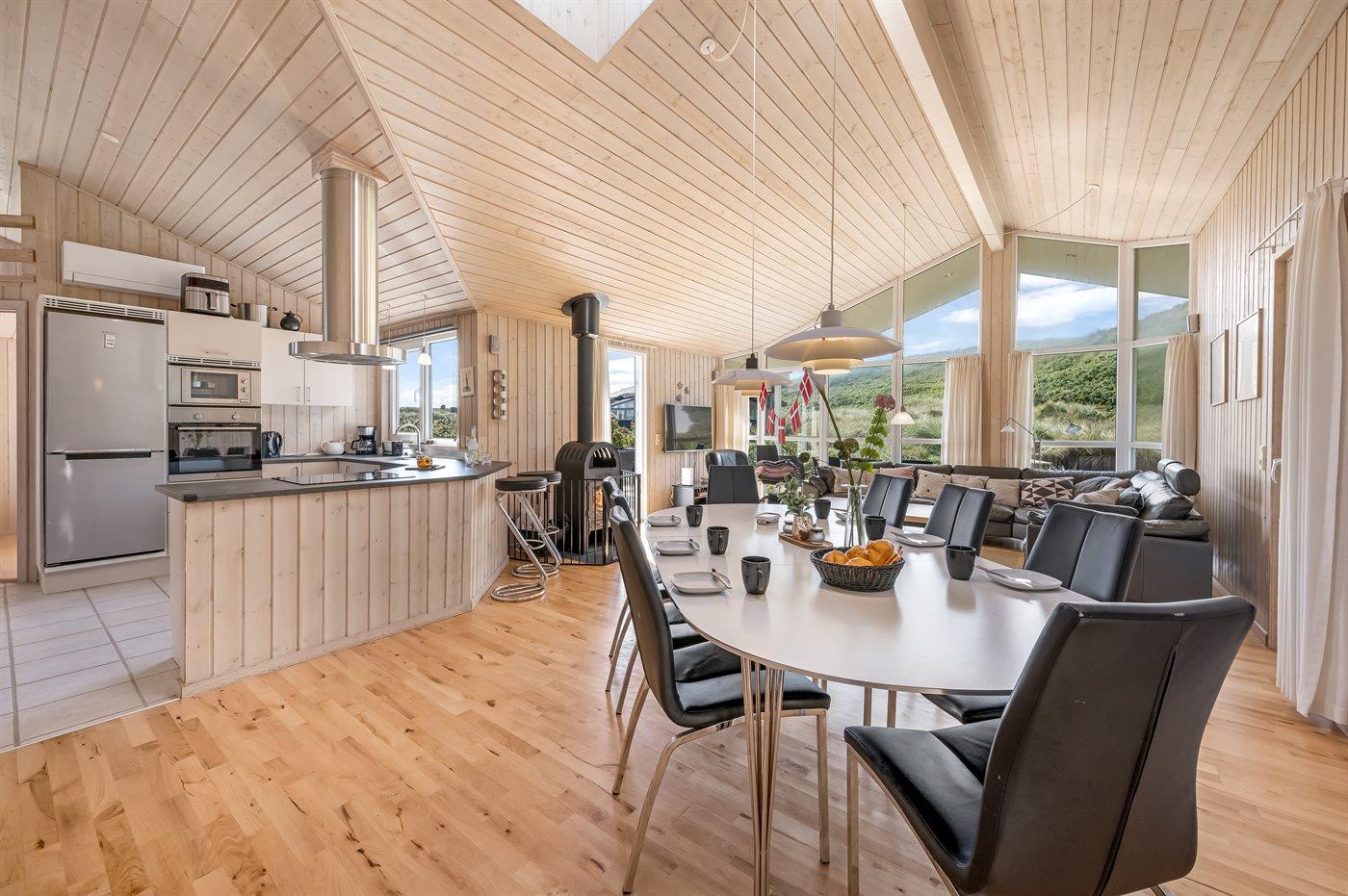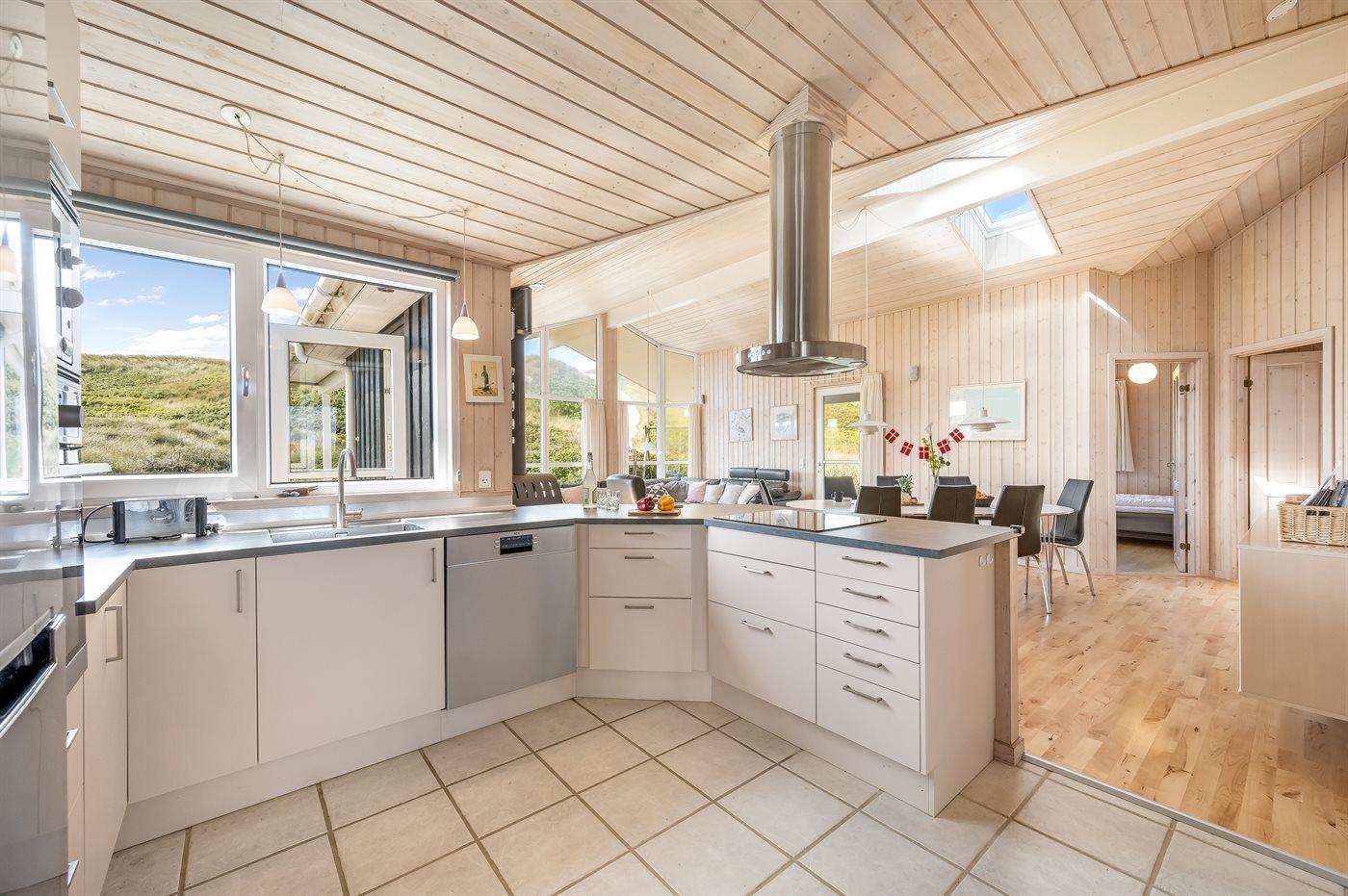Allerede når du kører ud imod dette smukke sommerhus fornemmer du den helt fantastiske beliggenhed. Men, den helt store wauw-oplevelse får du, når du har sat taskerne i det store bryggers og træder ind i det store og lyse køkken-alrum. Du får en oplevelse af at du befinder dig midt ude i naturen – midt i det smukke klitlandskab - selvom du står inde i sommerhuset. Når du sidder på terrassen en varm sommerdag eller en lun forårsaften, er det som at sidde midt i det smukke klitlandskab med lyden af Vesterhavets brusen i baggrunden. Er du trukket indenfor, er du takket være de store vinduespartier stadigvæk i tæt kontakt med naturen.