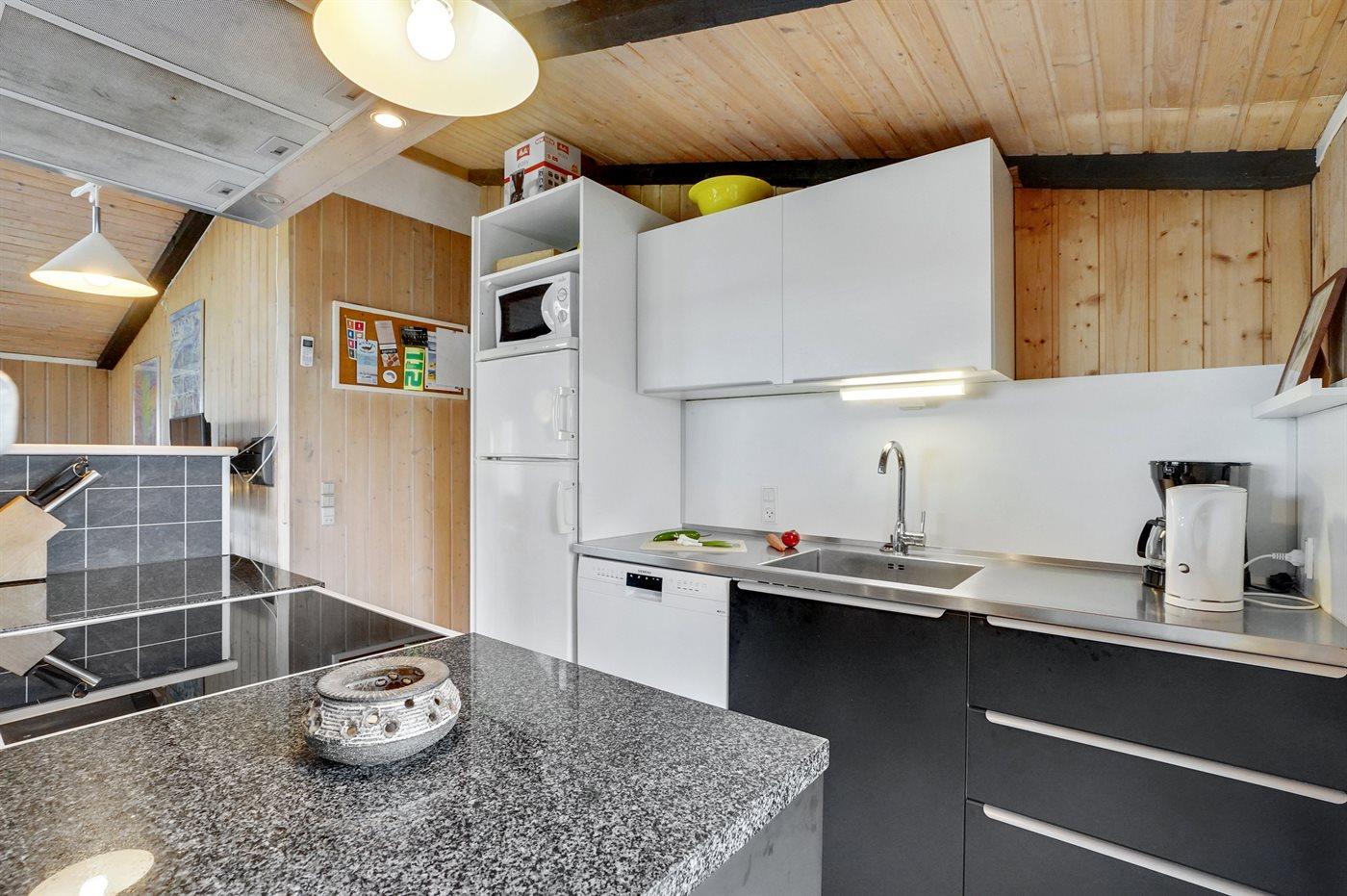 Køkkenet er udstyret med 1 køleskab. Der er 4 keramiske kogeplader, varmluftovn, mikrobølgeovn samt opvaskemaskine.