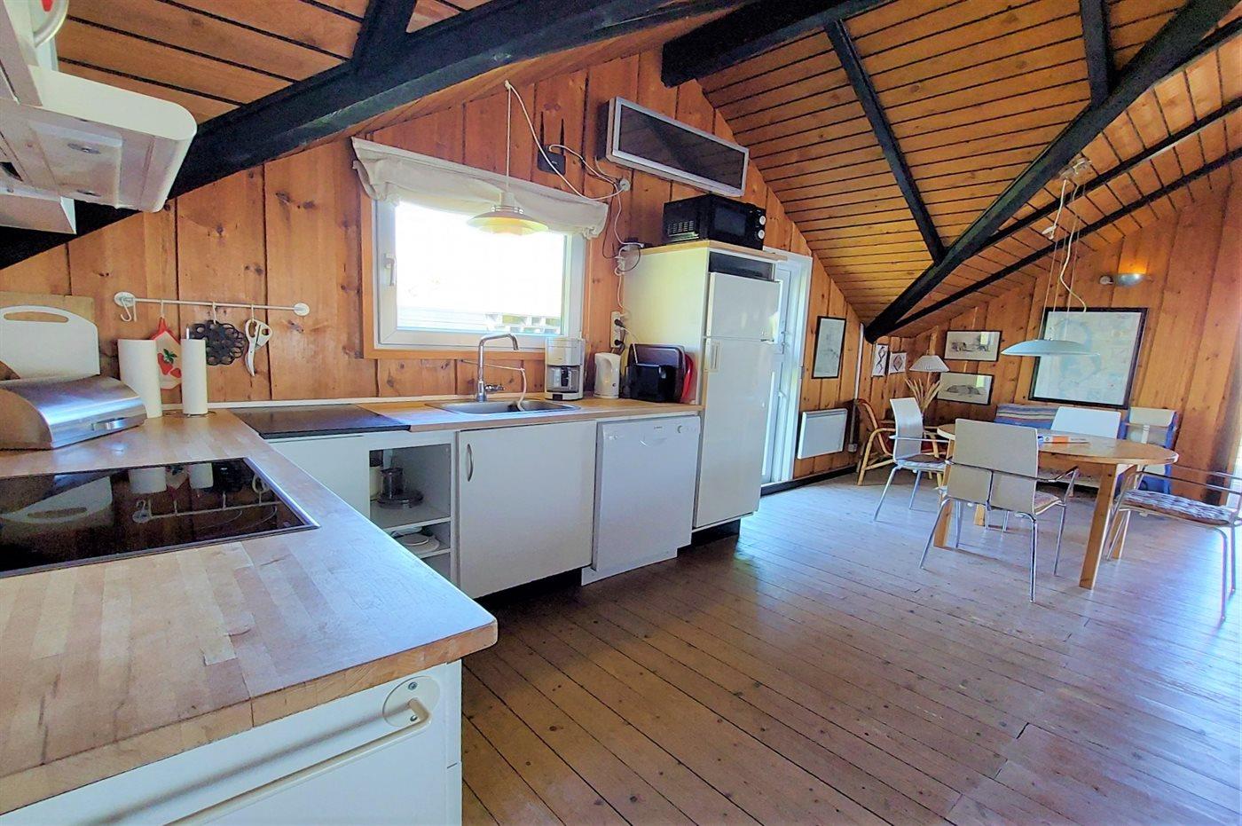 Køkkenet er udstyret med 1 køleskab. Der er 4 keramiske kogeplader, varmluftovn, mikrobølgeovn samt opvaskemaskine.