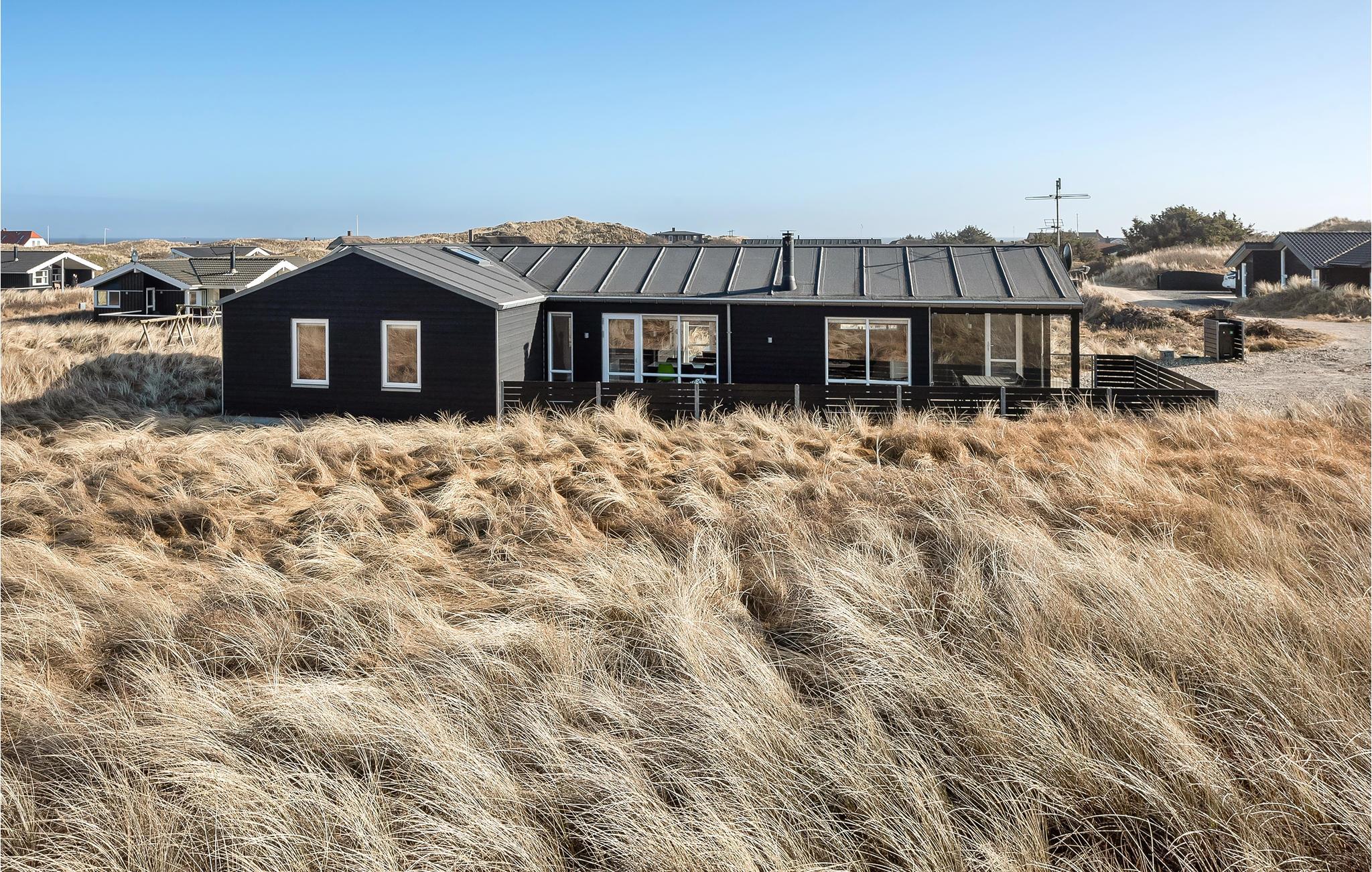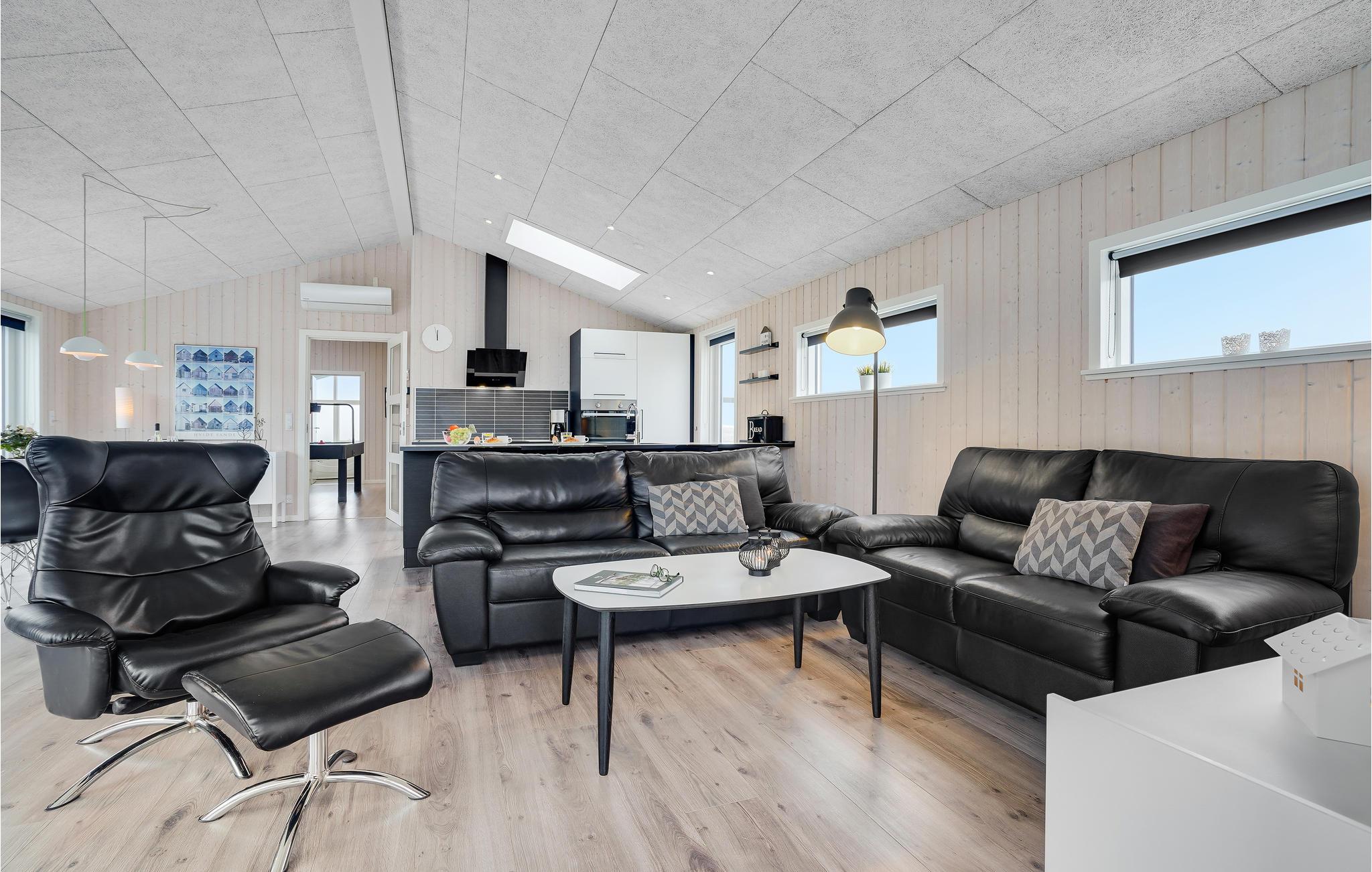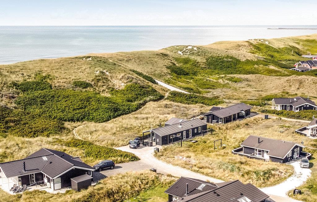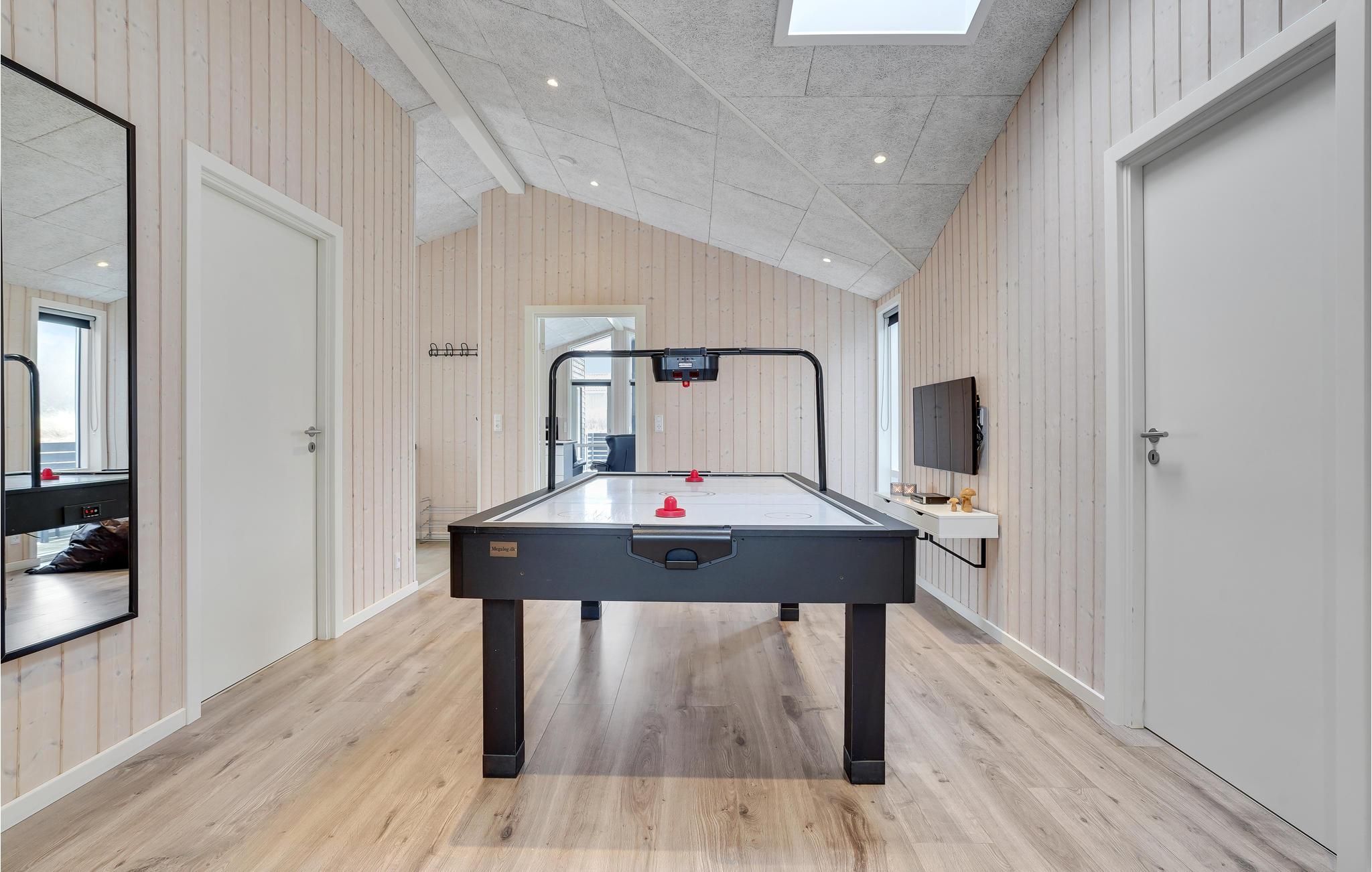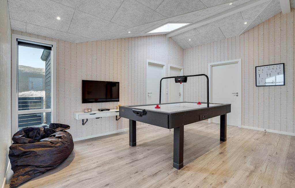 Moderne sommerhus ved Vesterhavet med sauna, spabad og aktivitetsrum til en afslappende ferie.