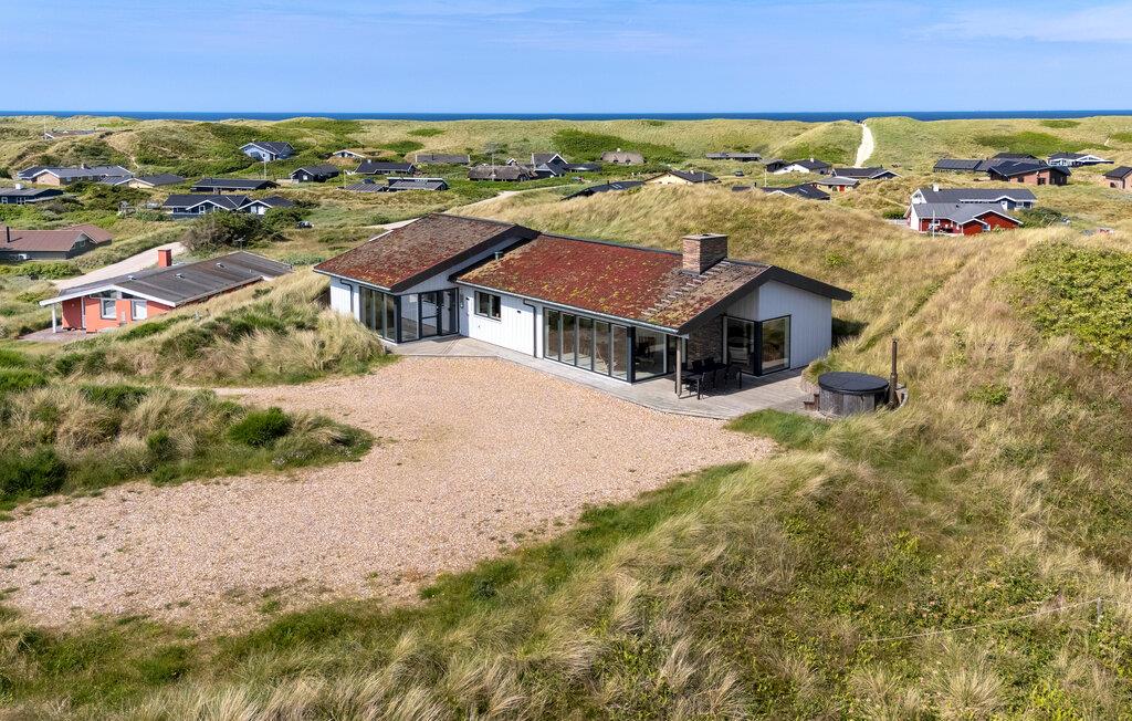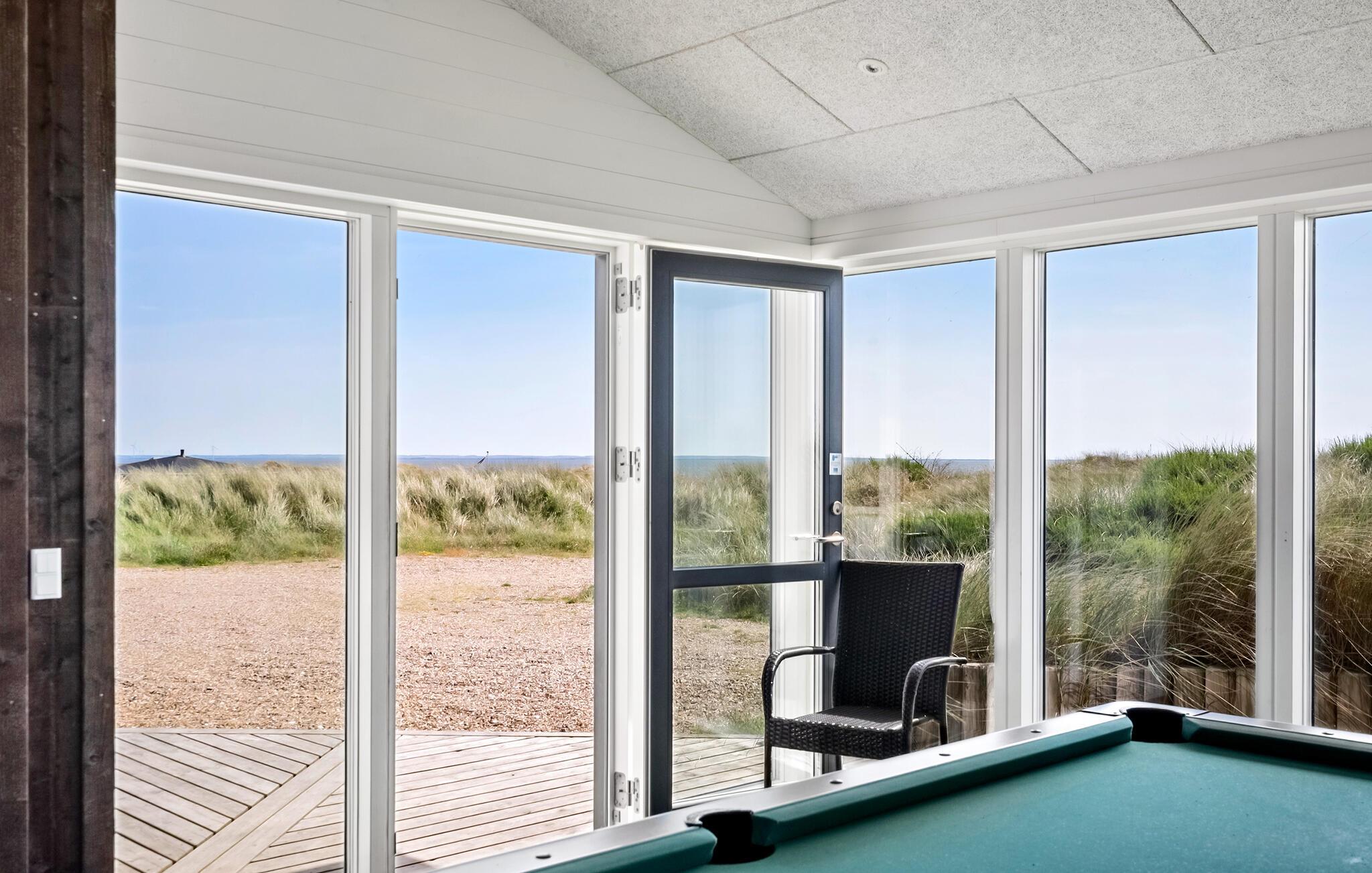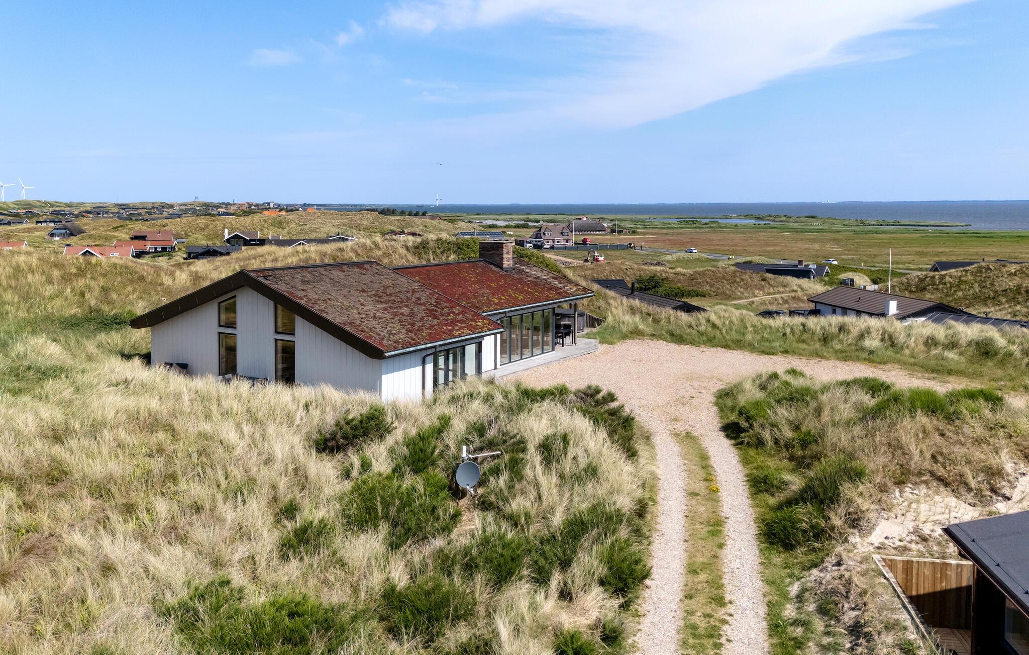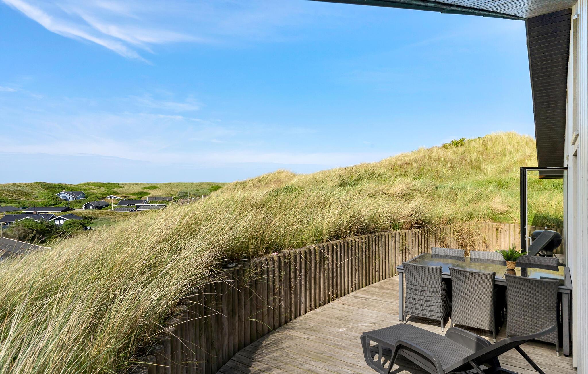 Nyd ferien i jeres feriehus, som takket være sin førsteklasses beliggenhed blandt klitterne giver jer uhindret udsigt helt ned til Vesterhavet. Huset kombinerer moderne bekvemmeligheder med en hyggelig atmosfære, der sørger det bedste betingelser for afslapning og hyggelige aktiviteter. Find jer til rette i den rummelige opholdsstue med brændeovn og store vinduer. Lad blikket vandre over landskabet, slap af i de komfortable sofaer eller læs en bog i en af ??lænestolene med udsigt. Den åbne spiseplads med masser af naturligt lys og udsigt over naturen er det optimale sted til fælles måltider. Tilbered lækre retter med havudsigt i det moderne, åbne køkken. Aktivitetsrummet med billardbord sørger for underholdning, mens saunaen lægger op til at slappe af.