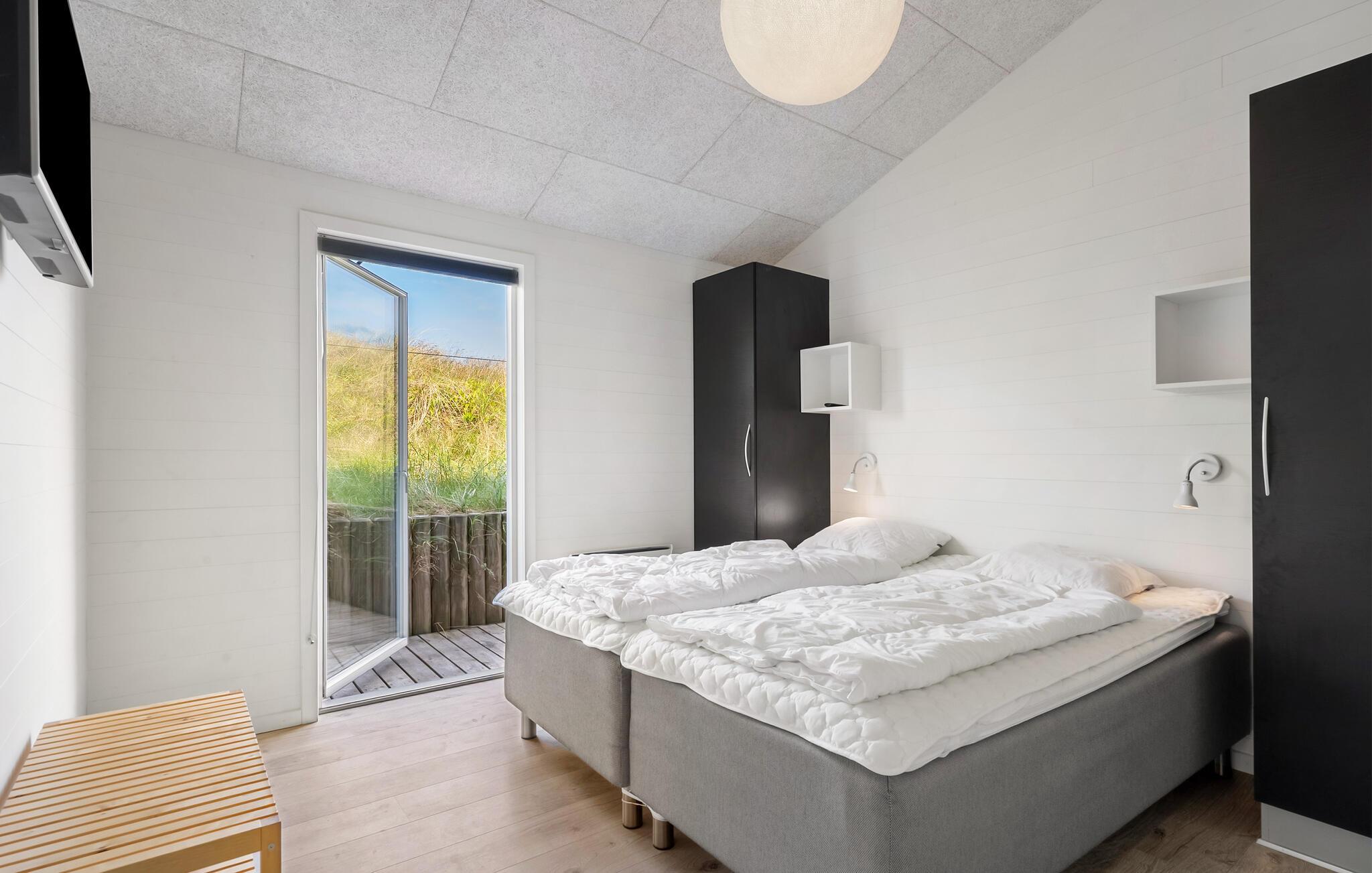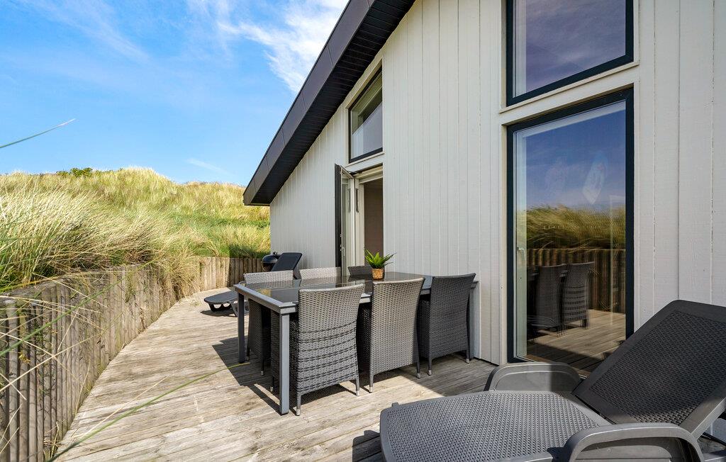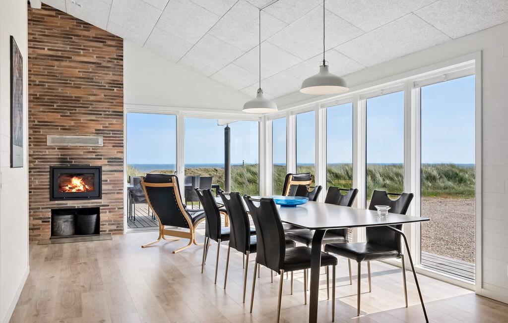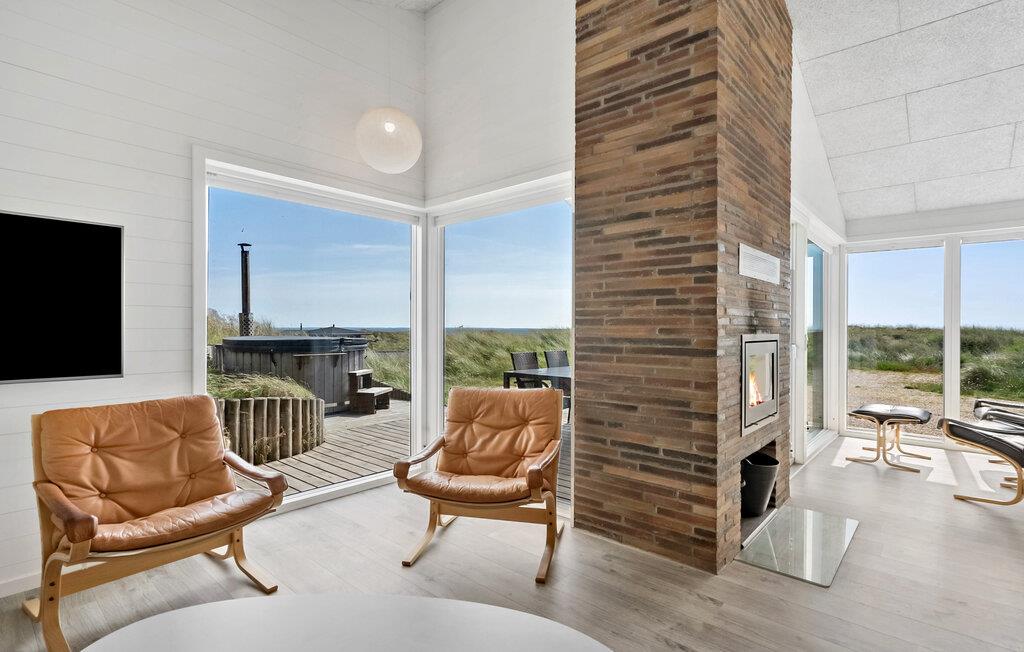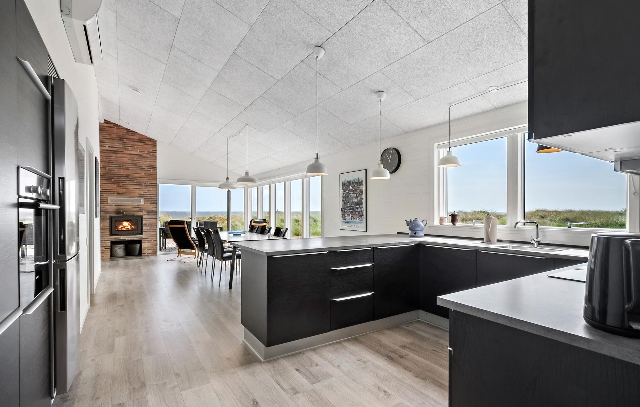 Nyd ferien i jeres feriehus, som takket være sin førsteklasses beliggenhed blandt klitterne giver jer uhindret udsigt helt ned til Vesterhavet. Huset kombinerer moderne bekvemmeligheder med en hyggelig atmosfære, der sørger det bedste betingelser for afslapning og hyggelige aktiviteter. Find jer til rette i den rummelige opholdsstue med brændeovn og store vinduer. Lad blikket vandre over landskabet, slap af i de komfortable sofaer eller læs en bog i en af ??lænestolene med udsigt. Den åbne spiseplads med masser af naturligt lys og udsigt over naturen er det optimale sted til fælles måltider. Tilbered lækre retter med havudsigt i det moderne, åbne køkken. Aktivitetsrummet med billardbord sørger for underholdning, mens saunaen lægger op til at slappe af.