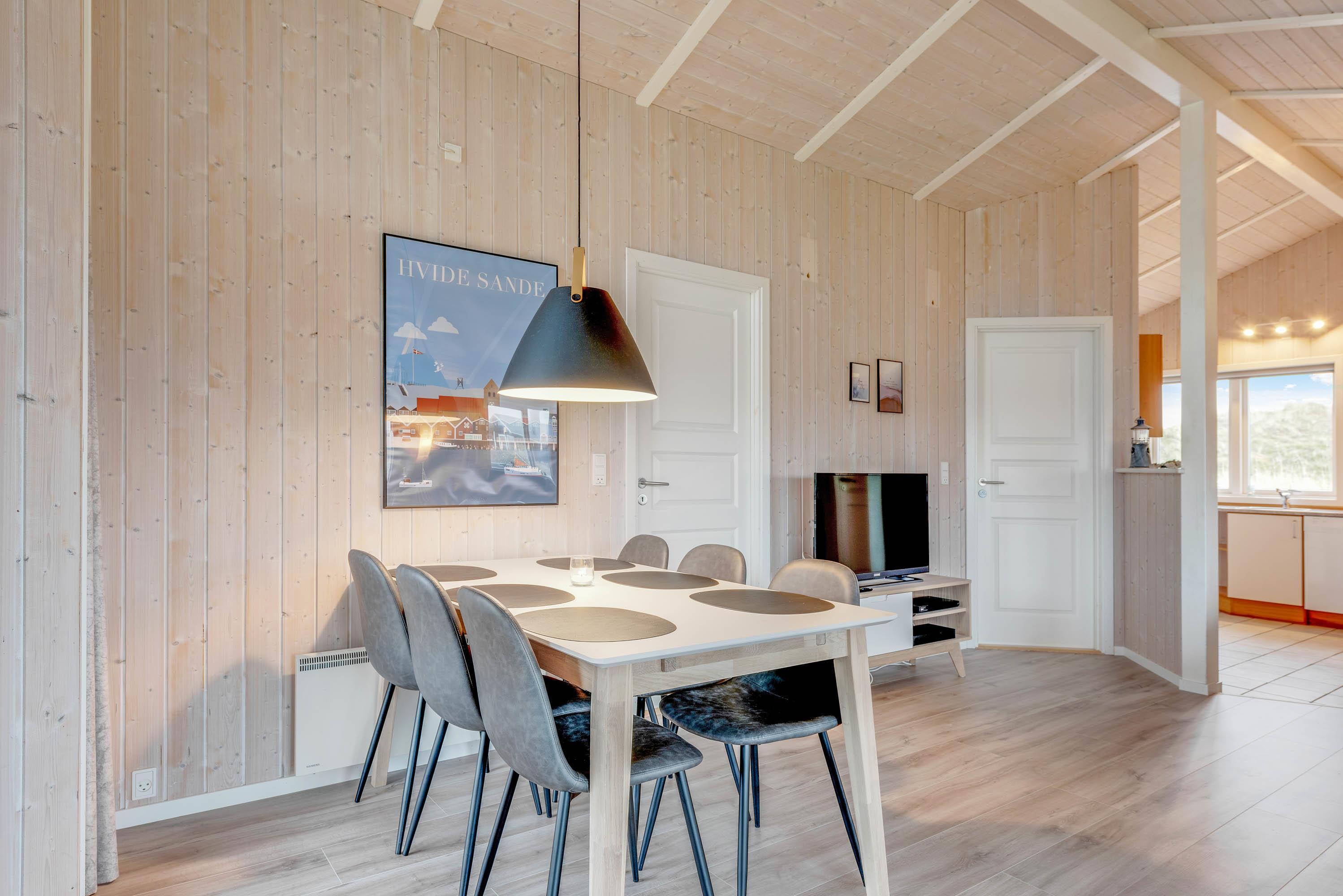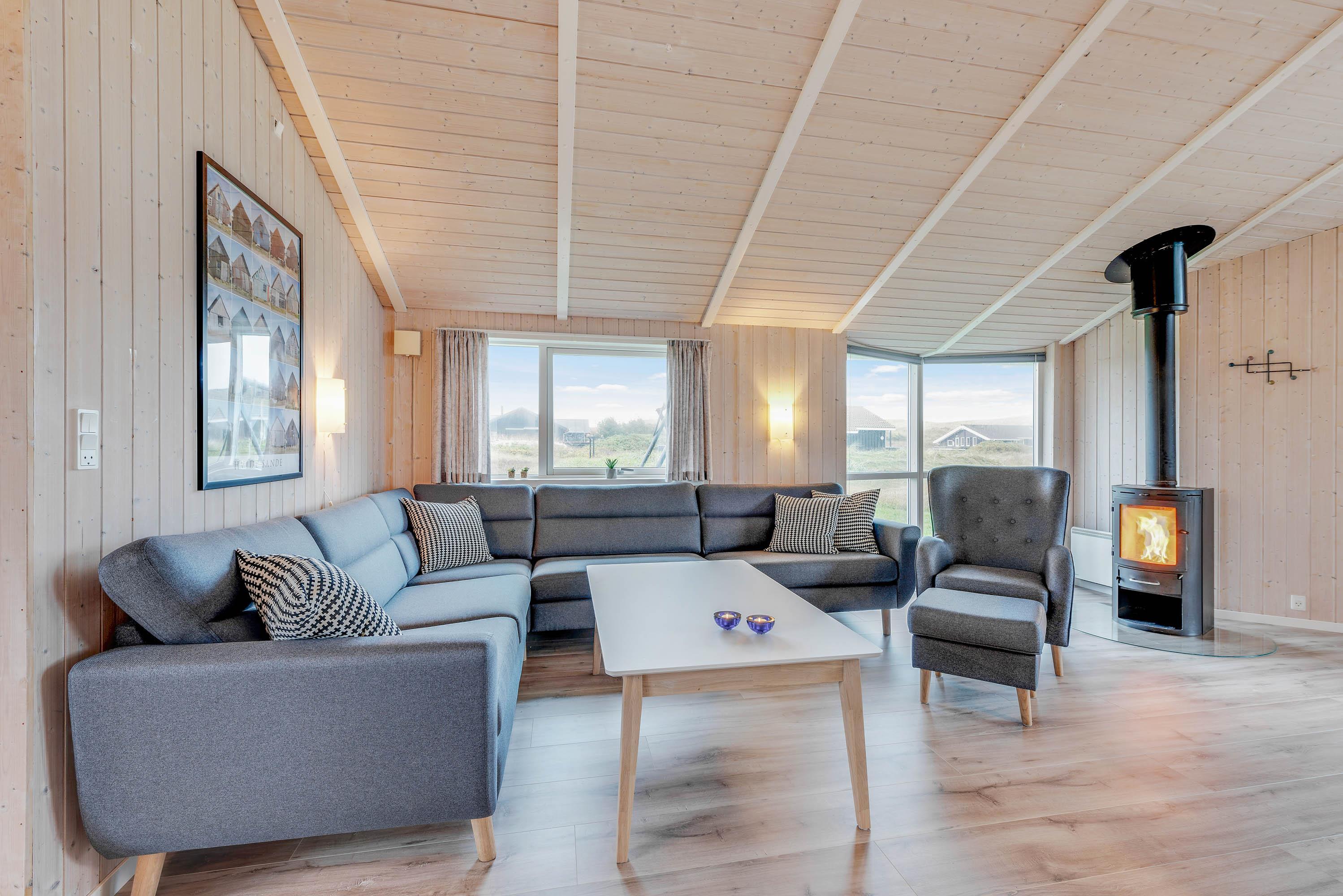 Fra du træder ind i sommerhuset, mærker du den hyggelige stemning, der kommer til udtryk gennem den smagfulde indretning. Med sine flotte gulve og lyse vægge og lofter fremstår huset som en helhed, og møblerne er fint afstemt til den gennemførte stil, der kendetegner hele feriehuset. Fra morgen til aften er det muligt at nyde udsigten til klitterne gennem de store vinduer i stuen, der også sørger for et flot lysindfald.
