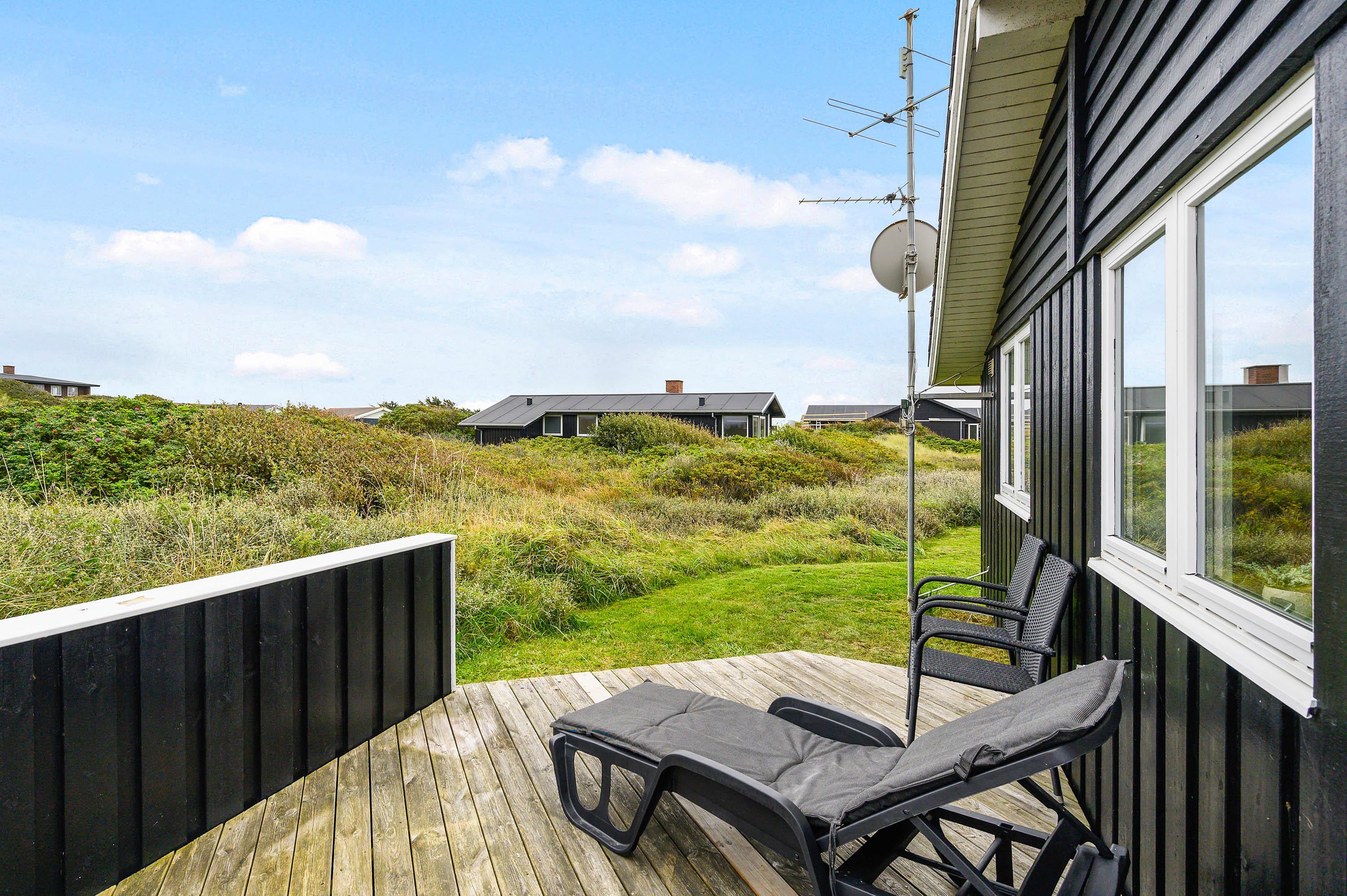 Fra sommerhuset er der udgang til hele to skønne terrasser - en, der er overdækket og afskærmet terrasse, og en, der er åben og afskærmet - hvor I kan tilbringe feriens dag- og aftentimer i ly for både sol, regn og vind. Fra terrasserne har I en skøn udsigt til de smukke klitter og den skønne natur i Årgab.