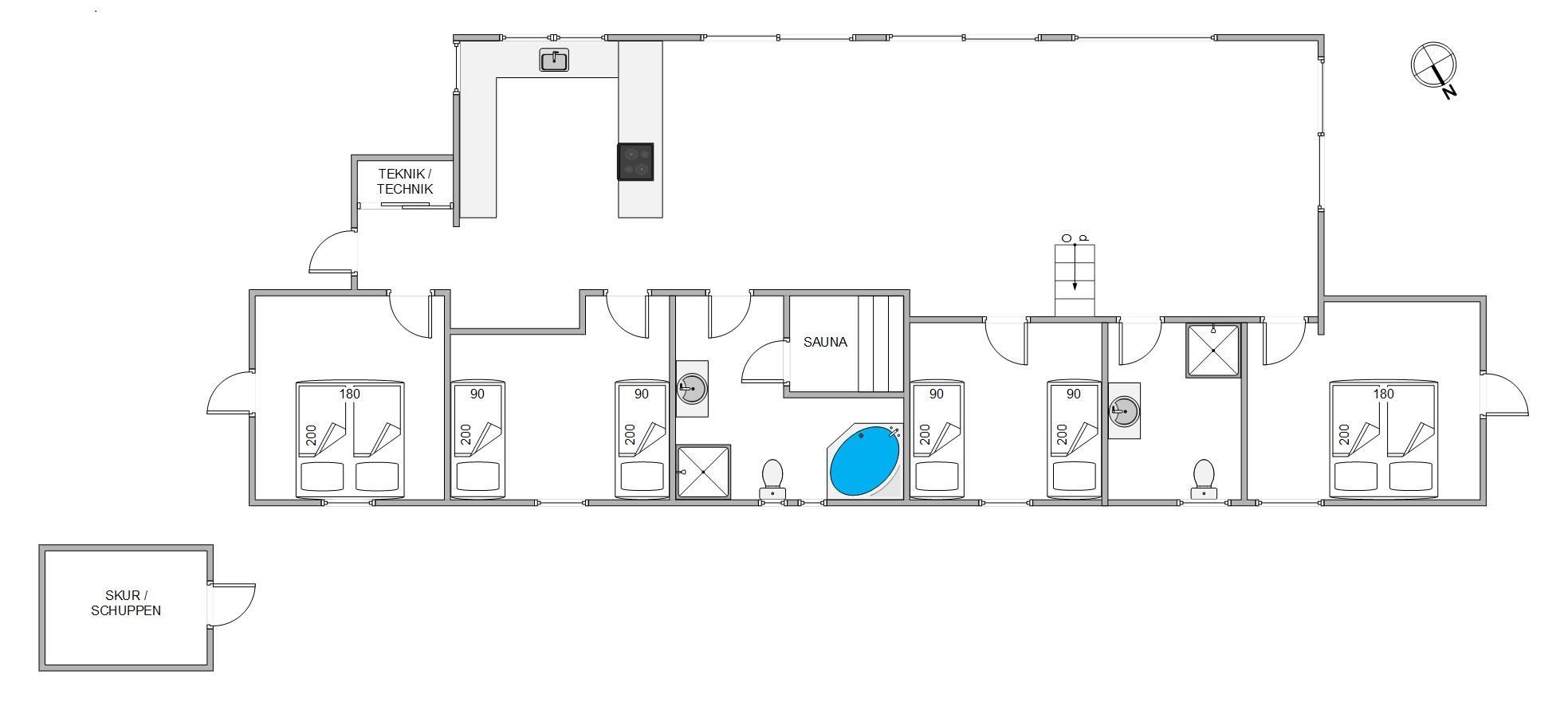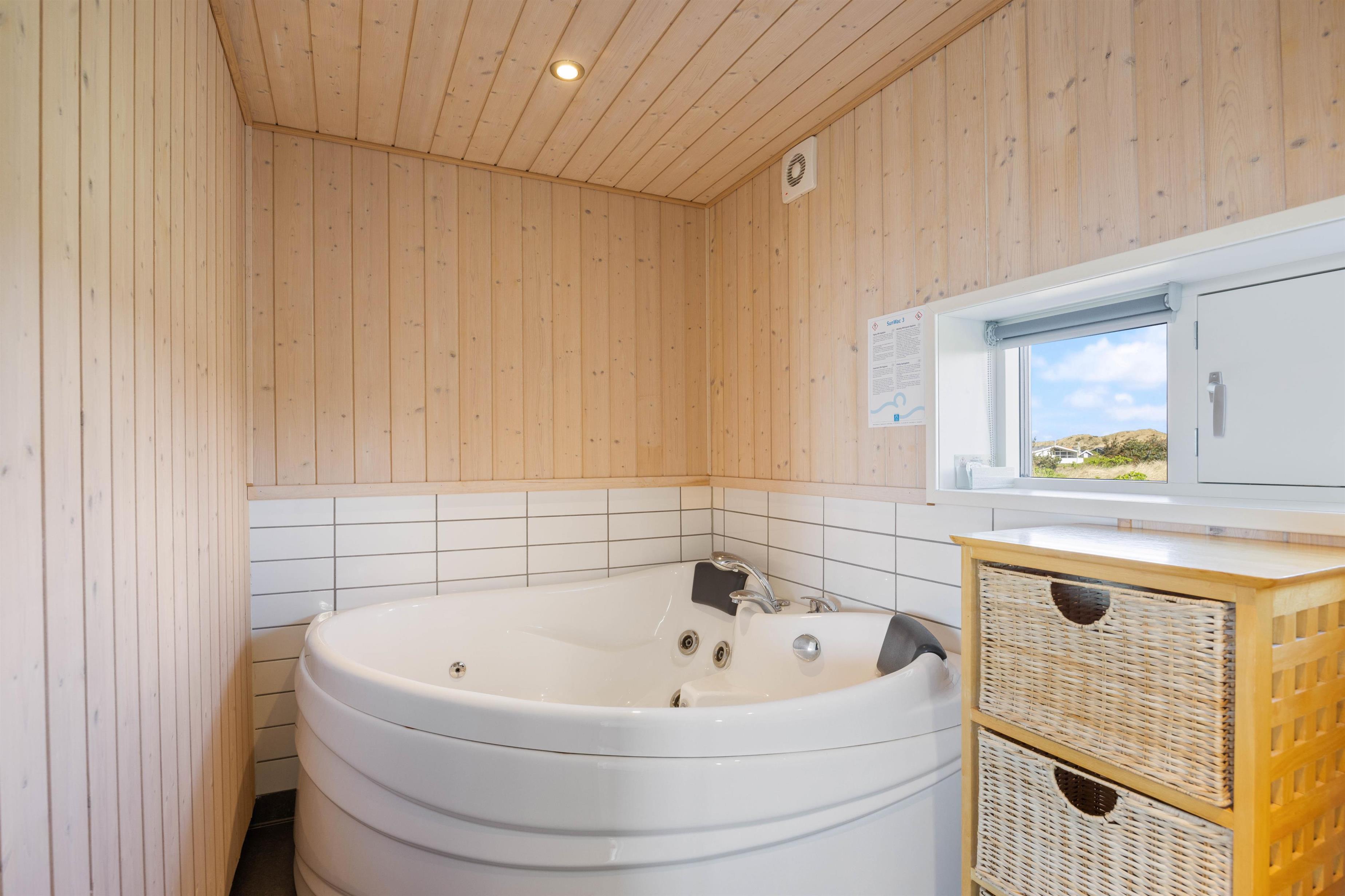 Derudover råder huset over 2 badeværelser, hvoraf det ene er udstyret med et spabad til to personer og en sauna. Her kan I nyde afslappende wellnessoplevelser og koble helt fra.
