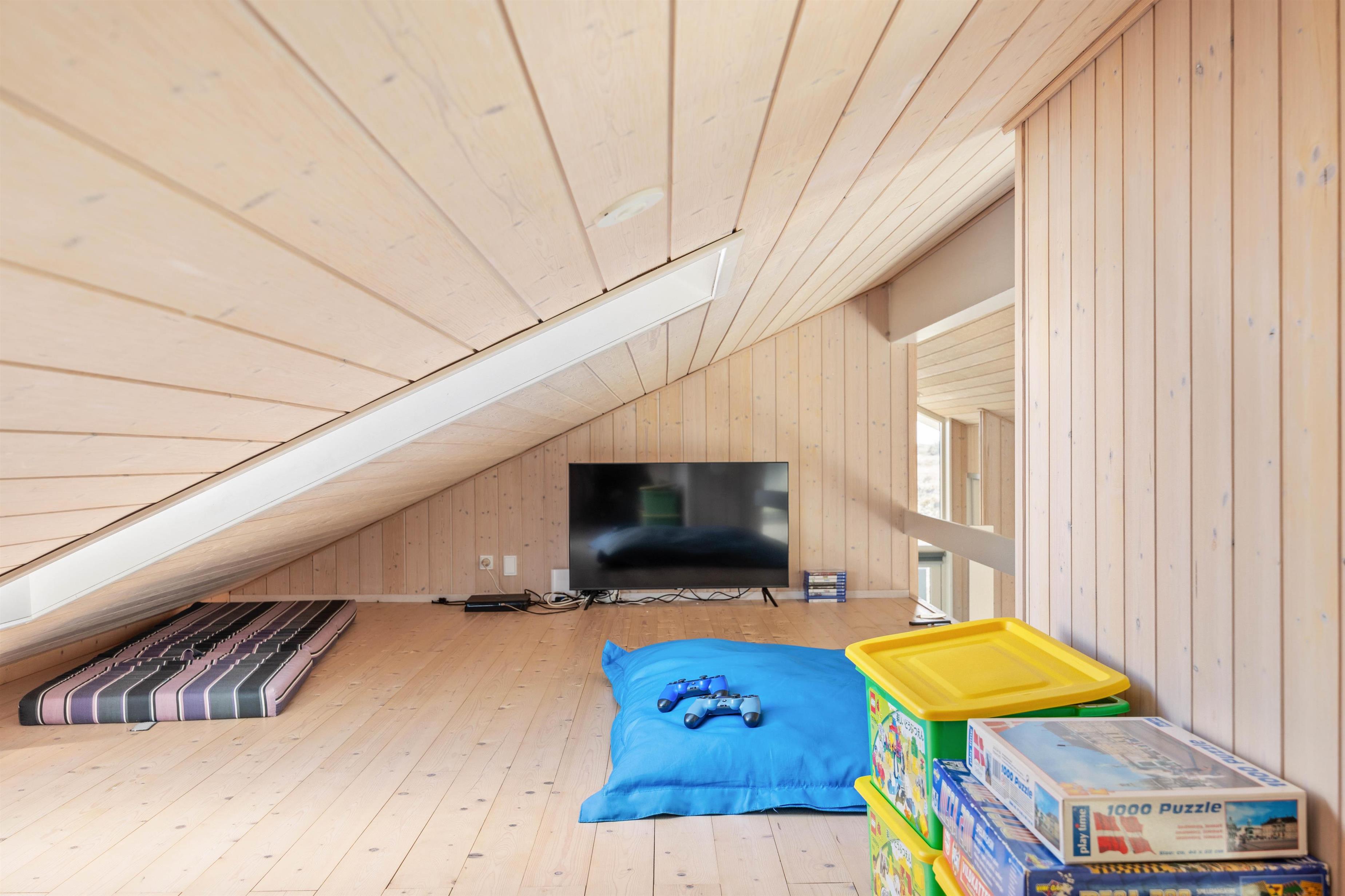 Fordelt på husets 120 kvadratmeter finder I et lyst køkken-alrum, med moderne køkken og et stort spisebord, så hele familien kan hygge sig om madlavningen sammen. Stueområdet med hjørnesofa er perfekt til at læse en god bog i, eller samles om en god film i fjernsynet. Til familiens børn og teenagere, er hemsen ideel. Her kan de få lov til at trække sig tilbage uden forstyrrelser fra de voksne.