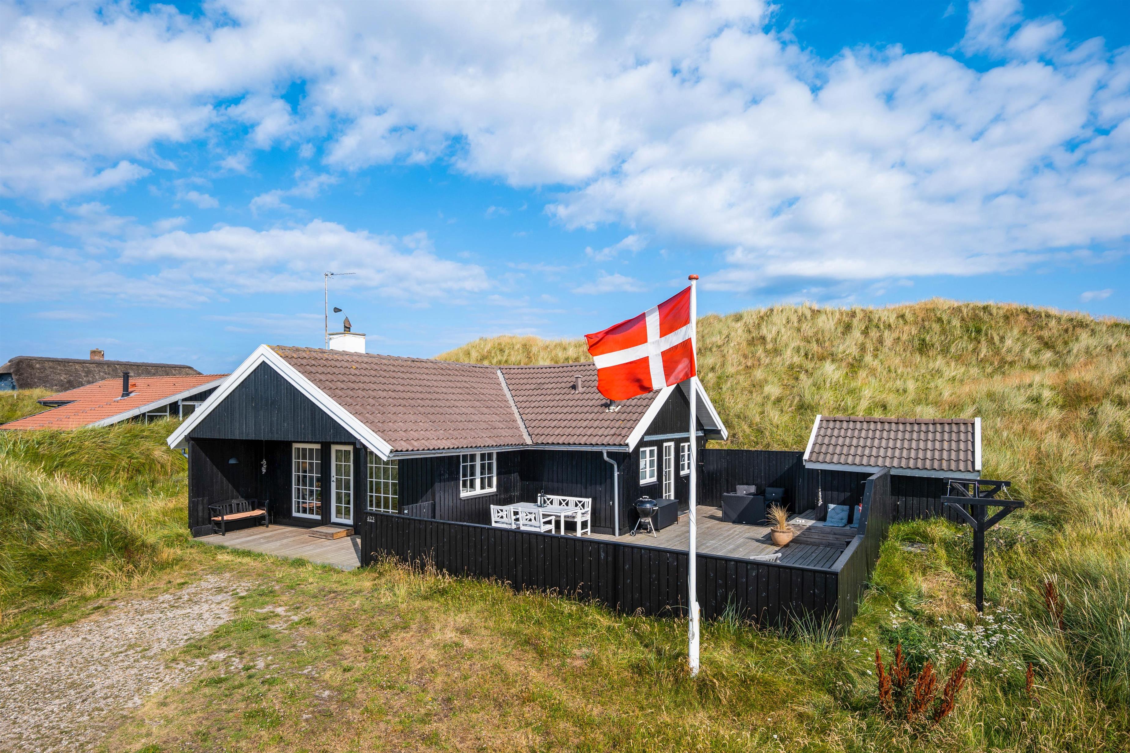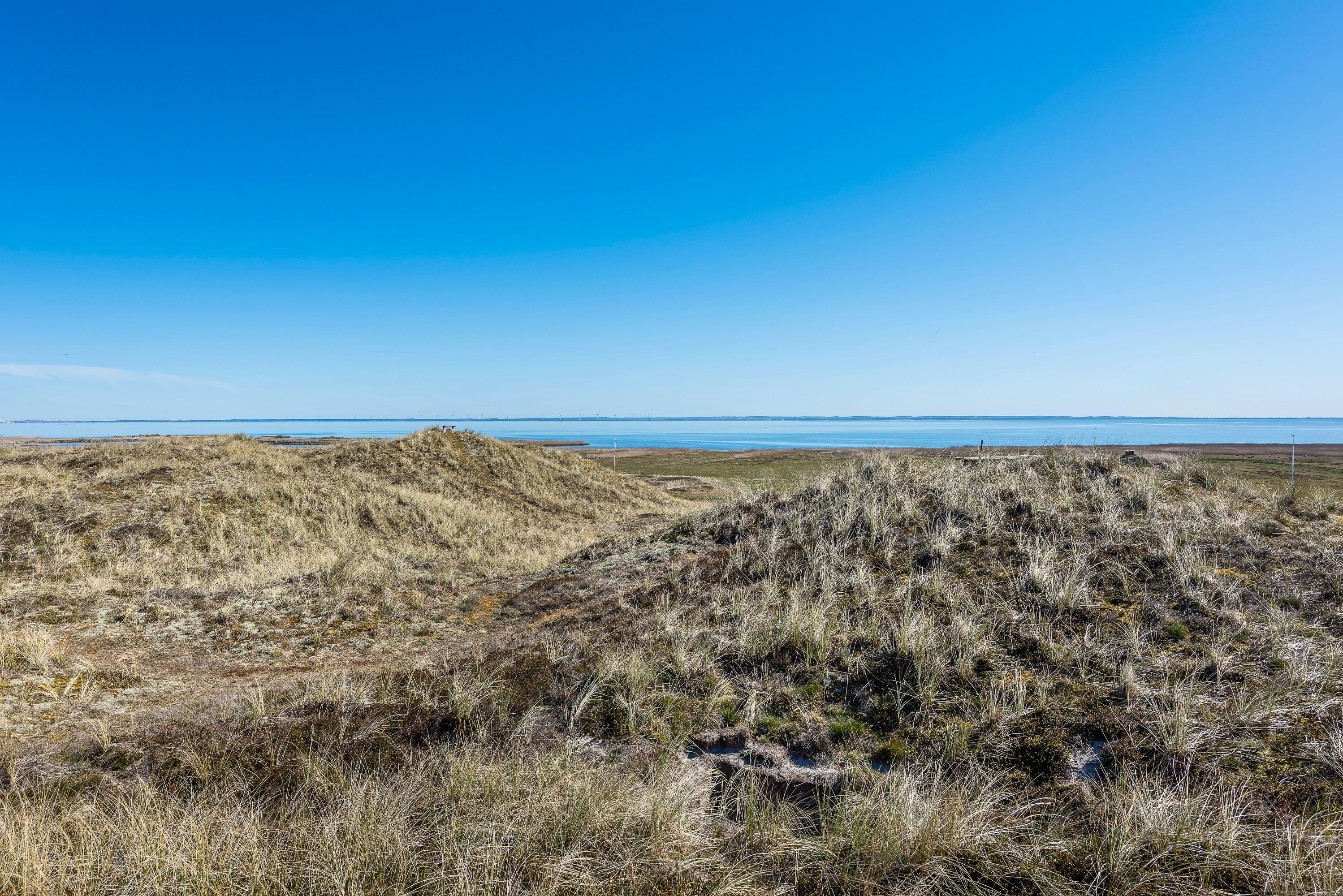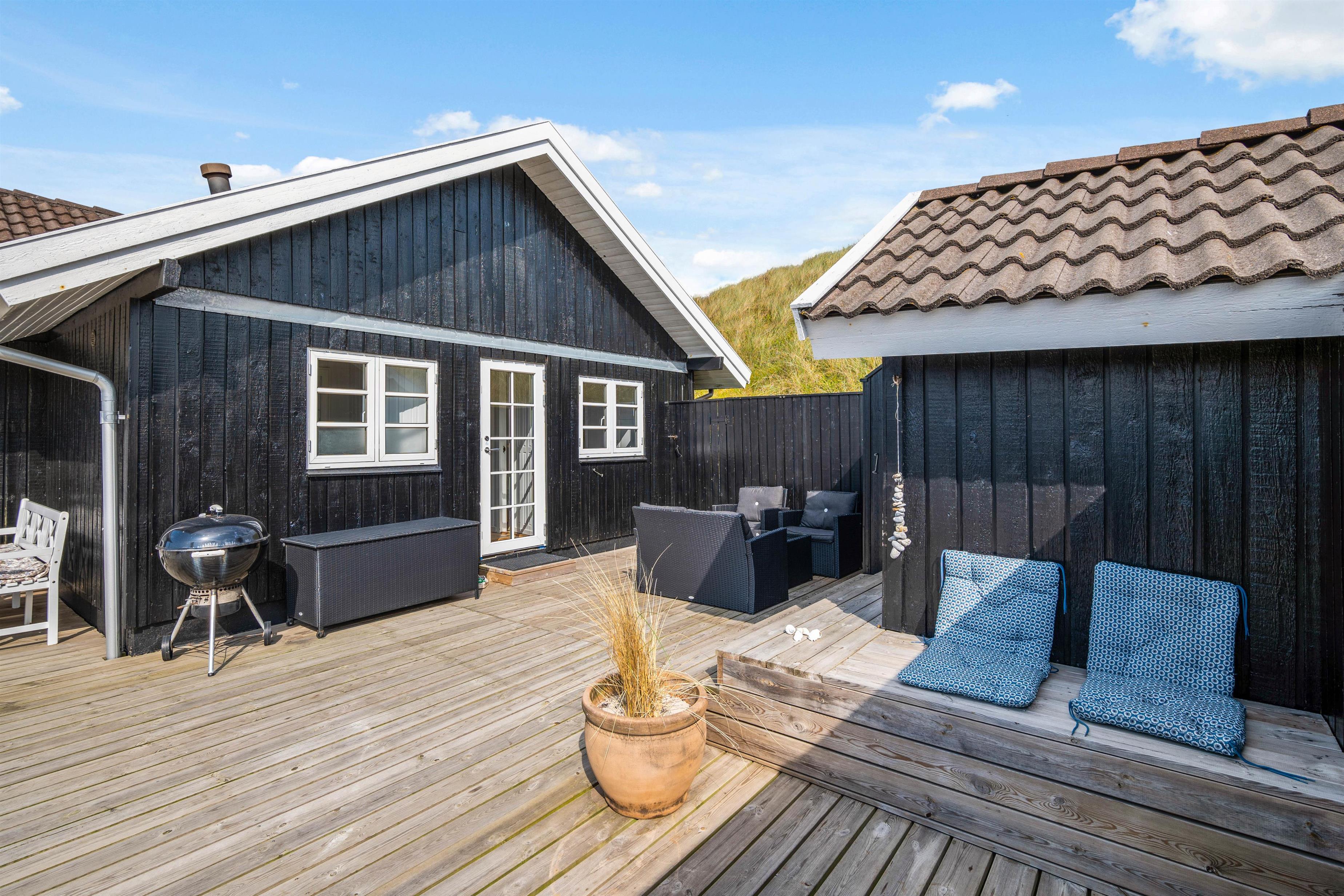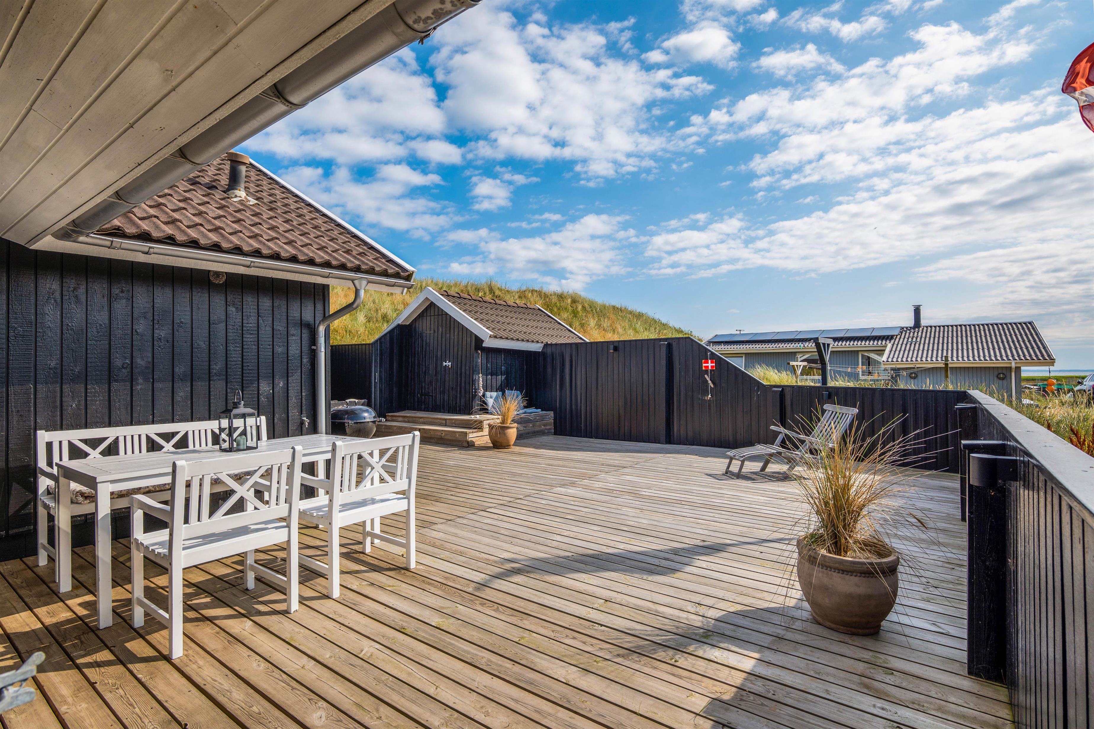 Det hyggelige sommerhus har en helt fantastisk beliggenhed på en forhøjning i klitlandskabet, og rundt om huset går en stor, lækker træterrasse, som giver jer rig mulighed for at slappe af i solen og nyde den fantastiske panoramaudsigt hele vejen til fjorden.