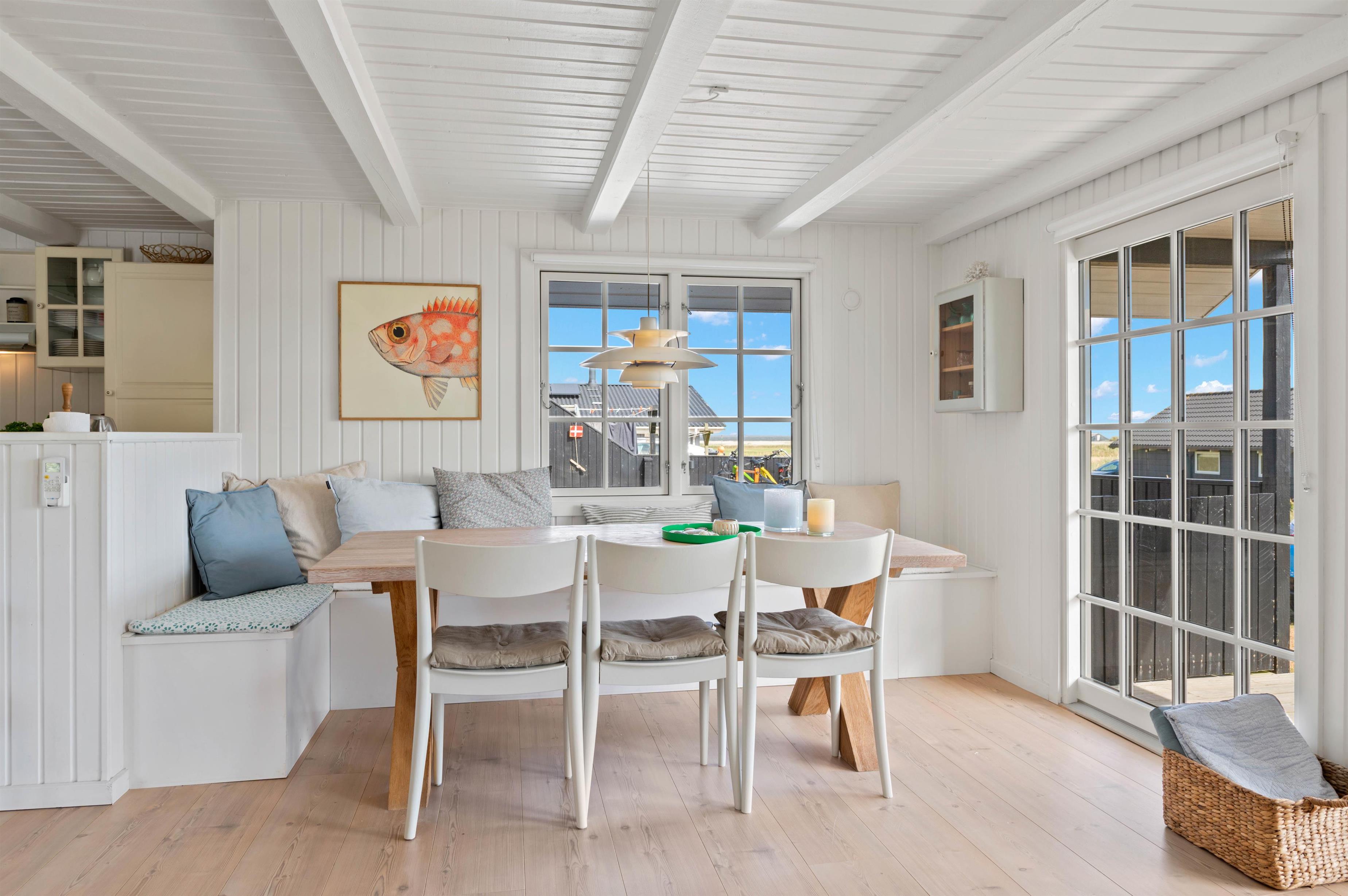 Sommerhusets hjerte er det åbne opholdsrum, hvor stue og køkken er slået sammen. Der er masser af små kroge, hvor I kan nyde feriefreden med en god bog og en varm kop kaffe, og den klassiske brændeovn sørger for at sprede hyggelig feriestemning med sine knitrende flammer.