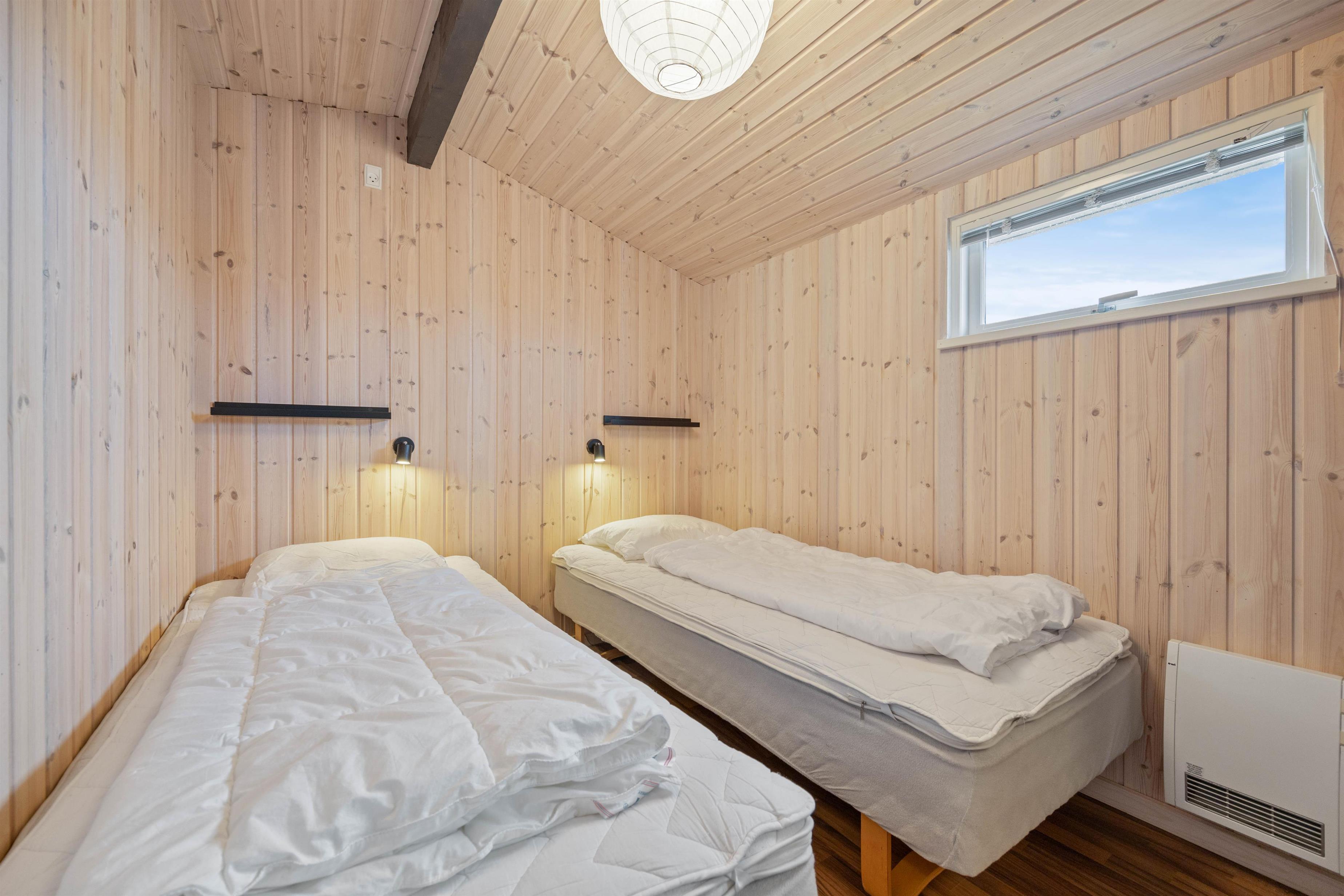 Går I ind i sommerhuset, bliver I mødt af en harmonisk indretning med rolige og neutrale farvenuancer. Sommerhuset er i ægte sommerhusstil med trævægge og frie bjælker i loftet, mens de store vinduer sørger for at trække naturen med helt ind stuen. I sommerhusets stue er der lagt op til hygge, og her kan I bestemt få mange timer til at gå med en god film eller brætspil. Derudover findes der 3 soverum, 1 badeværelse og 1 gæstetoilet i sommerhuset. Det første værelse er med dobbeltseng, det andet værelse er med 2 enkeltsenge og det sidste med køjesenge – her vil de yngste helt sikkert elske at sove.