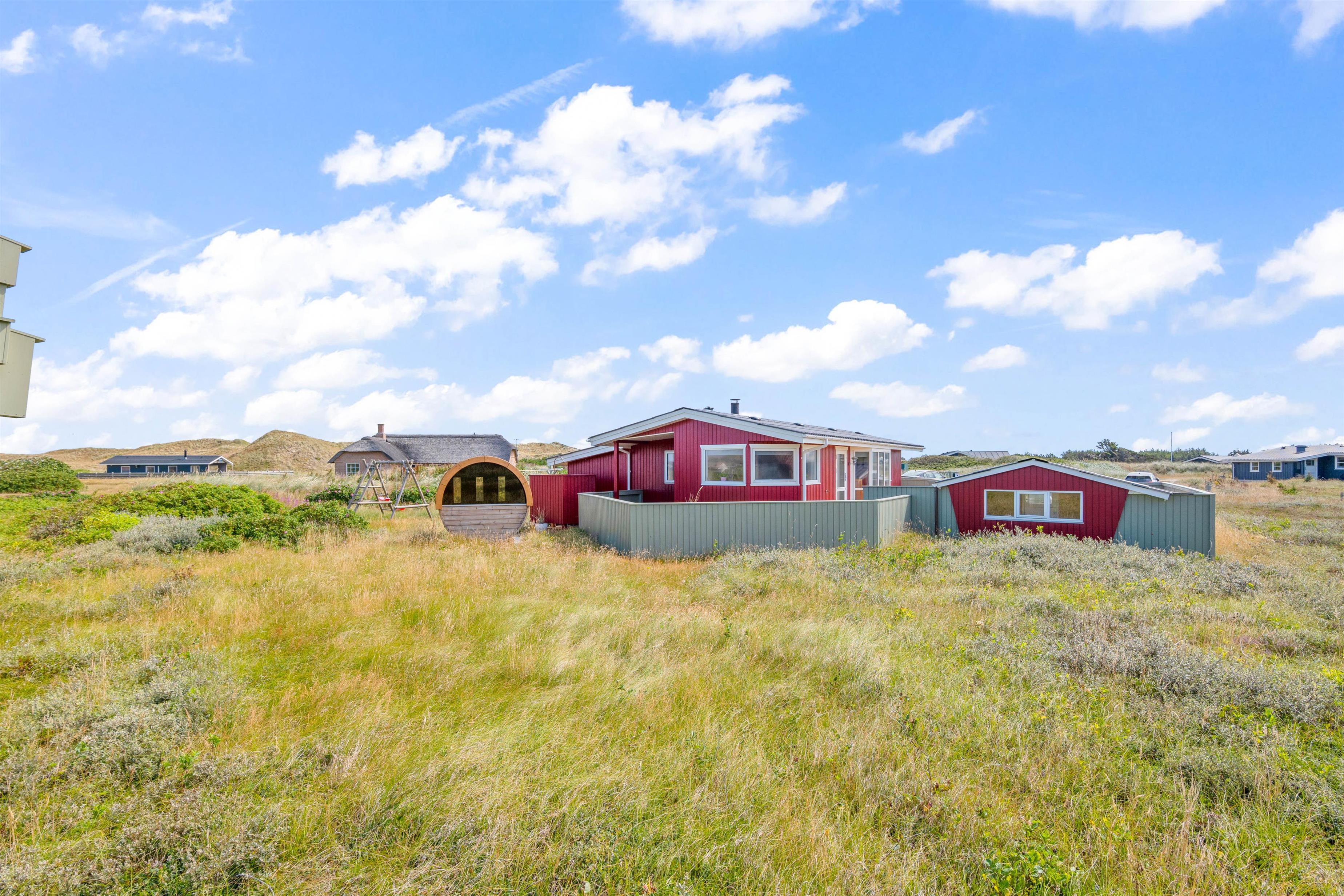 Mød det charmerende røde sommerhus fra 1966 på Tingodden 102 i Årgab. Her finder du en skøn beliggenhed, blot 250 meter fra Vesterhavet med de skønne sandstrande. Sommerhuset ligger i et roligt område omringet af naturen, men stadig kun en kort tur fra byer med liv og glade feriegæster. Sommerhuset er til jeres familie på 6 personer, og som en bonus er der en udendørs sauna.