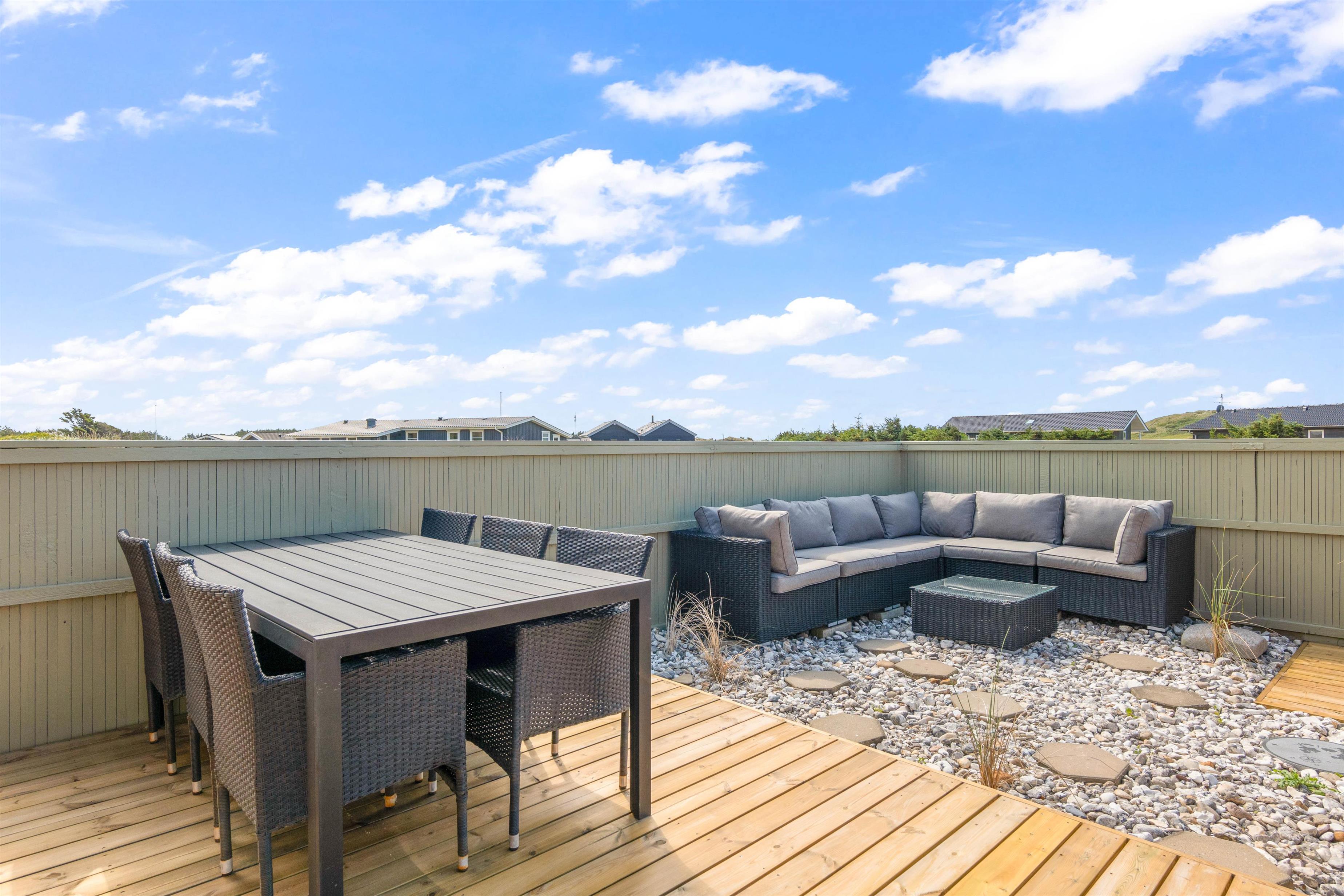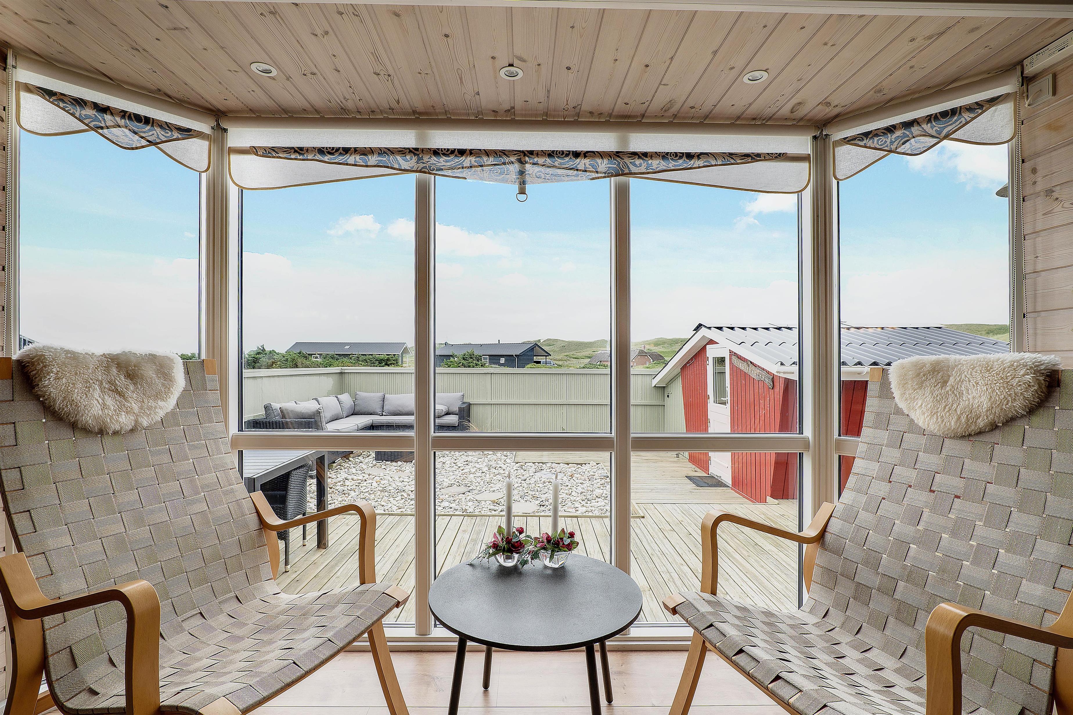 Til dette sommerhus hører en rigtig dejlig og rummelige terrasse til, som desuden også er lukket. Her kan I sidde helt ugeneret og nyde den friske luft og den karakteristiske natur. Sæt dig godt til rette i sommerhusets komfortable havemøbler, mens du nyder skyggen under parasolen, med lyden af bølgerne i baggrunden. Sommerhuset ligger blot 250 meter fra vandet, og derfor kan havet høres fra sommerhuset.